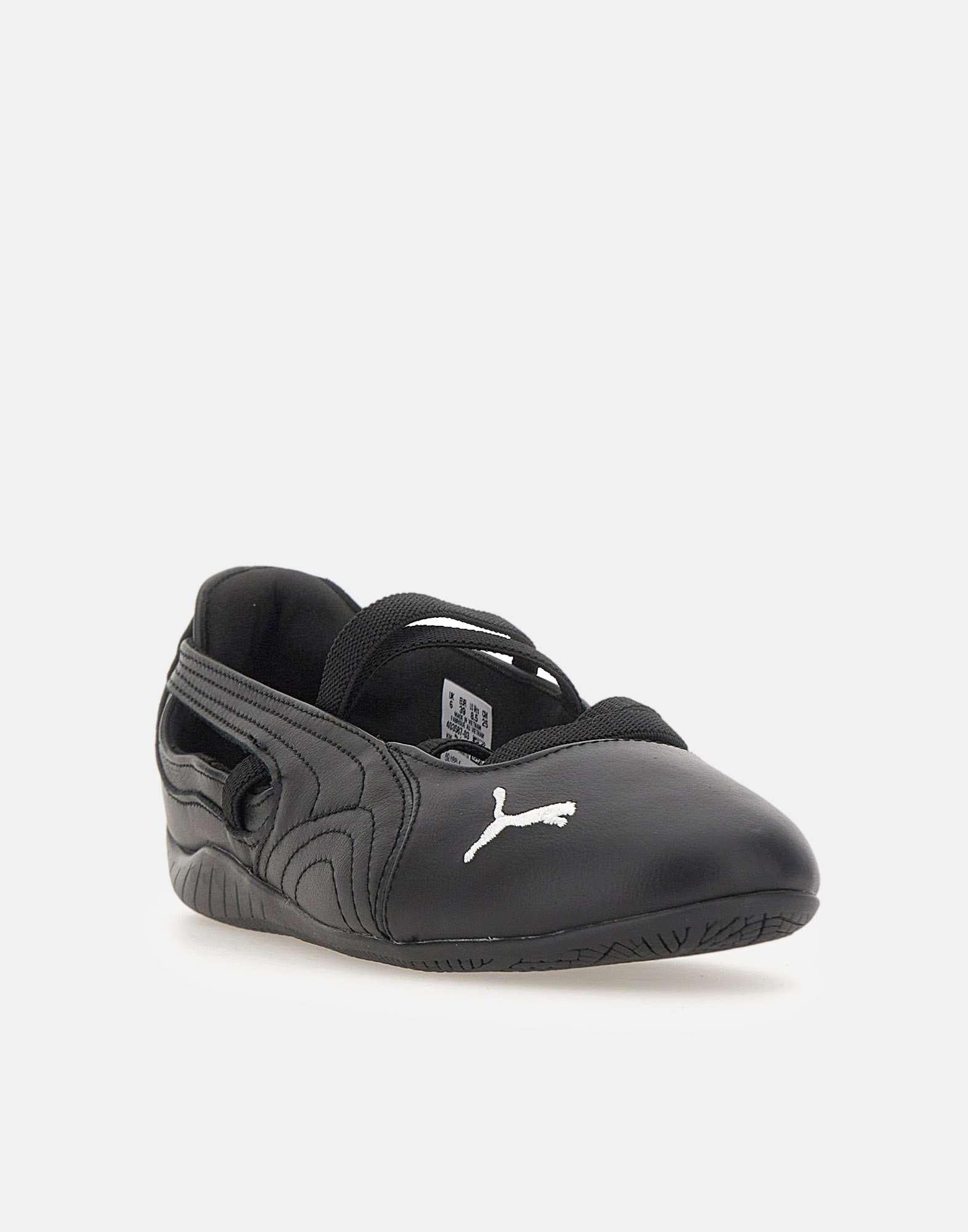 Puma "Speedcat Ballet" donna, sneaker total black che fonde l'eleganza delle scarpe da ballo con lo spirito racing di Formula1. Caratterizzata da tomaia in pelle, logo PUMA Cat ricamato e fasce elastiche per una calzata aderente e confortevole. La tecnologia Ortholite e la suola in gomma assicurano supporto e ammortizzazione, mentre la calzata regolare rende questa scarpa versatile per ogni occasione. Taglia UK 6 = EU/IT 39.