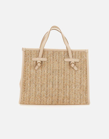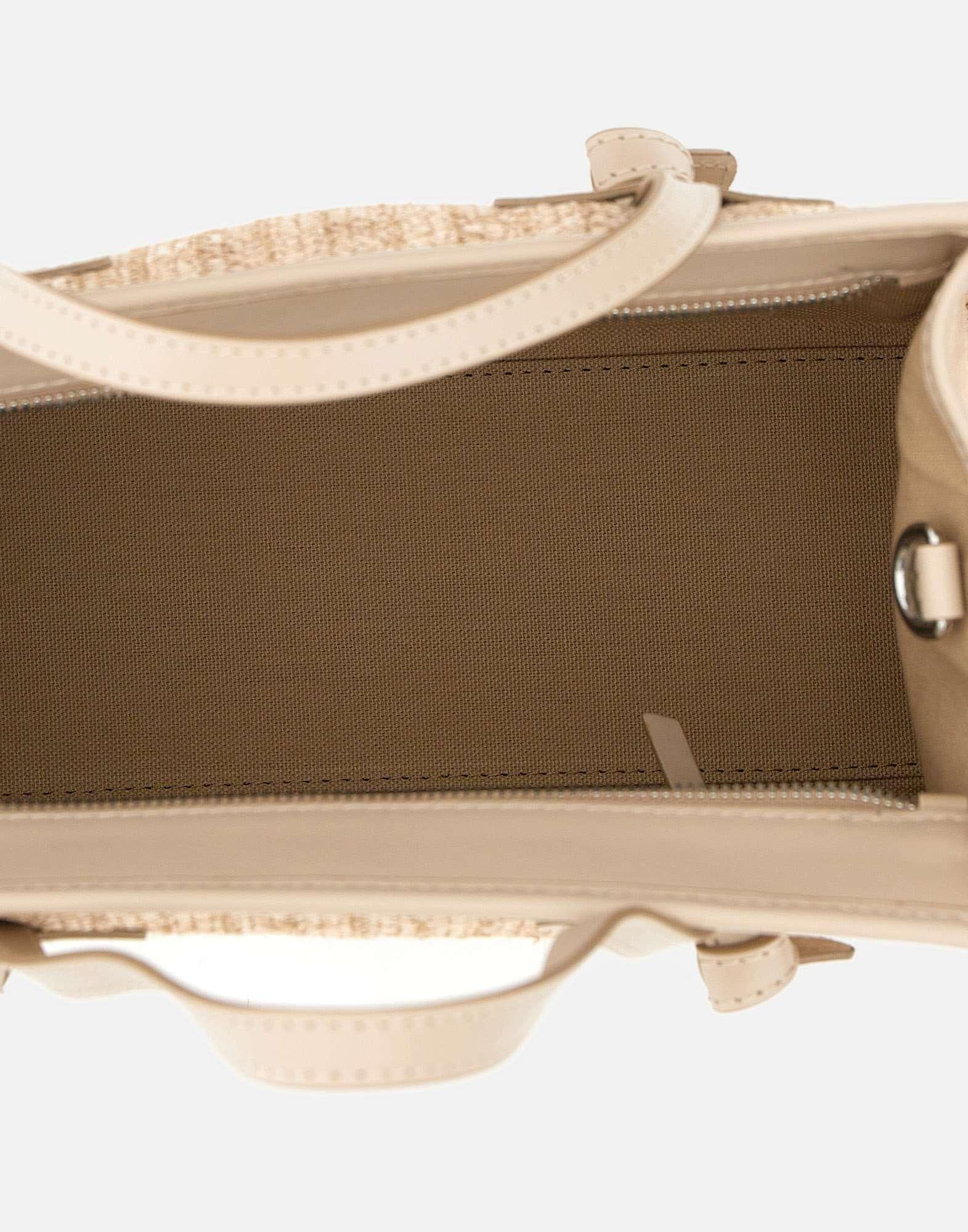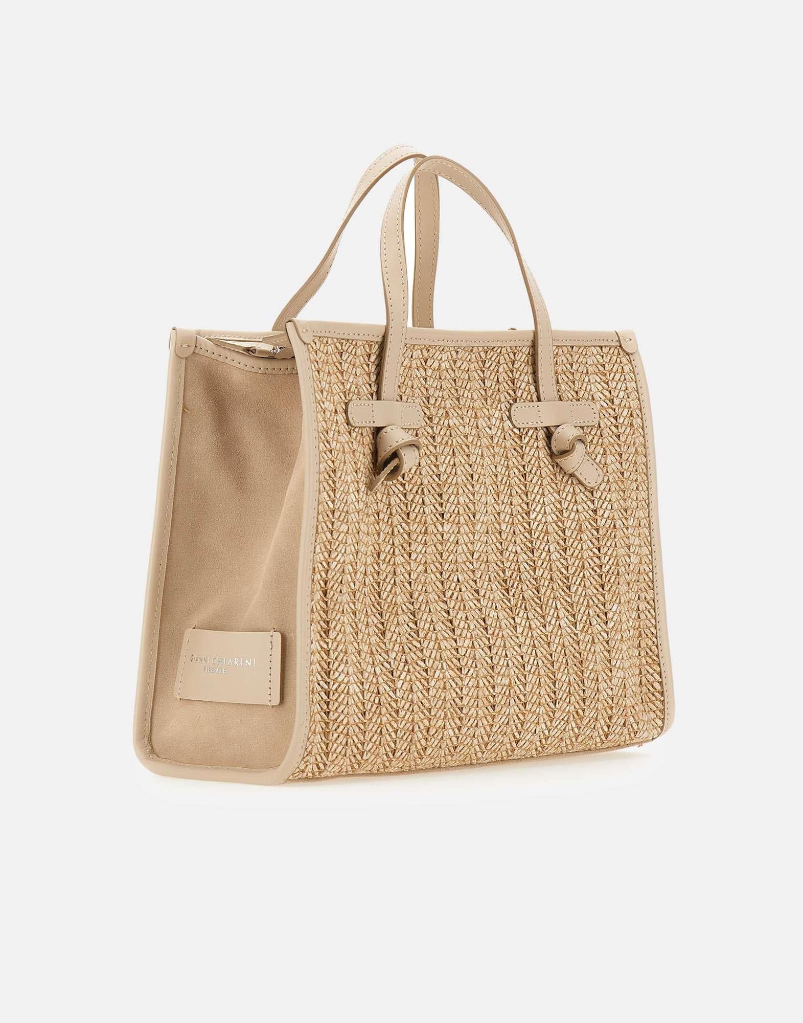 Borsa a mano donna Marcella Club Gianni Chiarini "MissMarcella 32" realizzata in paglia intrecciata color sabbia, con lati e base in pelle scamosciata e dettagli in pelle liscia coordinati. Presenta chiusura superiore con zip, due manici per portarla a mano e tracolla in pelle regolabile e removibile per indossarla a tracolla. Sul lato è applicato un patch logo in pelle, mentre l'interno è organizzato con due tasche applicate e una tasca con zip. Include dust bag. Made in Italy. Dimensioni: 32x25x11 cm.