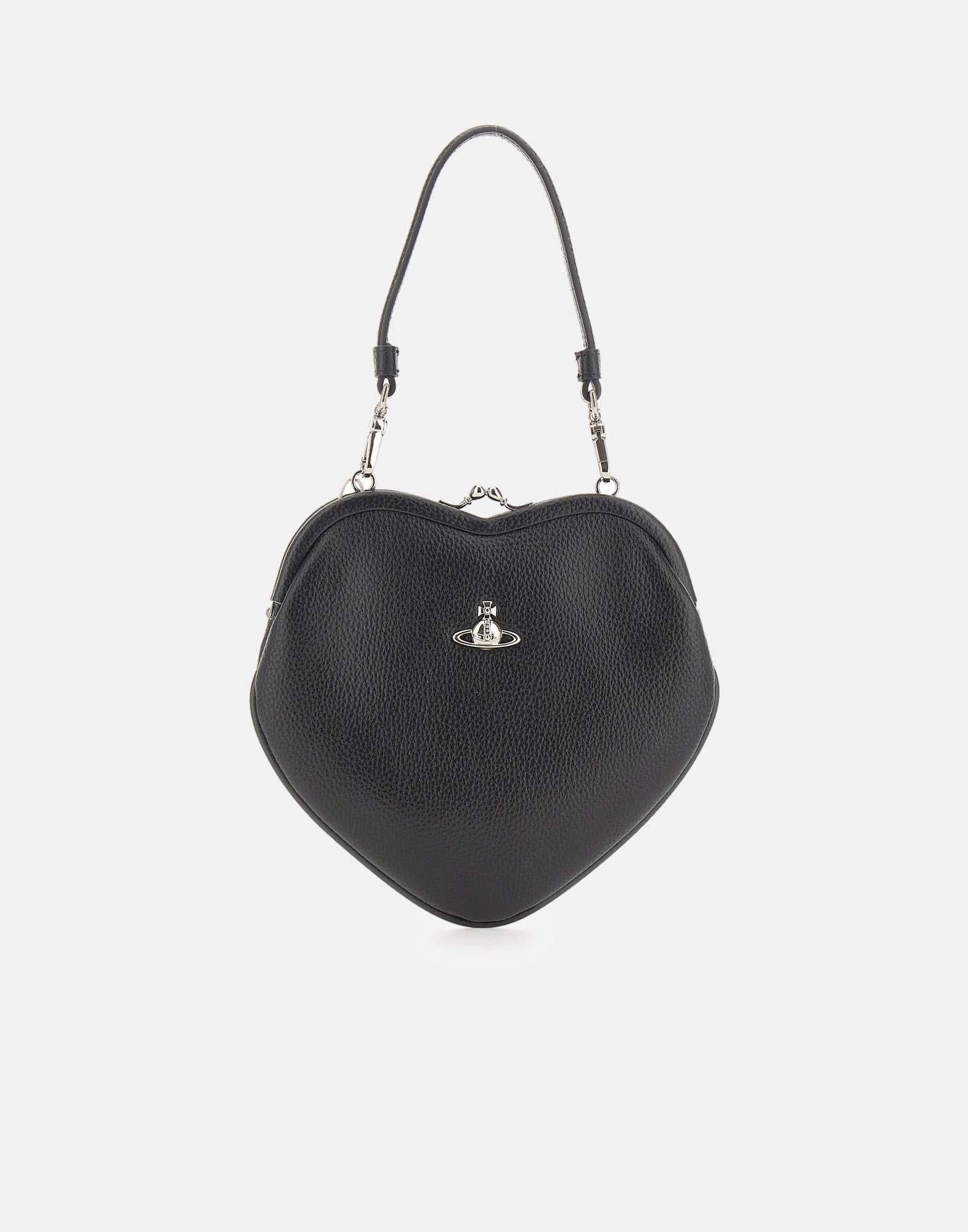 Borsa a spalla donna Vivienne Westwood "Belle Heart Frame" color nero con effetto martellato e iconica forma a cuore, elemento distintivo della Maison. Il modello presenta Orb in metallo silver in rilievo sulla parte frontale e offre più opzioni di portabilità grazie a tracolla a catena e manico nero entrambi removibili. La chiusura clic-clac definisce il design con un tocco classico e riconoscibile, mentre l'interno foderato assicura una finitura curata. Dimensioni 20x20x4 cm, ideale per completare look serali o outfit contemporanei con un dettaglio signature.