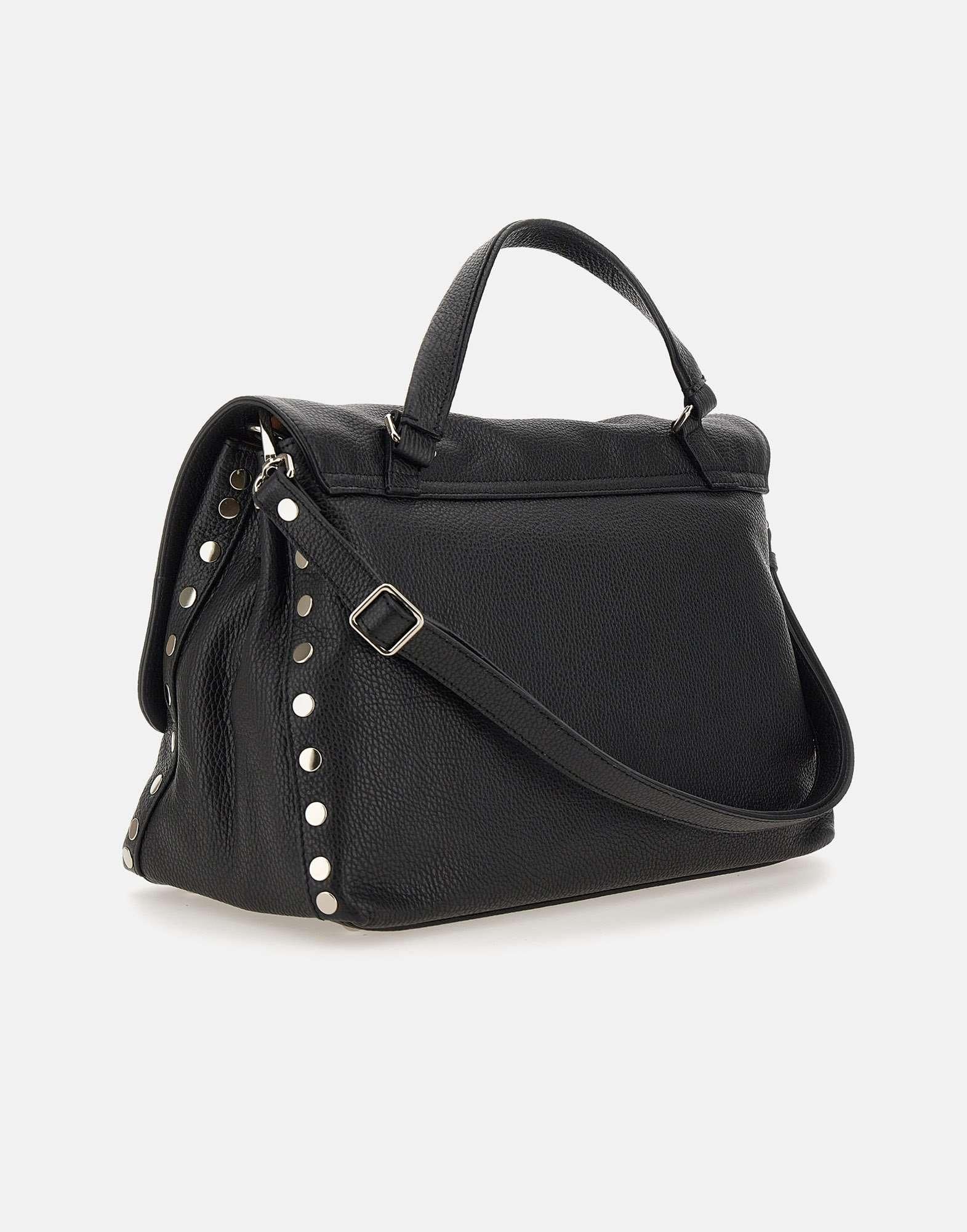 Borsa a mano donna Zanellato "Postina Daily M" in pelle martellata nera, simbolo di eleganza contemporanea e artigianalità Made in Italy. Presenta chiusura con patta e meccanismo a girella, manico singolo e doppia tracolla regolabile e removibile: una in pelle e una in tessuto. Linterno, foderato a contrasto color cammello, include due scomparti aperti, due tasche piatte e una tasca con zip. Rifinita con dettagli metallici silver, piedini protettivi e borchiette laterali decorative. Dimensioni: 36 x 23 x 18 cm; tracolla 106 cm.