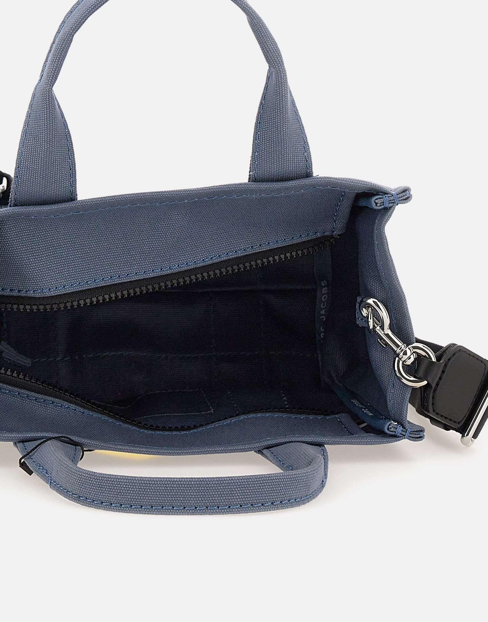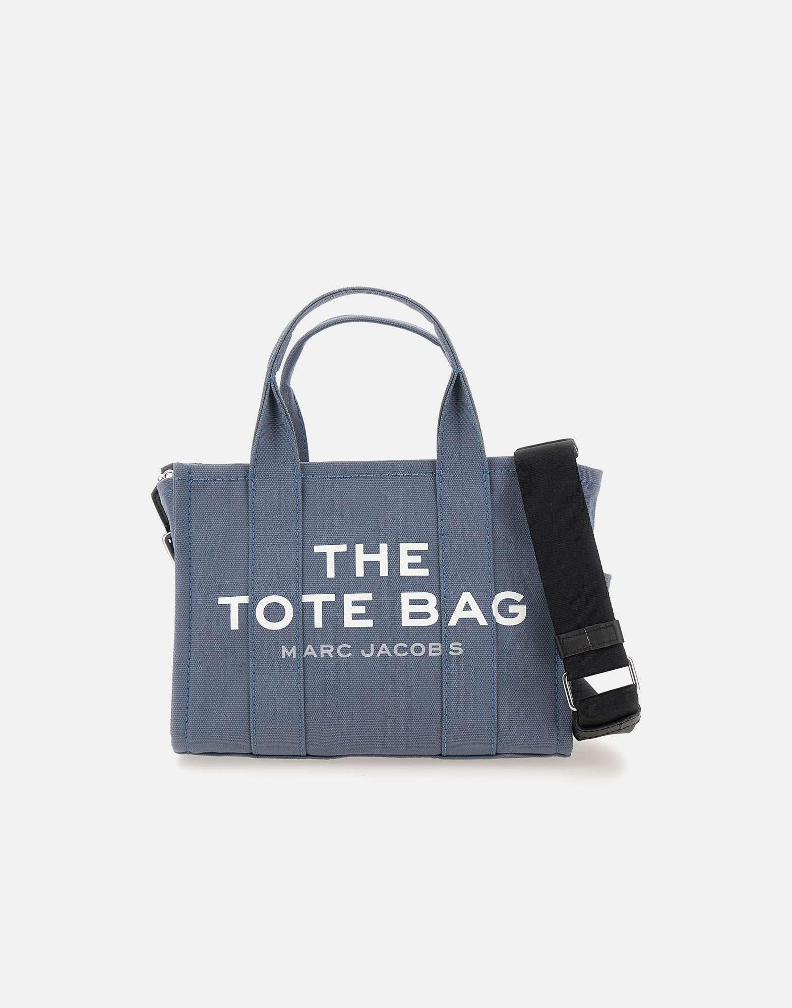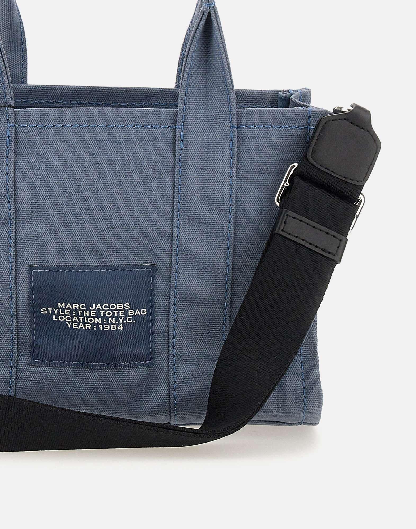 Borsa Marc Jacobs in tela "The Small Tote", colore carta da zucchero, tracolla regolabile e rimovibile nera a contrasto, doppio manico superiore, finiture metalliche argento, logo bianco su fronte e retro, chiusura centrale con zip, scomparto singolo.