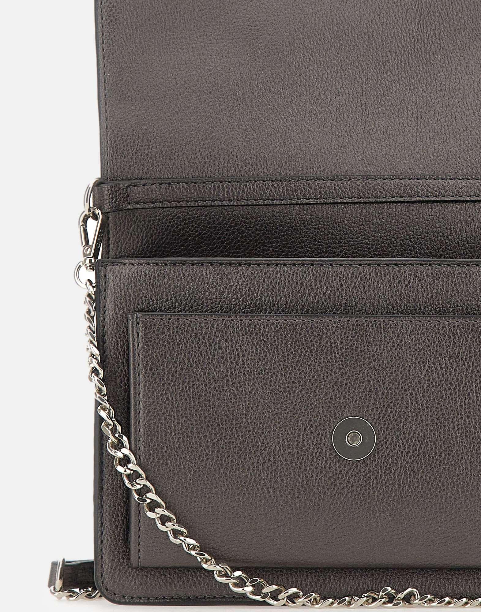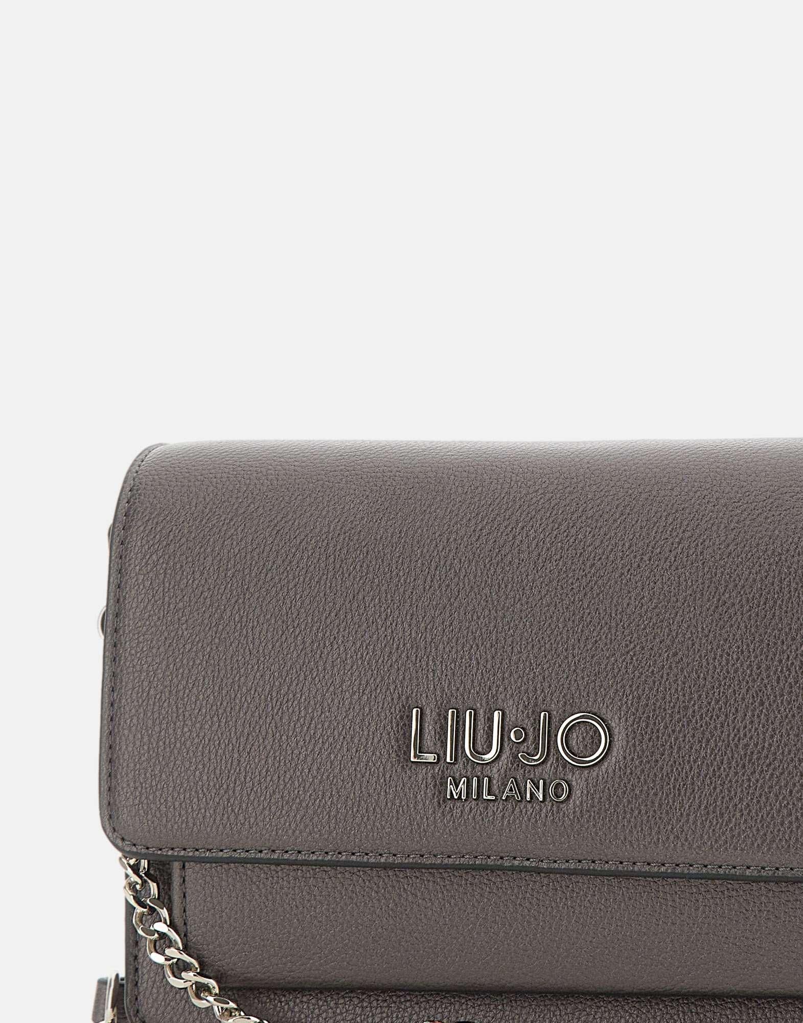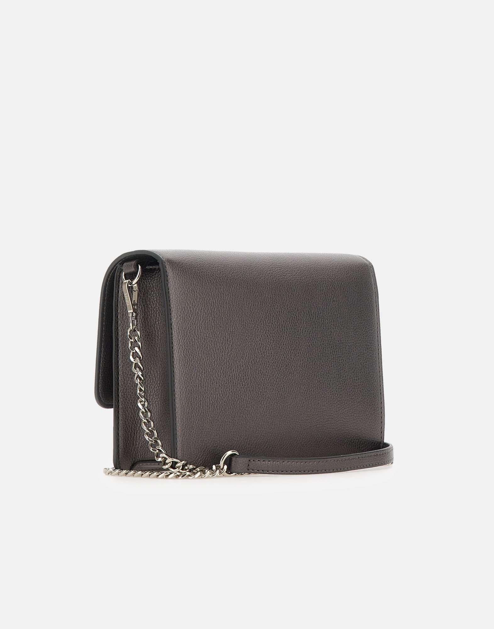 Borsa a tracolla "Caliwen" Liu-Jo in ecopelle effetto bottalato color grigio antracite, elegante e versatile. Presenta logo in metallo frontale, chiusura con patta e bottone magnetico, tracolla removibile con catena per un tocco raffinato. L'interno è organizzato in due scomparti con fodera e etichetta logata. Appartenente alla linea "Liu Jo Better", realizzata con materiali sostenibili. Dust bag inclusa. Misure: 22x9x16 cm.