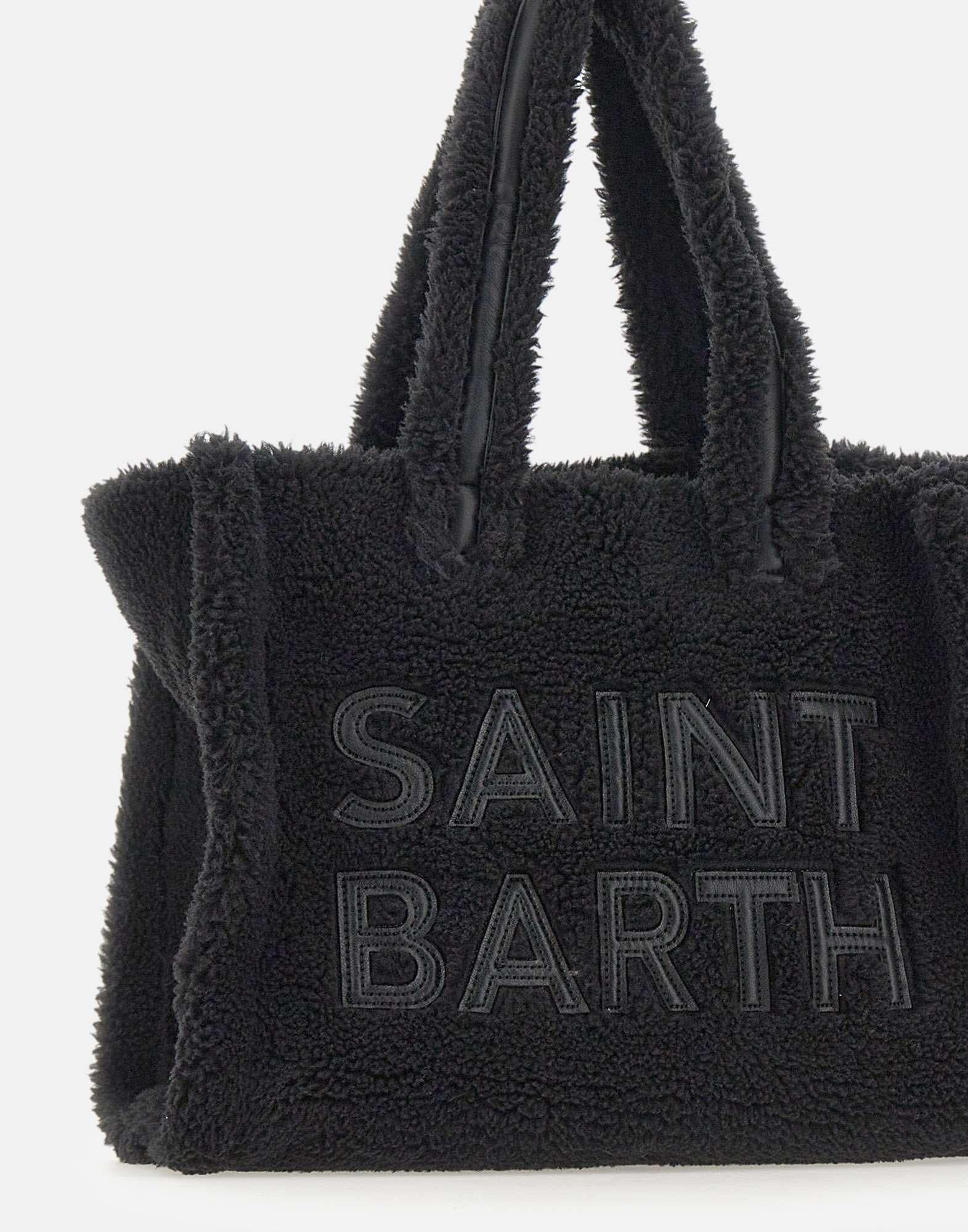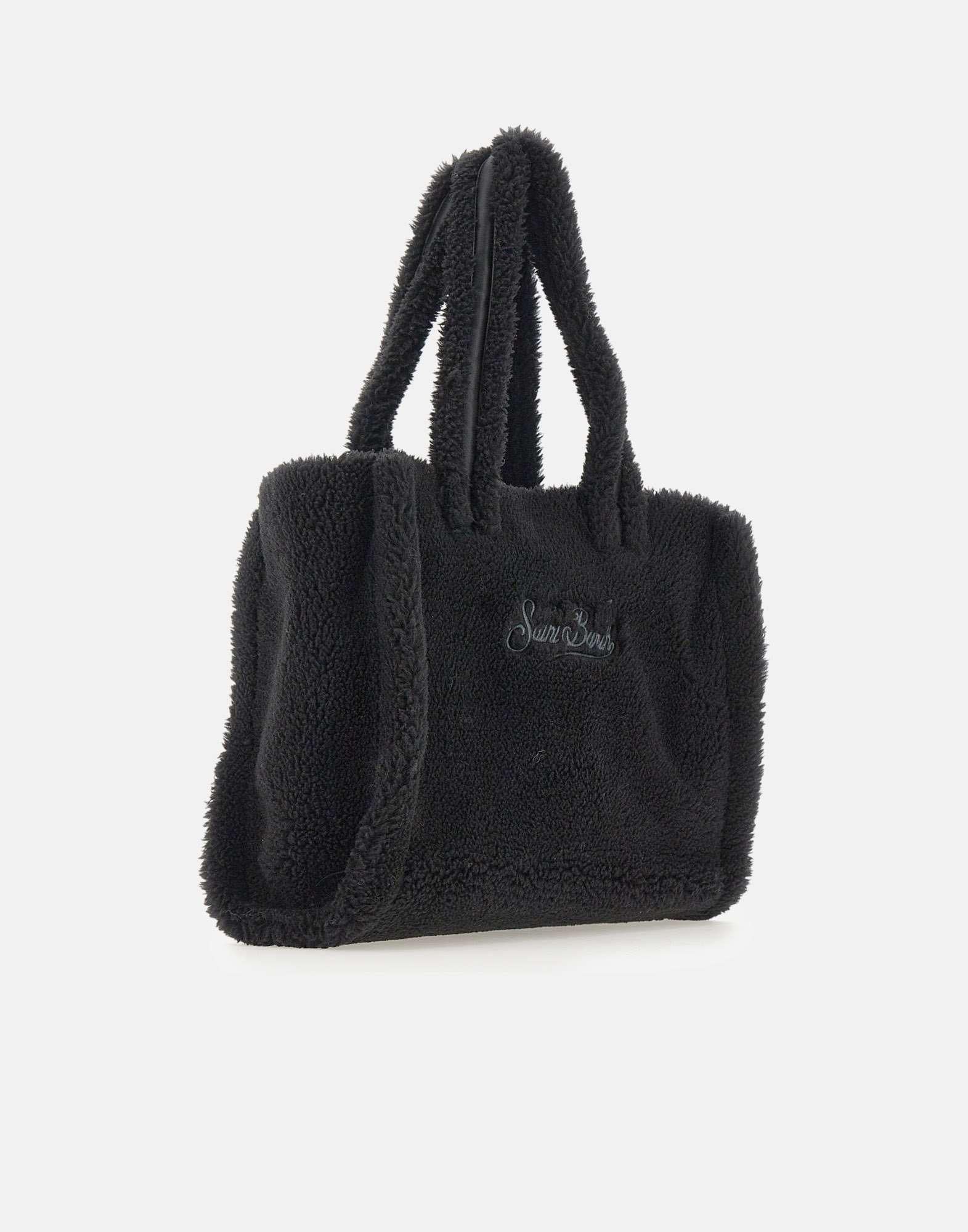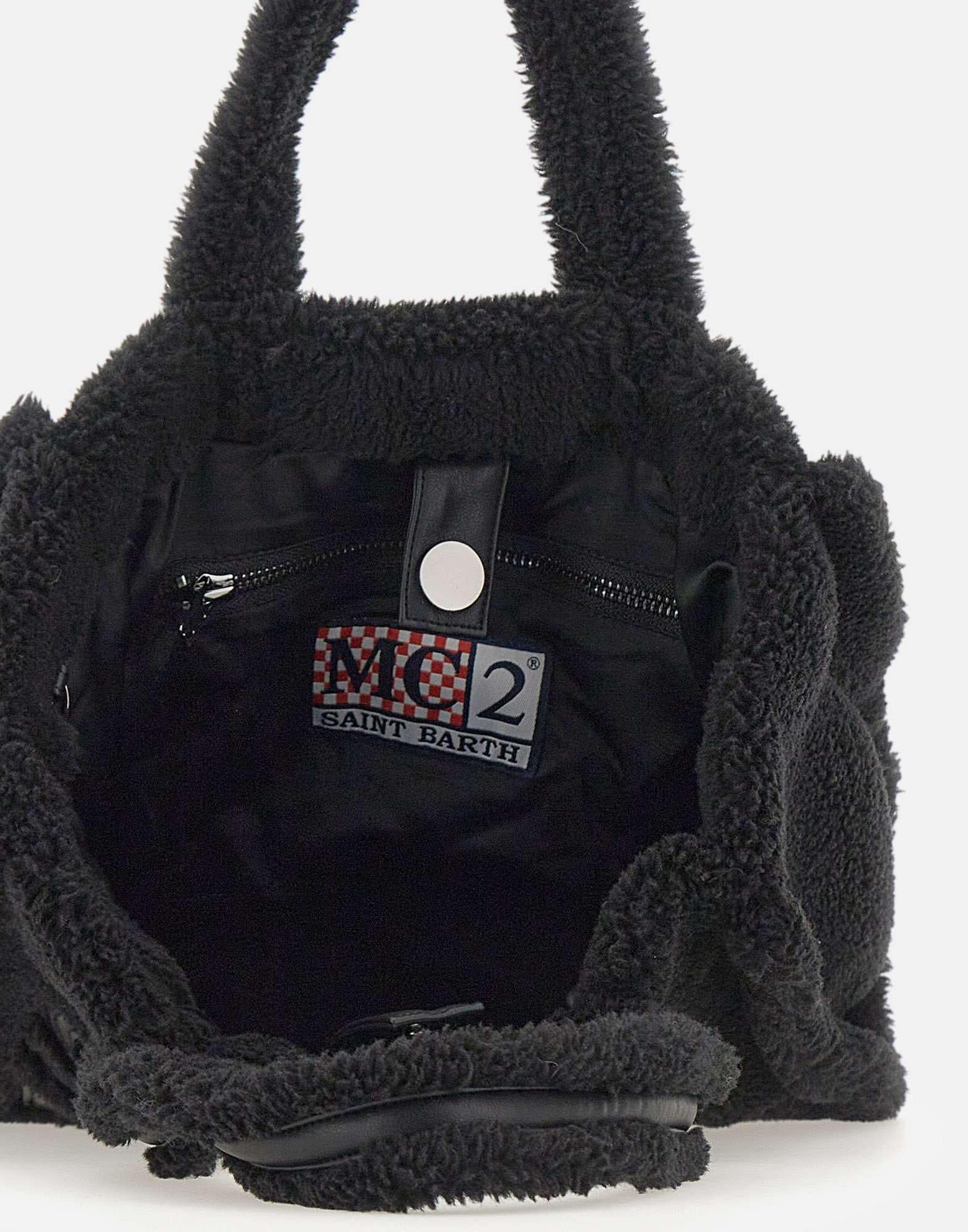 Borsa Mc2 Saint Barth "Colette Teddy" in morbido tessuto effetto pelliccia total black. Presenta doppio manico, logo ricamato su fronte e retro e chiusura con bottone. Dotata di tasca interna e tracolla regolabile e removibile, è una borsa versatile e di tendenza, perfetta per aggiungere un tocco glamour ai look invernali. Misure: 30x24x10 cm.