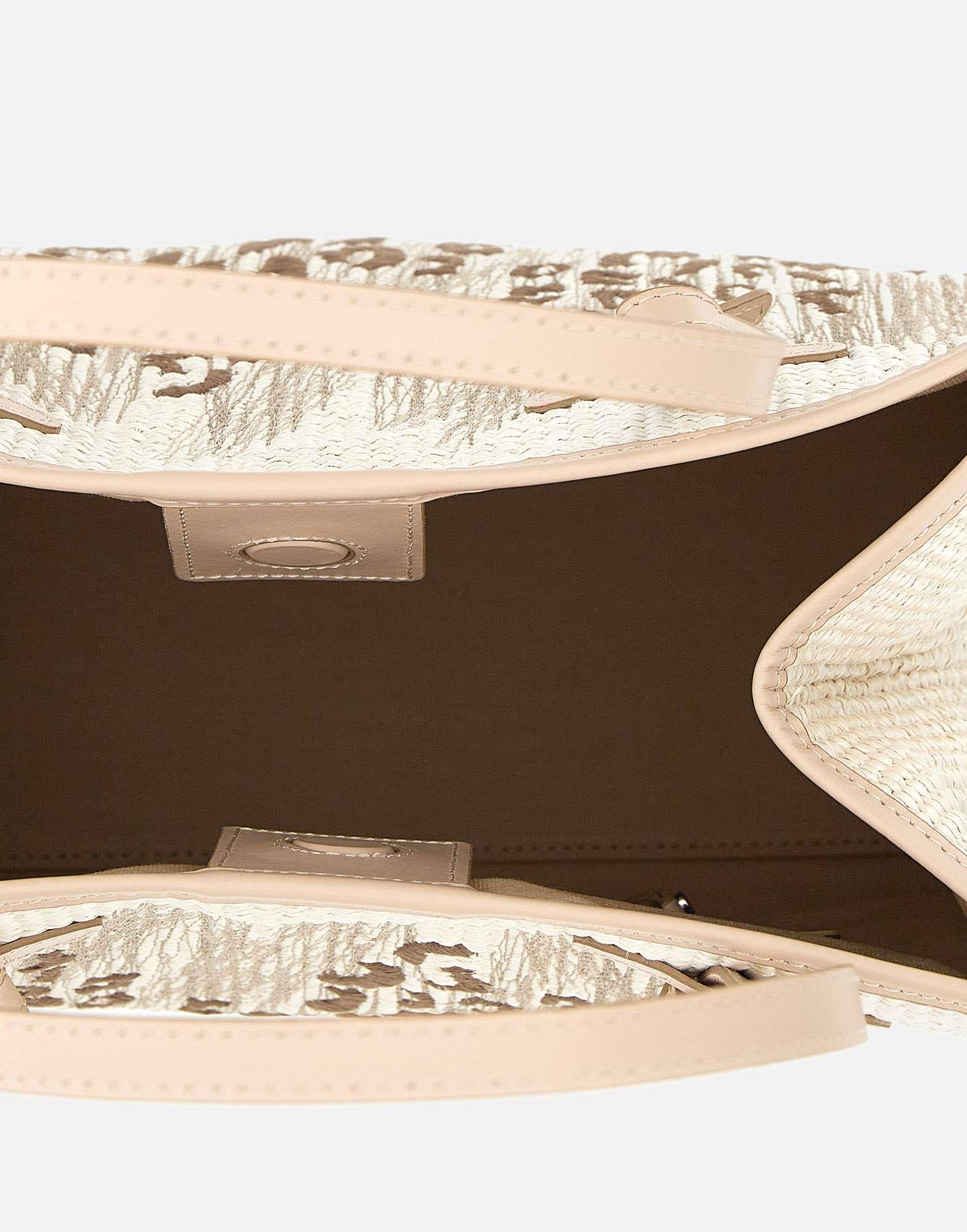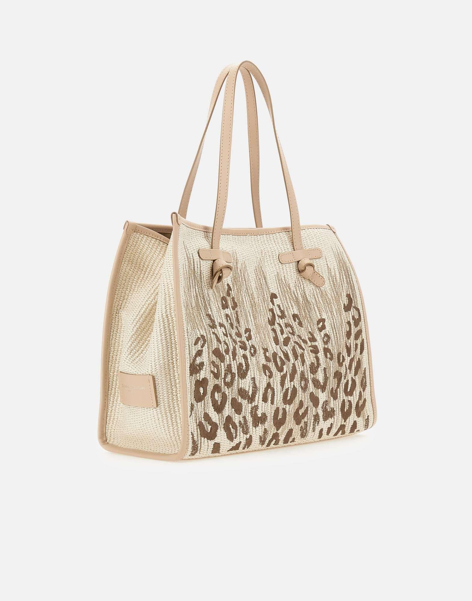 Borsa a spalla "Marcella" Gianni Chiarini Marcella Club, realizzata in rafia panna con raffinata stampa animalier marrone ricamata sul fronte e sul retro. La silhouette semplice e moderna è impreziosita da profili e manici in pelle, insieme al patch logo laterale che ne sottolinea l’eleganza. Dotata di chiusura magnetica, fodera interna in tessuto beige e pratiche tasche (una con zip e due aperte), unisce stile e funzionalità. Un’icona senza tempo, perfetta per aggiungere un tocco sofisticato a ogni look. Lunghezza: 38cm, altezza 30cm, profondità 16cm.
