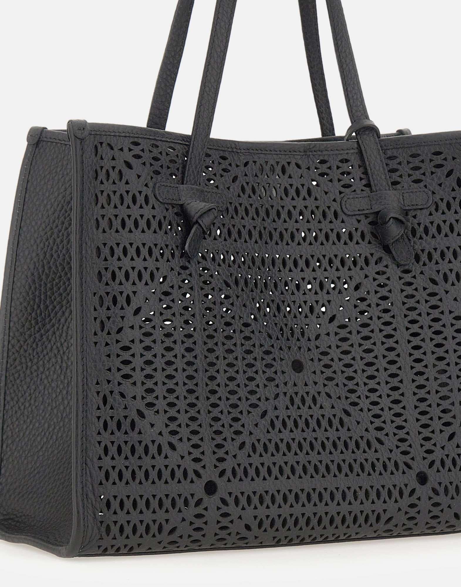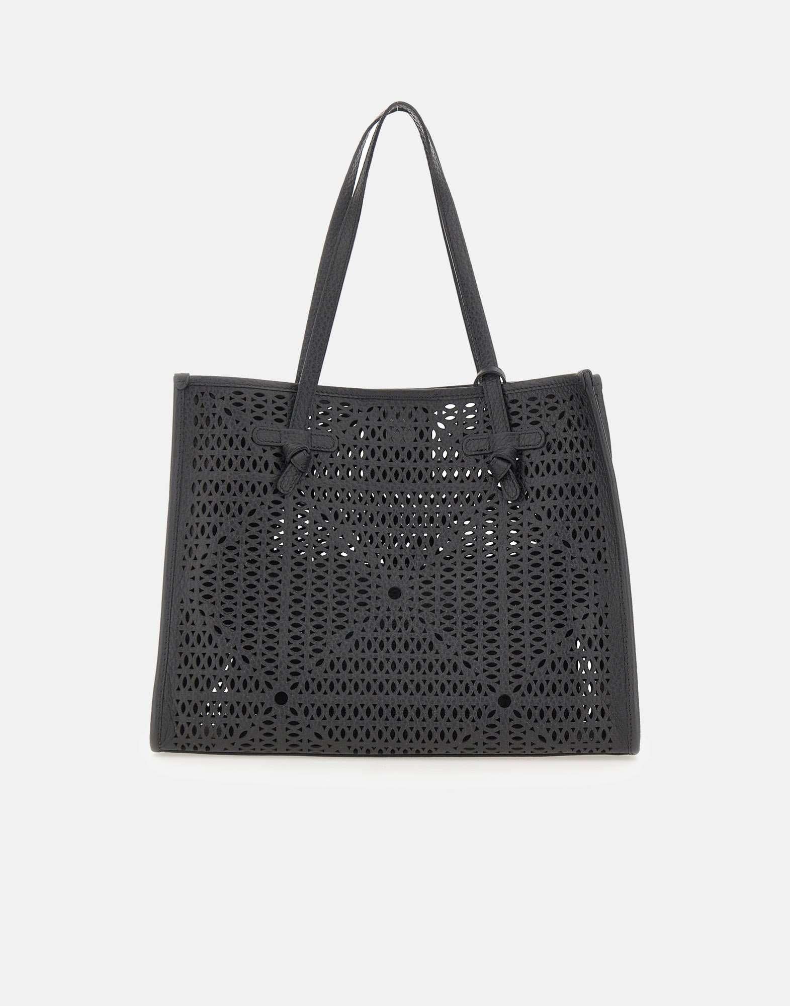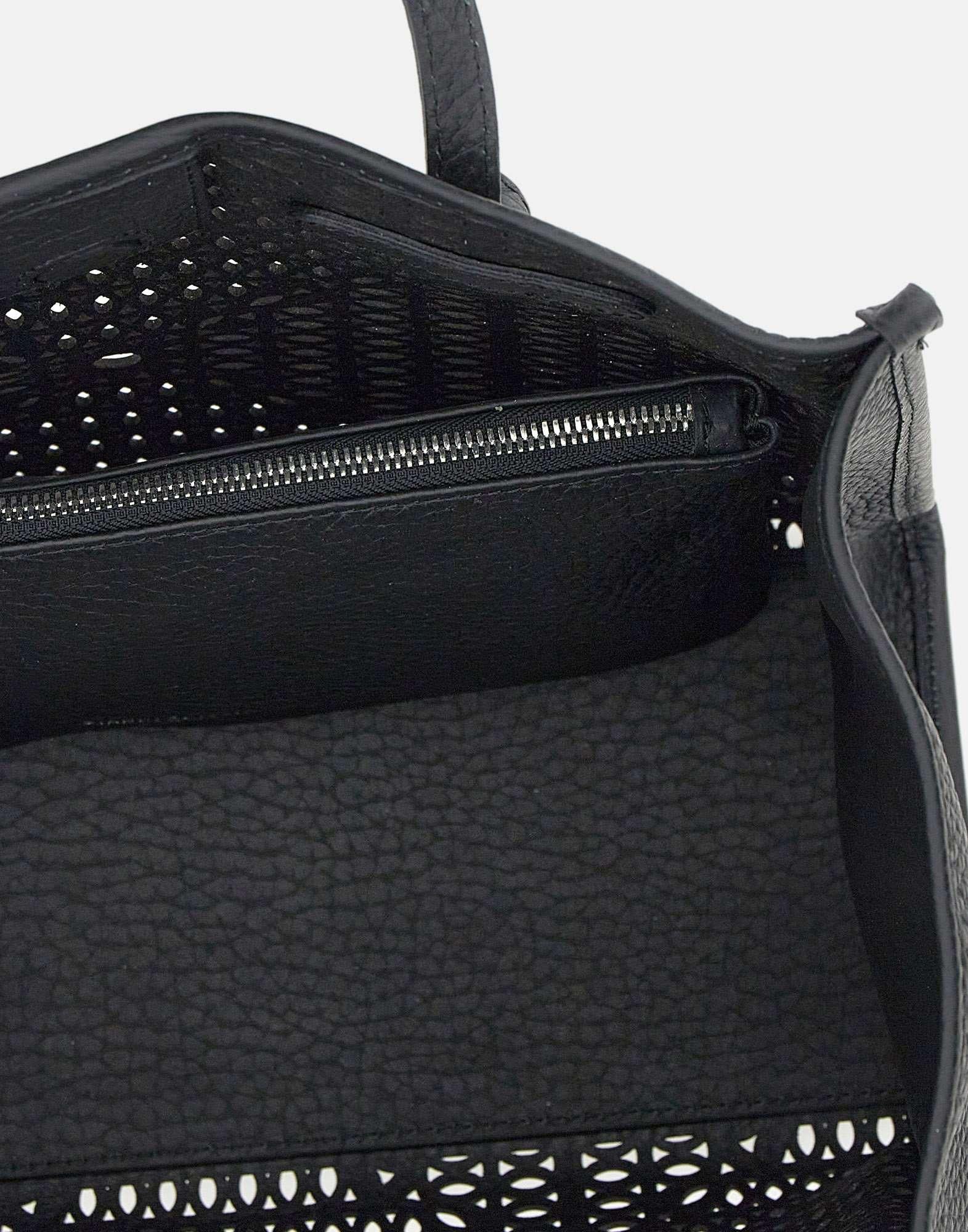 La borsa a spalla "Marcella" Gianni Chiarini Marcella Club è realizzata in morbida pelle nera e si distingue per il motivo traforato frontale e posteriore, elemento iconico che dona carattere e modernità. La silhouette semplice e leggera, unita ai manici in pelle e alla chiusura magnetica, la rende perfetta per l’uso quotidiano. Il patch logo laterale in pelle completa il design con un dettaglio raffinato. Un accessorio cool e versatile, ideale per aggiungere un tocco di personalità a ogni outfit. Lunghezza: 38cm, altezza: 28cm, profondità: 15cm. Made in Italy.
