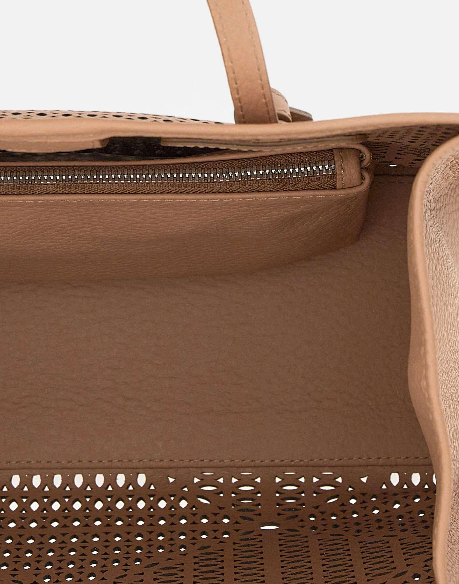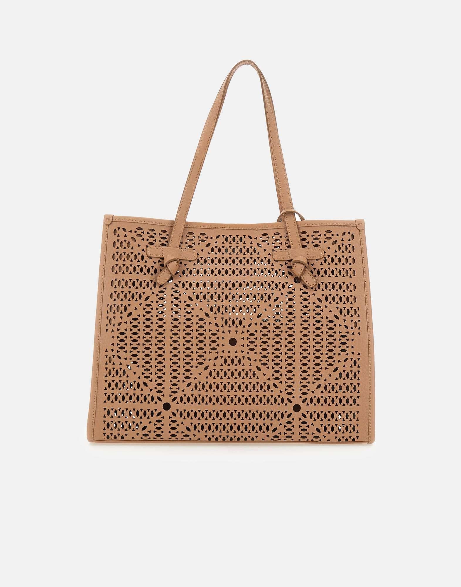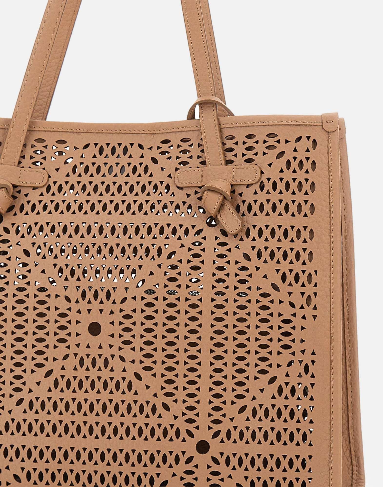 La borsa a spalla "Marcella" Gianni Chiarini Marcella Club è realizzata in morbida pelle marrone e si distingue per il motivo traforato frontale e posteriore, elemento iconico che dona carattere e modernità. La silhouette semplice e leggera, unita ai manici in pelle e alla chiusura magnetica, la rende perfetta per l’uso quotidiano. Il patch logo laterale in pelle completa il design con un dettaglio raffinato. Un accessorio cool e versatile, ideale per aggiungere un tocco di personalità a ogni outfit. Lunghezza: 38cm, altezza: 28cm, profondità: 15cm. Made in Italy.