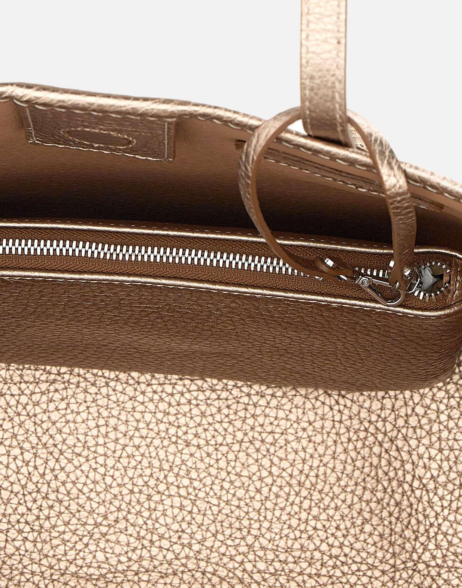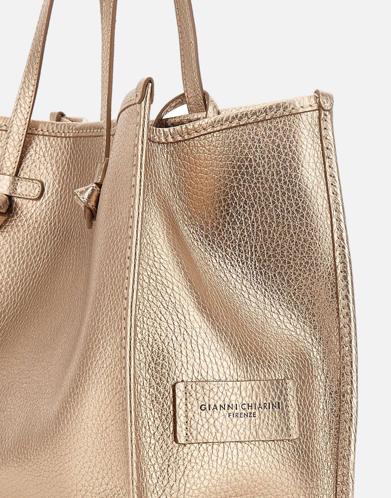 Borsa a spalla "Marcella" Gianni Chiarini Marcella Club, realizzata in pelle double a grana maxi color oro, dal design semplice e moderno. Il materiale pregiato dona un aspetto distintivo e di alta qualità, mentre il patch logo laterale in pelle sottolinea l’eleganza del brand. Dotata di manici in pelle e di una comoda chiusura magnetica, è perfetta per l’uso quotidiano. La fodera interna e la pochette coordinata completano il design, offrendo versatilità e stile in ogni occasione. Lunghezza 38cm, altezza 31cm, profondità 16cm. Made in Italy.
