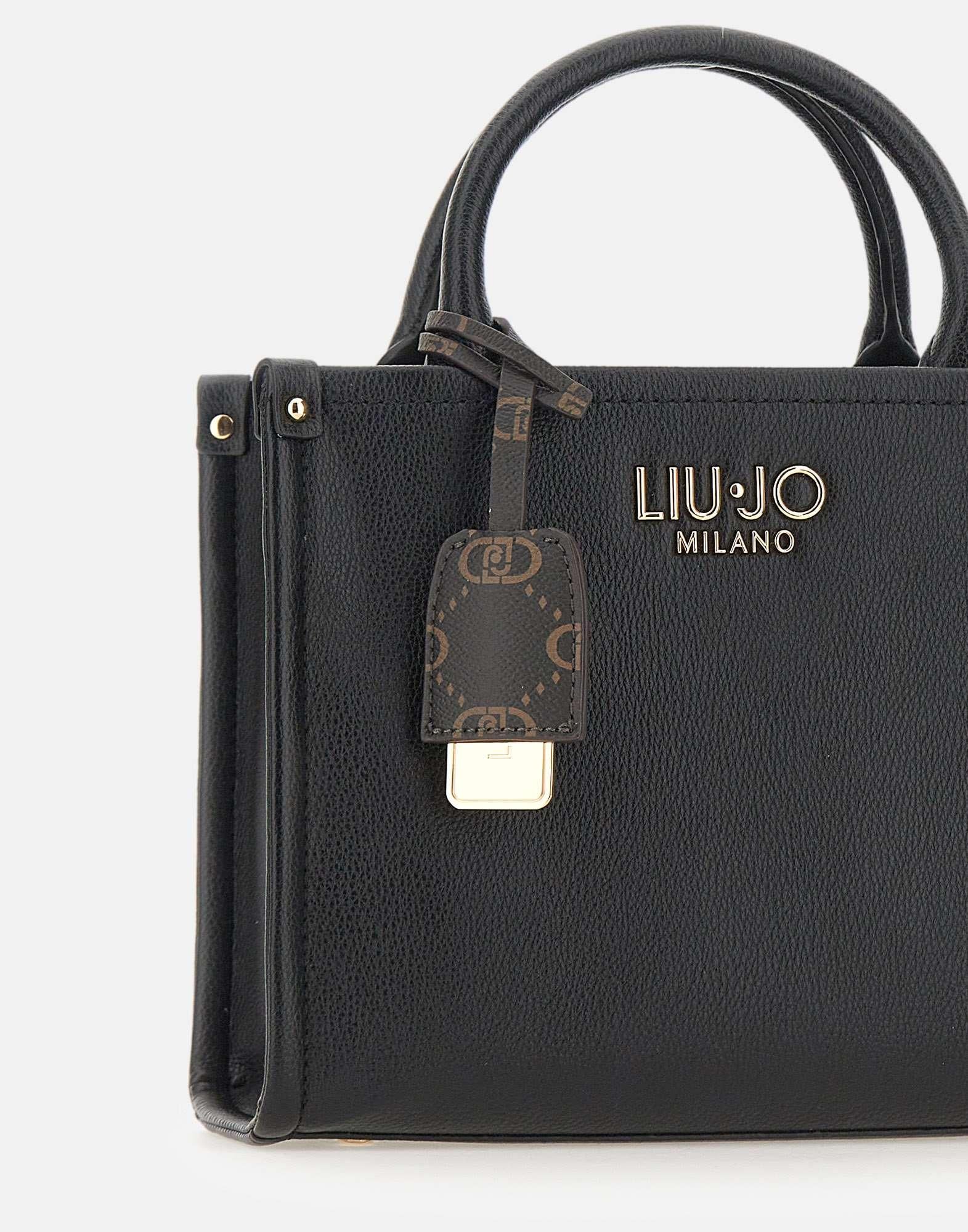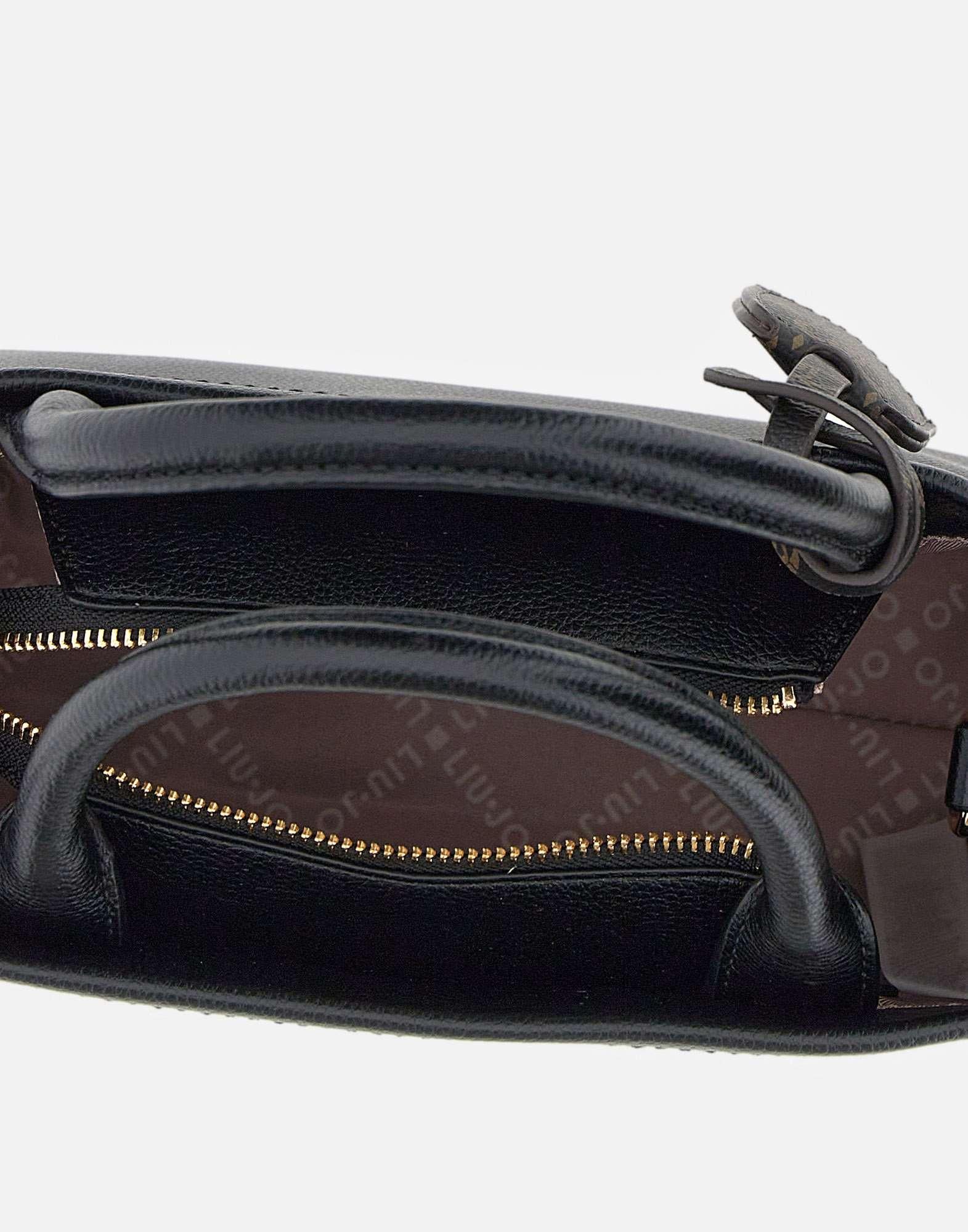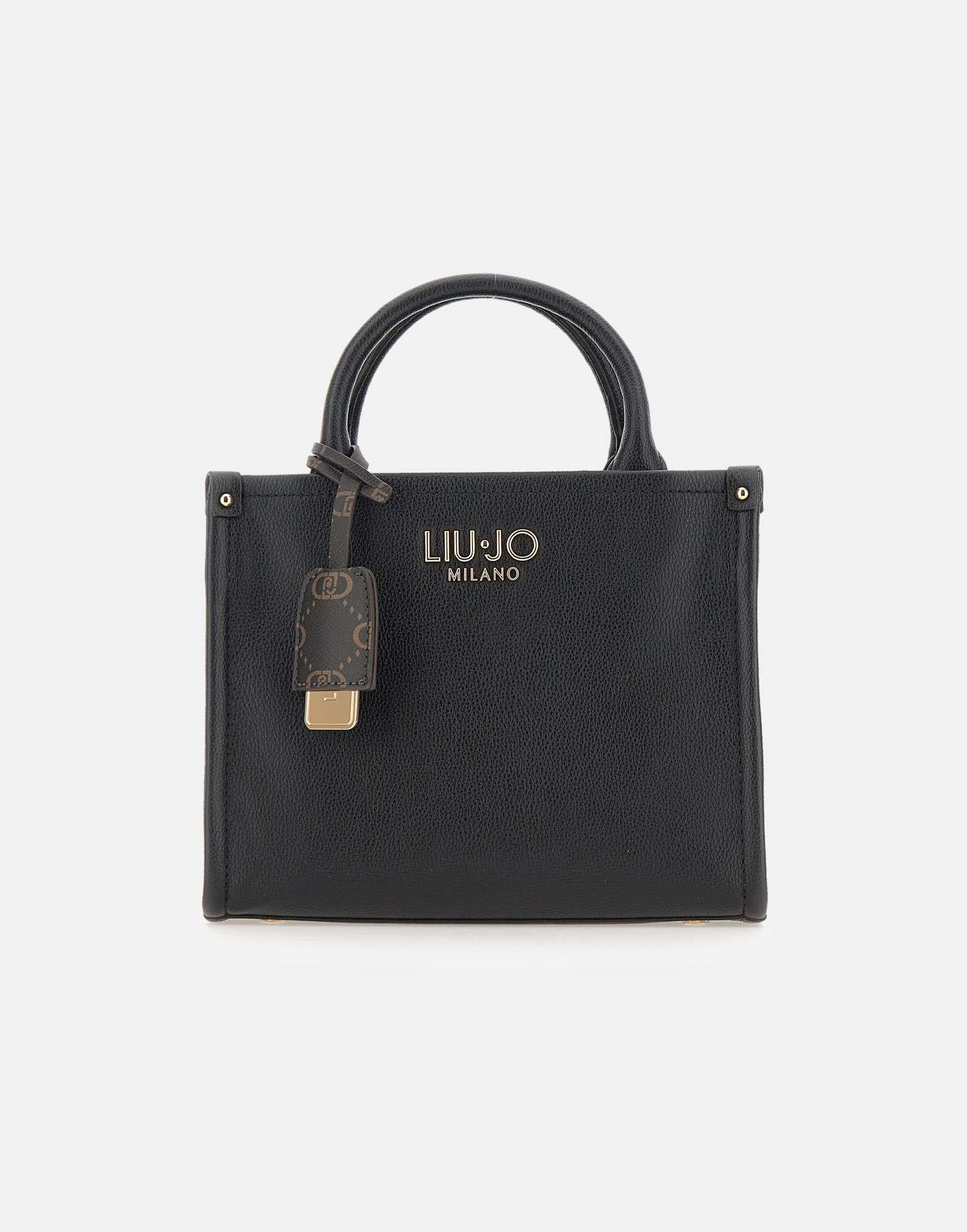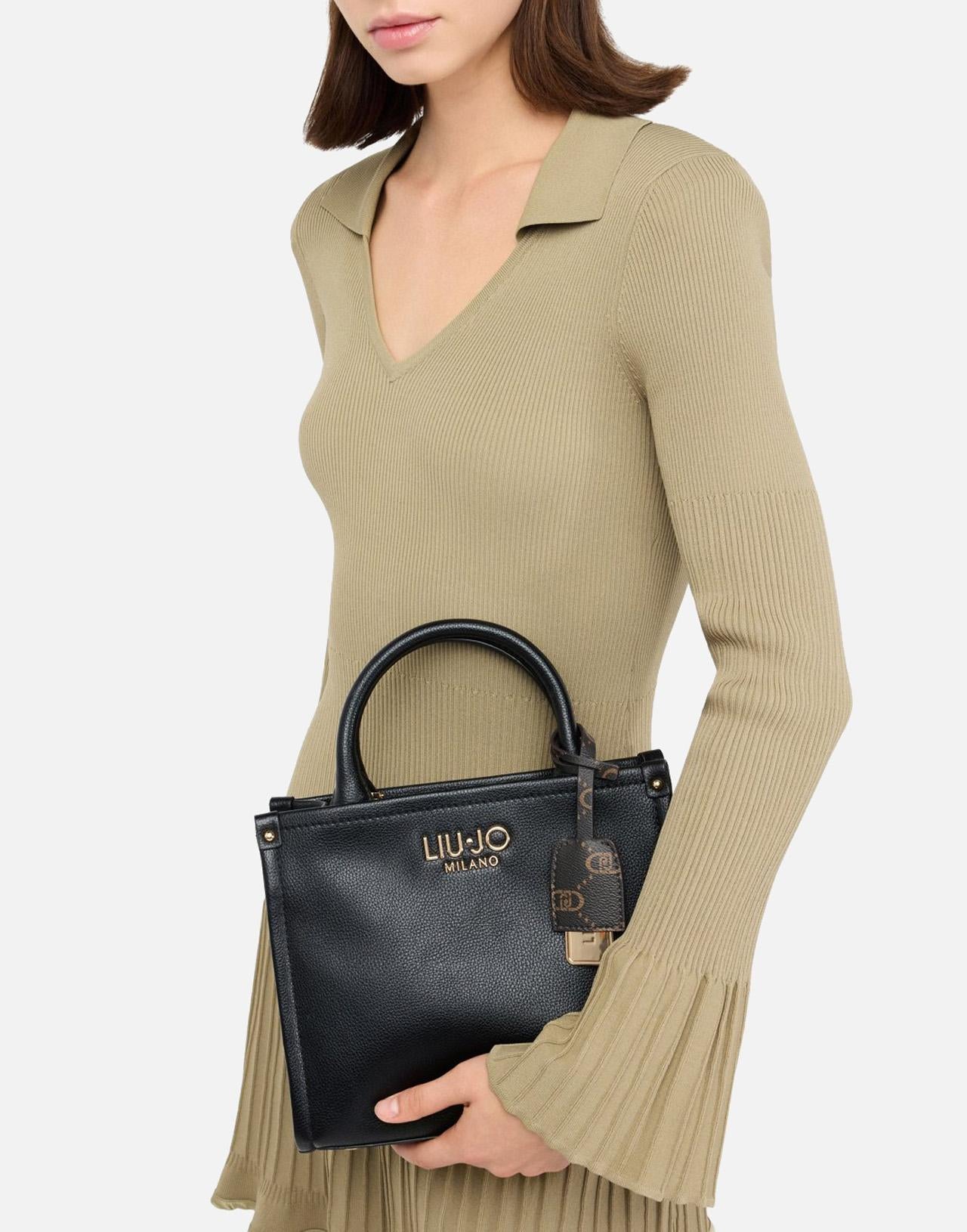 Borsa a mano Liu-Jo "Ridhi" in ecopelle in nero, stampa effetto bottalato, elegante e funzionale. Dotata di comodi manici, tracolla regolabile e removibile, charm logato e logo in metallo frontale. Presenta chiusura con zip, fodera interna logata, piedini metallici al fondo e metalleria dorata. Appartenente alla linea "Liu Jo Better", è realizzata con materiali e processi sostenibili. Dust bag inclusa. Misure: 25x10x20 cm.