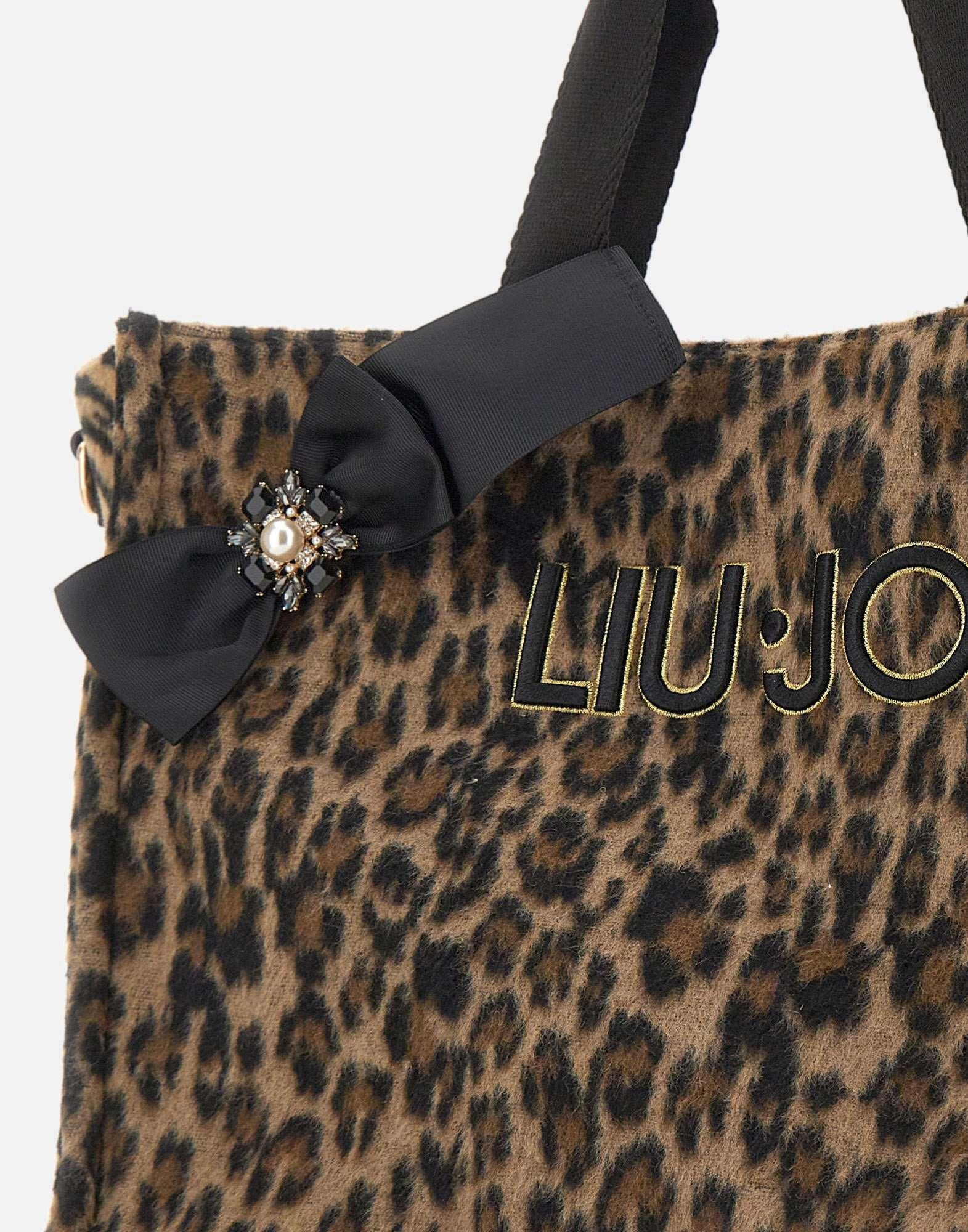 Shopping bag grande Liu-Jo in fantasia animalier nei toni del nero e beige, dal carattere elegante e contemporaneo. Presenta logo ricamato sul davanti, fiocco con spilla gioiello, comodi manici e tracolla logata in gros-grain regolabile e removibile. Dotata di chiusura con zip e metalleria dorata, è perfetta per aggiungere un tocco sofisticato ai look quotidiani. Misure: 41x29x19 cm.