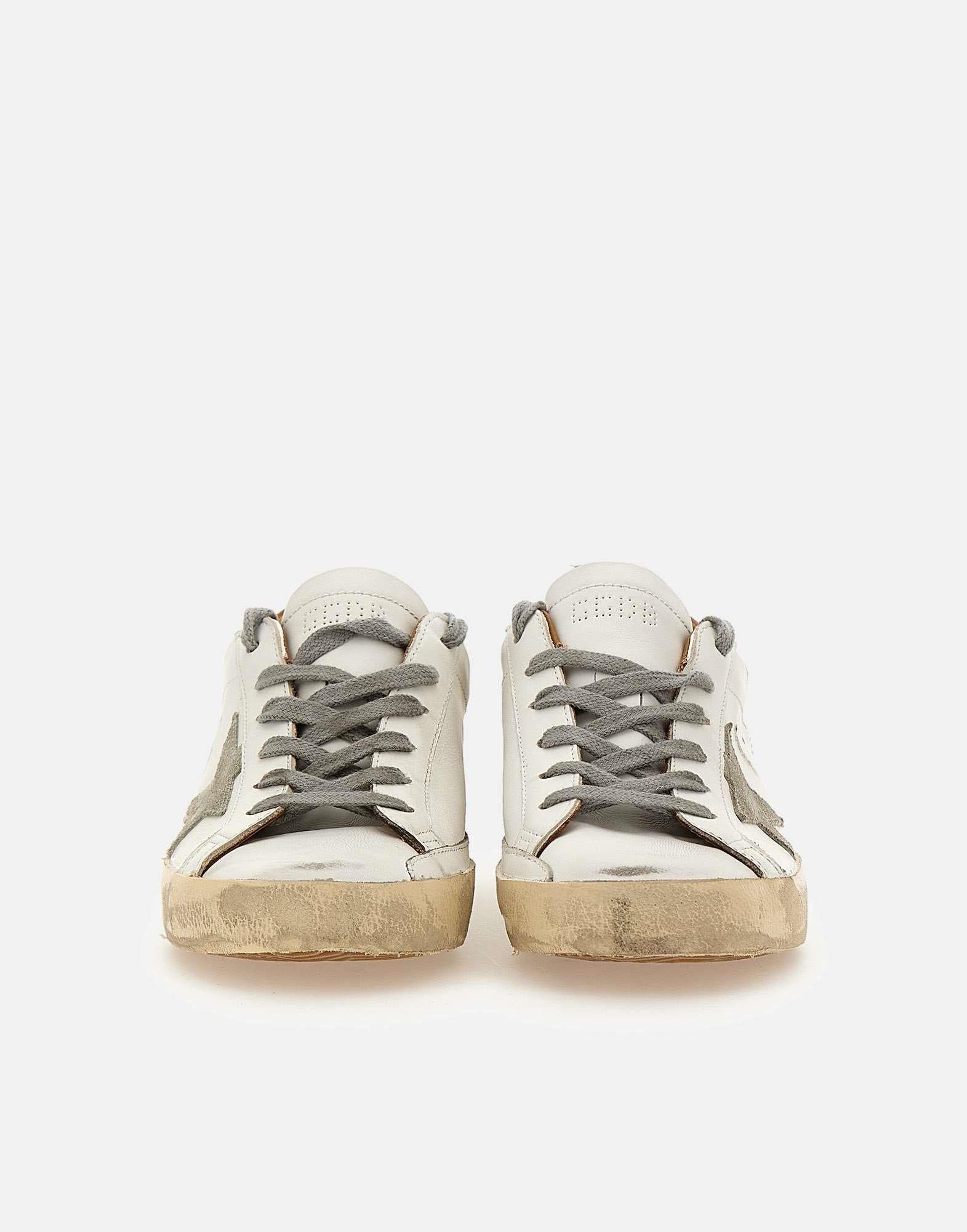 Sneakers donna ''Super Star Classic'' Golden Goose in pelle, bianche con dettaglio tallone e profilo interno color cuoio, inserti in suede, logo sulla linguetta, stella iconica laterale, chiusura con lacci colore grigio, suola in gomma alta 2,5cm. Made in Italy. Custodia in tessuto inclusa.