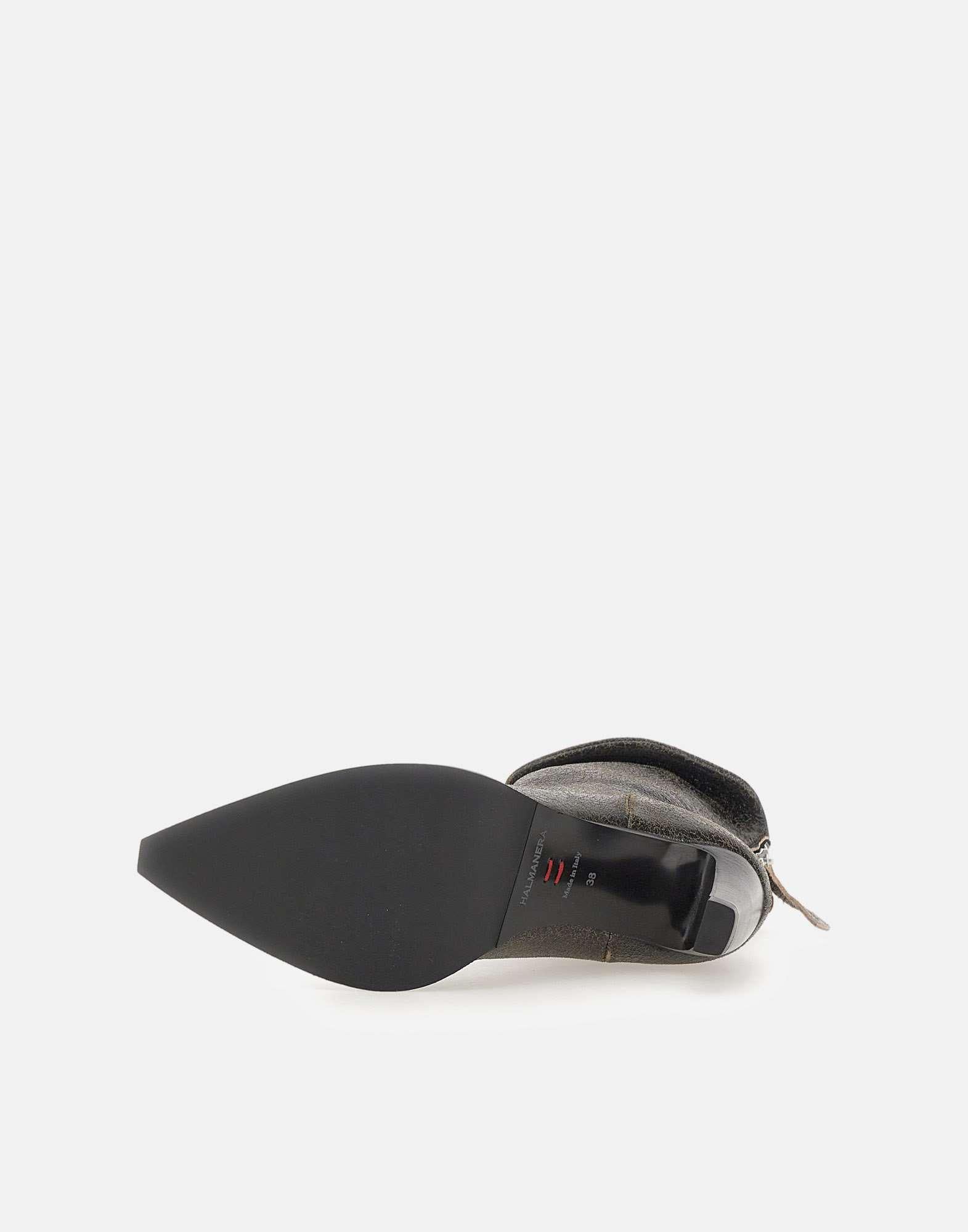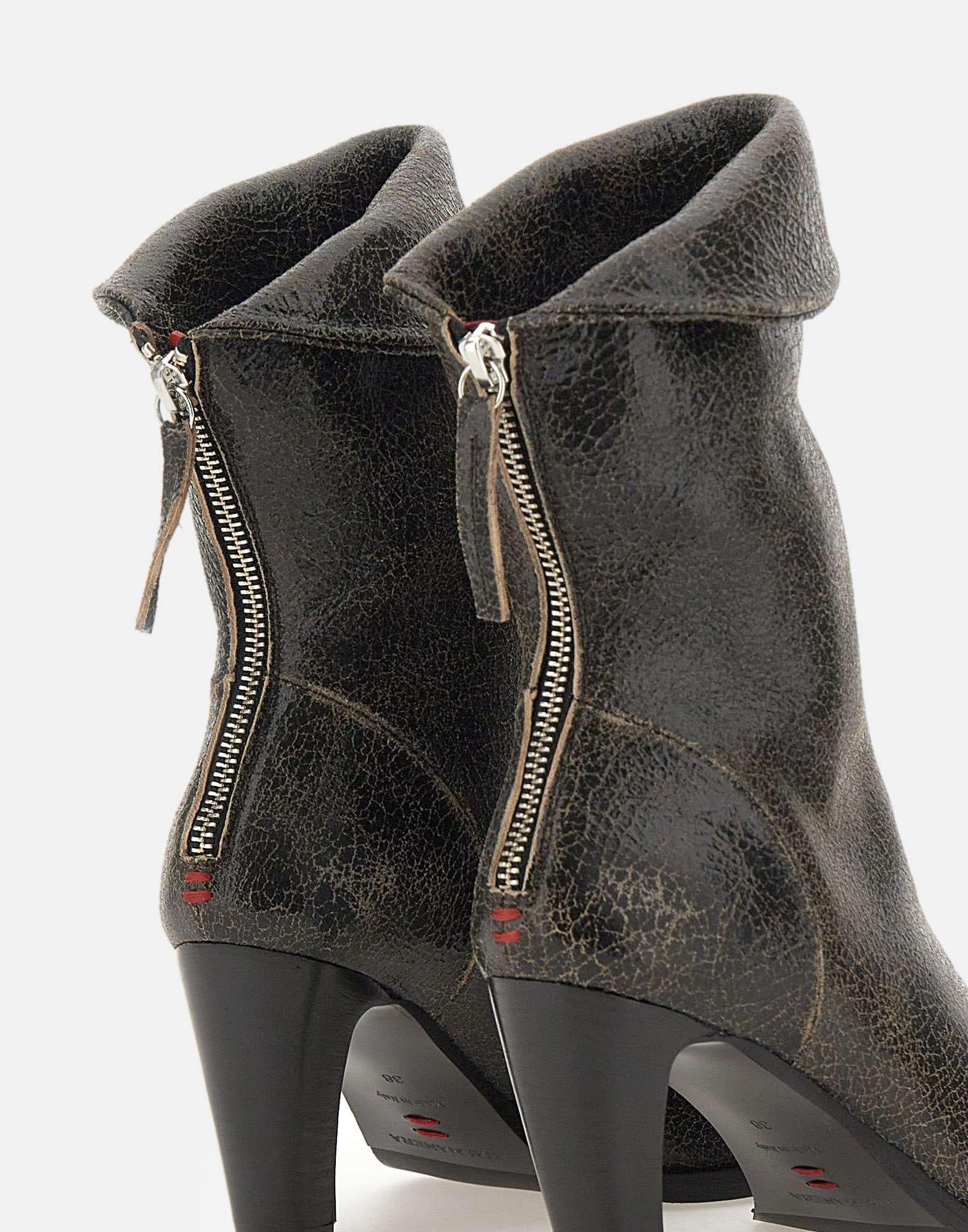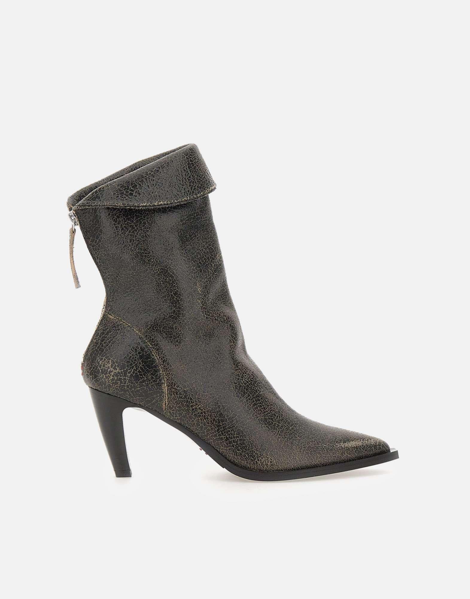 Stivali "Tia27" Halmanera, perfetto mix di carattere, qualità artigianale e stile senza tempo. Realizzati in pelle craquelé color testa di moro con effetto vintage, si distinguono per il loro design texano contemporaneo, ideale per chi cerca uno stile deciso e raffinato. Il modello presenta un elegante risvolto sul gambale, una silhouette a punta e una pratica zip posteriore che facilita la calzata. Il tacco da 8 cm, solido e ben bilanciato, dona slancio alla figura senza rinunciare alla comodità. La calzata regolare e la suola in gomma assicurano comfort e stabilità per tutto il giorno. Inclusa una custodia protettiva, 100% Made in Italy. Vestibilità: Regolare
