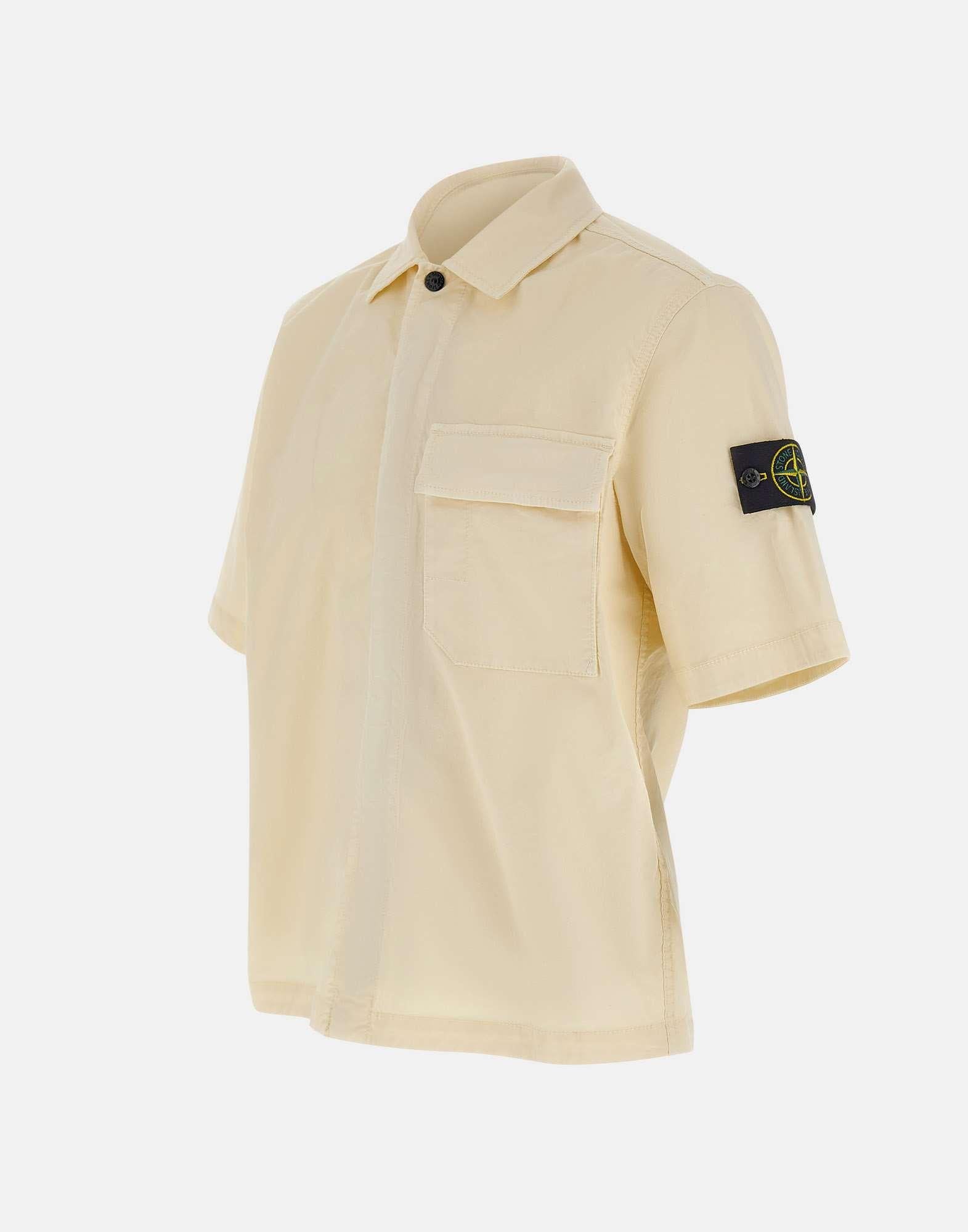 Camicia uomo Stone Island in twill di cotone biologico stretch color panna, a manica corta, pensata come capo contemporaneo e funzionale. Il modello è tinto in capo per una resa cromatica distintiva e presenta tasca sul petto a doppio scomparto con patta e bottoni nascosti, per un look pulito e tecnico. La chiusura con zip a doppio cursore è nascosta da patta, con bottone automatico in alto e in basso per una finitura essenziale. Completa il design la patch logo applicata sulla manica sinistra. Vestibilità comfort, ideale per styling casual e layering di stagione.