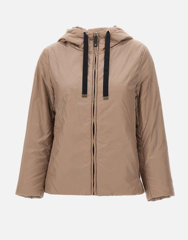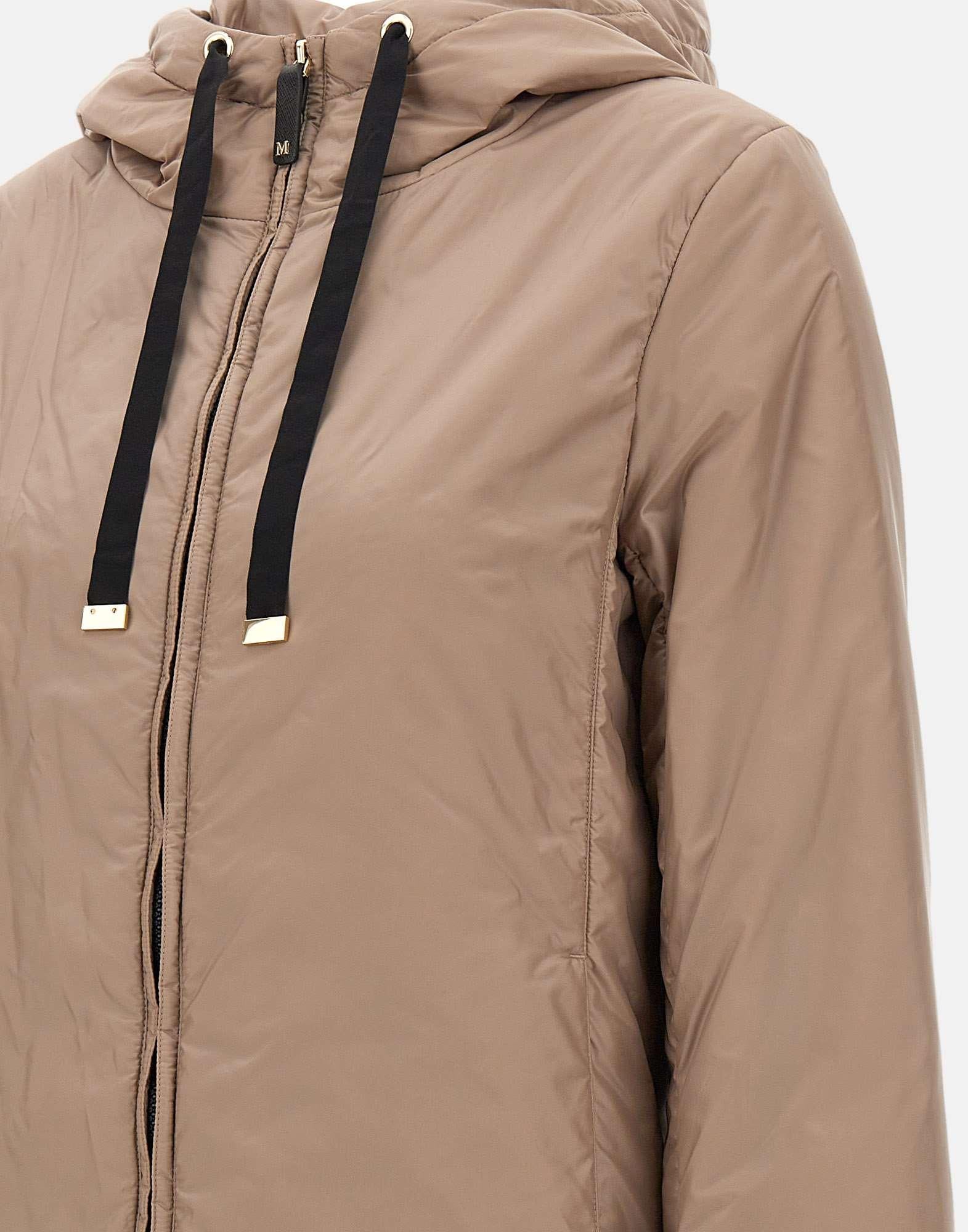 Giacca "Greenh" Max Mara The Cube, nocciola e profili a contrasto colore nero, tessuto in tela antigoccia, linea dritta, cappuccio con coulisse a nastro, imbottitura Cameluxe con seta,