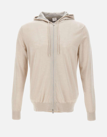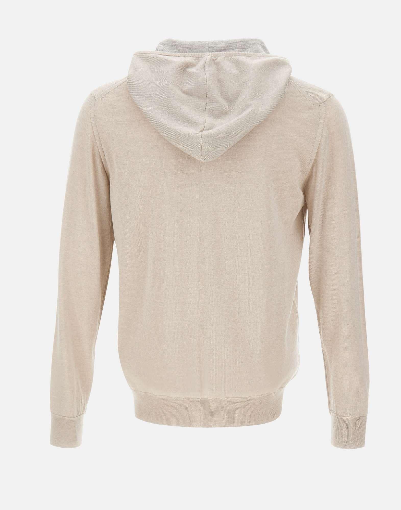 Felpa uomo Eleventy realizzata in misto lana e seta color beige, caratterizzata da un design contemporaneo che unisce comfort, eleganza informale e versatilità. Il modello full zip con cappuccio dotato di coulisse rappresenta un'interpretazione sportiva del classico cardigan, arricchita dalla chiusura a doppio cursore che ne valorizza la praticità d'uso. Il fondo e i polsini a costine definiscono la silhouette con equilibrio, mentre l'interno del cappuccio in contrasto grigio mélange aggiunge un dettaglio ricercato e distintivo. La vestibilità regolare assicura libertà di movimento, rendendo questa felpa uomo in maglia ideale per il tempo libero e per stratificazioni raffinate dal gusto contemporaneo.