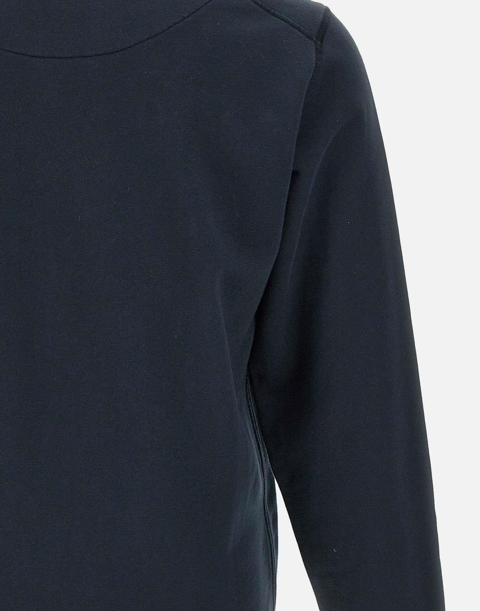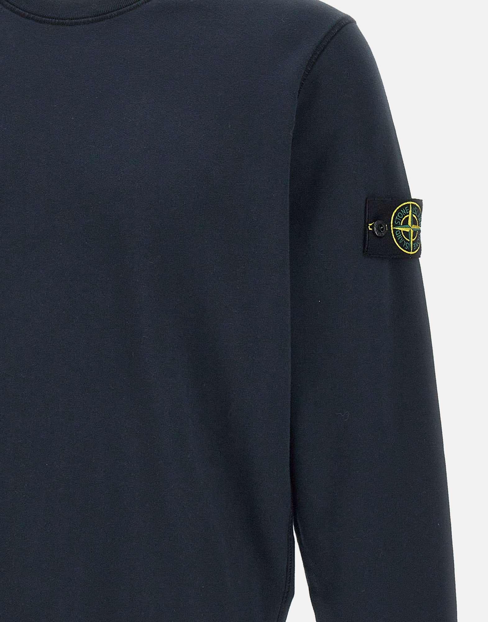 Felpa uomo Stone Island in cotone biologico, blu navy, cuciture overlock, maniche lunghe, girocollo, bordi a costine, iconico badge logo sulla manica sinistra, interno garzato, regular fit.