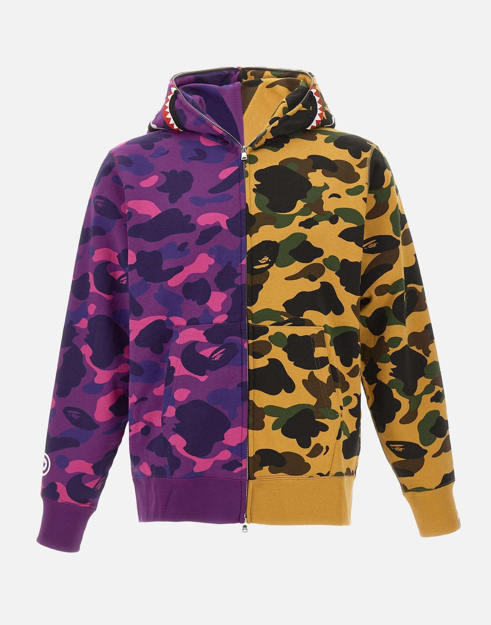 Felpa uomo BAPE "Split Camo Shark" realizzata in cotone con motivo Split Camo Shark nei toni del viola e marrone, pensata per un guardaroba streetwear contemporaneo dal forte impatto visivo. Il modello presenta cappuccio e chiusura con zip intera, dettagli che uniscono funzionalità, comfort e versatilità nell'uso quotidiano. L'iconico design Split Camo Shark definisce il carattere distintivo del capo e lo rende un elemento essenziale per chi ricerca uno stile riconoscibile e deciso. La costruzione in cotone assicura comfort e resistenza, mentre la zip integrale offre diverse possibilità di interpretazione e styling.