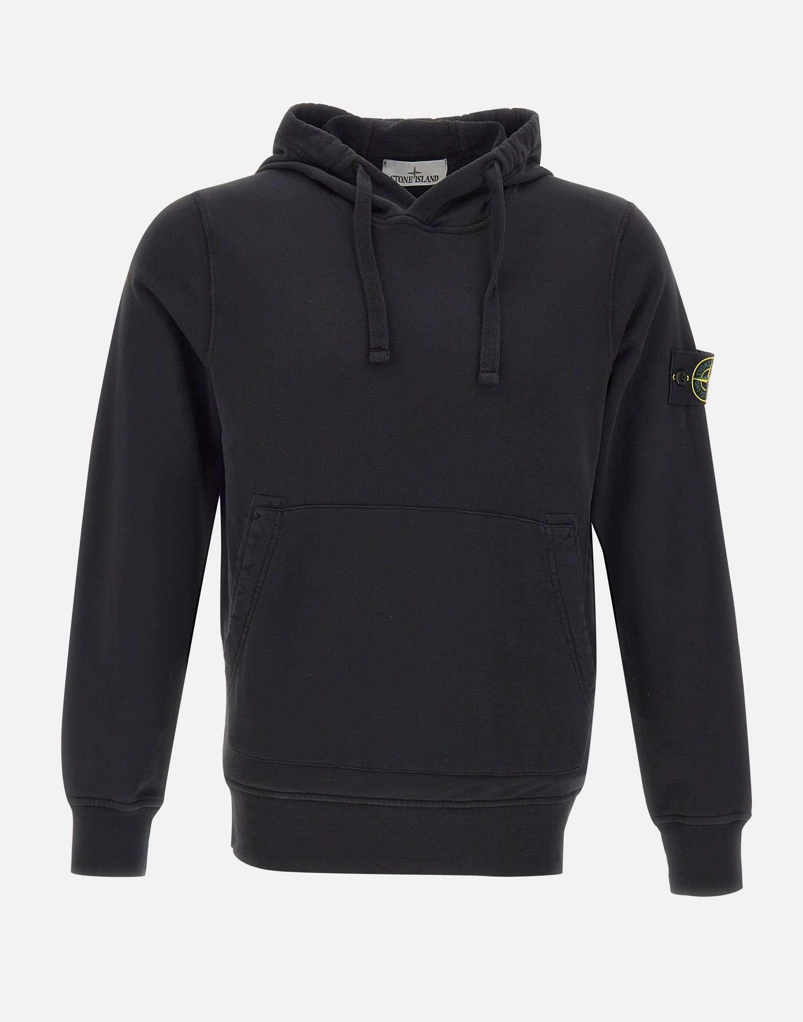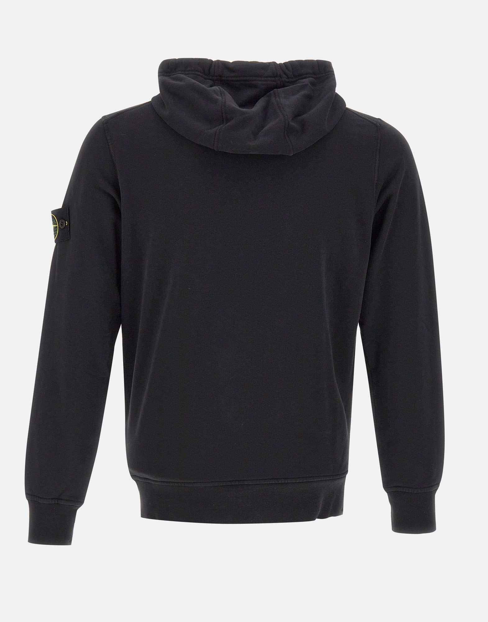Felpa uomo Stone Island "Organic Cotton Fleece", colore nero, realizzata in cotone biologico con interno garzato e trattamento tinto in capo. Presenta cappuccio regolabile con coulisse, cuciture overlock a vista, tasca a marsupio con aperture oblique e iconico badge logo sulla manica sinistra. Lunetta con fodera interna sotto lo scollo posteriore, polsini e fondo in maglia a costine elasticizzate. Vestibilità regular, ideale per un look casual e contemporaneo.