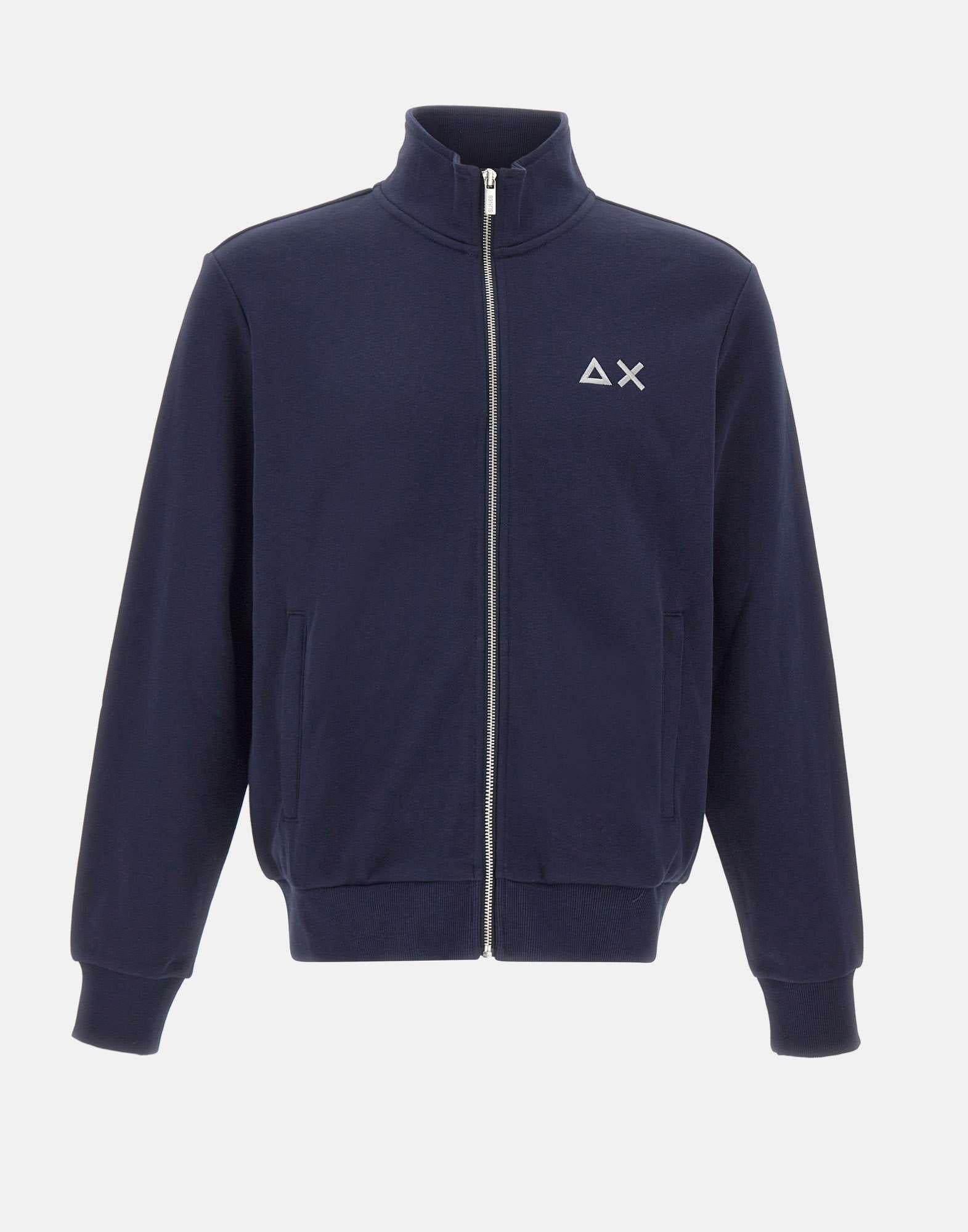Felpa uomo Sun68 "Track Zip Basic" colore blu, appartenente alla linea Everyday. Realizzata in misto cotone morbido con interno felpato, presenta maniche lunghe, colletto in piedi e chiusura frontale con zip in metalleria silver. Le tasche laterali con zip offrono praticità, mentre i bordi a costine e il maxi logo ricamato sul petto completano il design. La vestibilità regular fit assicura comfort e uno stile casual contemporaneo.
