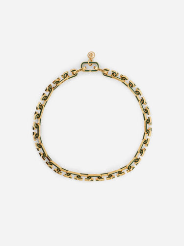Collana "C Link Necklace" gold, realizzata in ottone placcato oro e smalto, con catena verde a maglie "C" dal design distintivo. L’articolo è fornito con scatola regalo, sacchetto per la polvere e libretto dettagliato del prodotto. Un gioiello moderno e raffinato, perfetto per aggiungere carattere a ogni look.