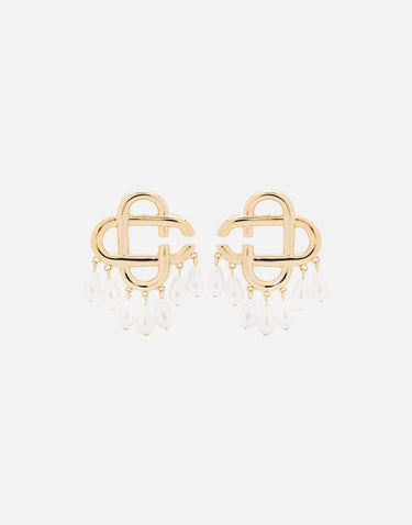 Orecchini Casablanca "Pearl Drop Logo Earrings" placcati gold, caratterizzati da perle pendenti e design logato distintivo. Dotati di chiusura a farfalla, aggiungono un tocco elegante e raffinato a qualsiasi look.