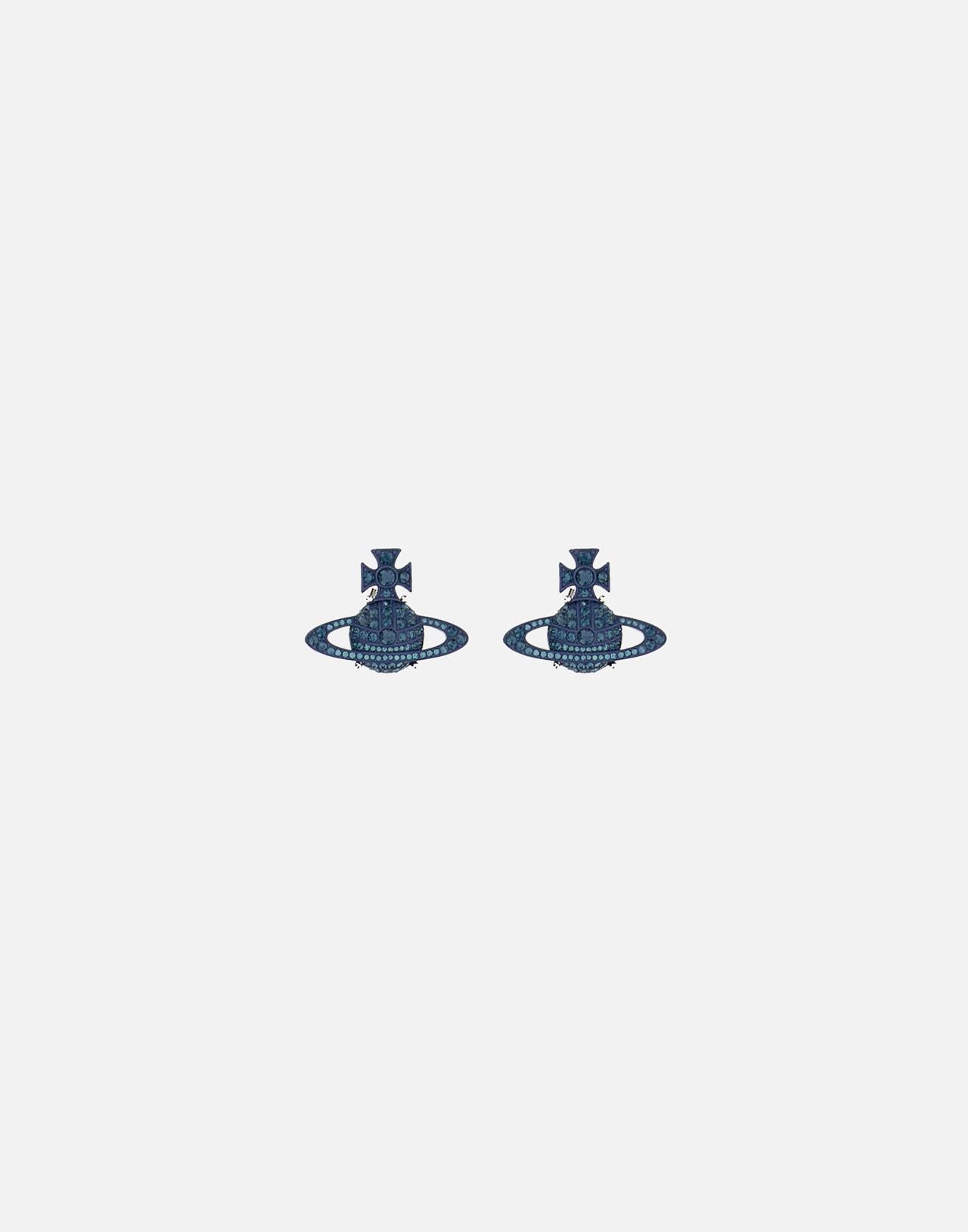 "Pop orb earrings" Vivienne Westwood, placcatura platinum, chiusura con farfallina, Orb con cristalli blu. Confezione regalo e custodia in tessuto.
