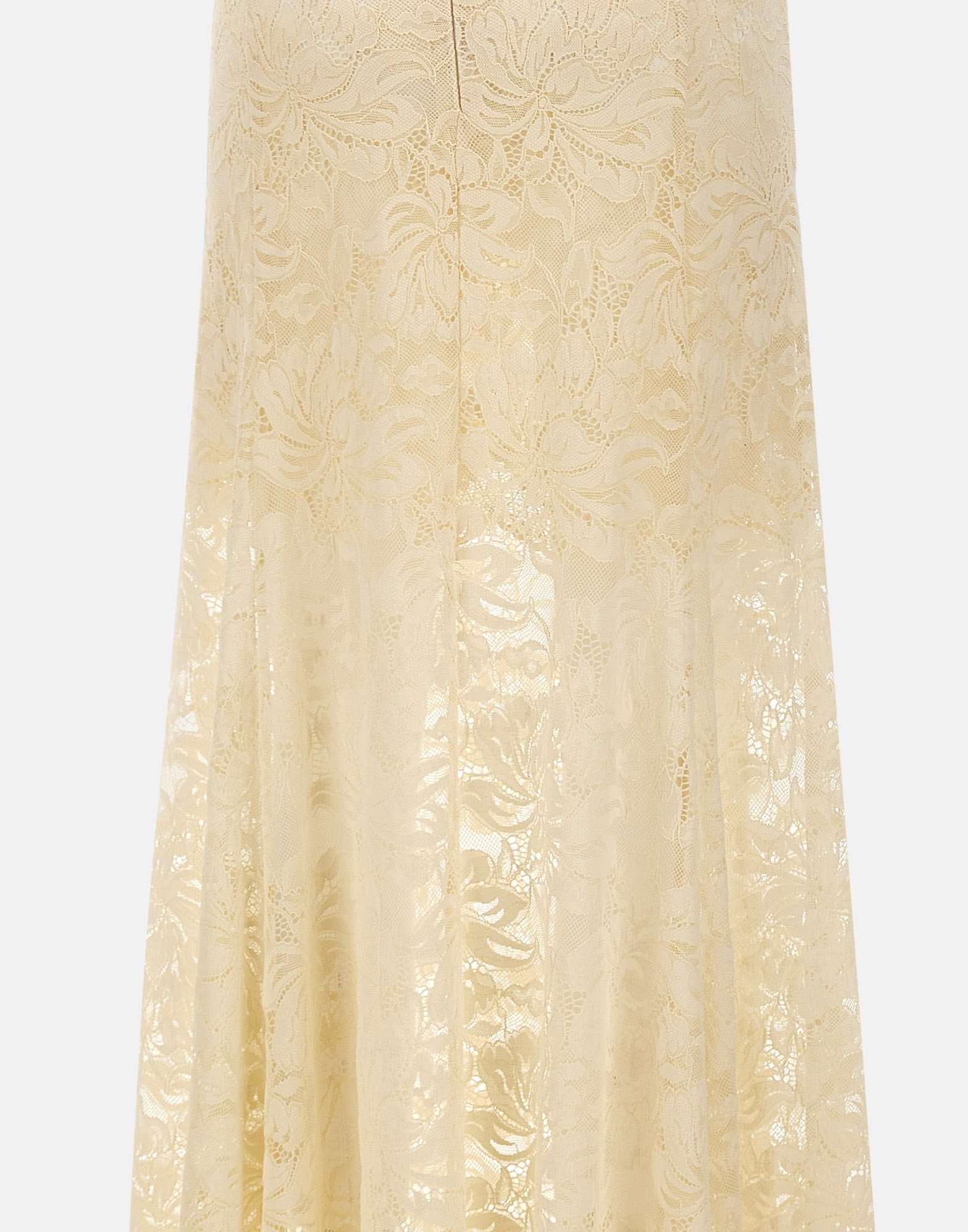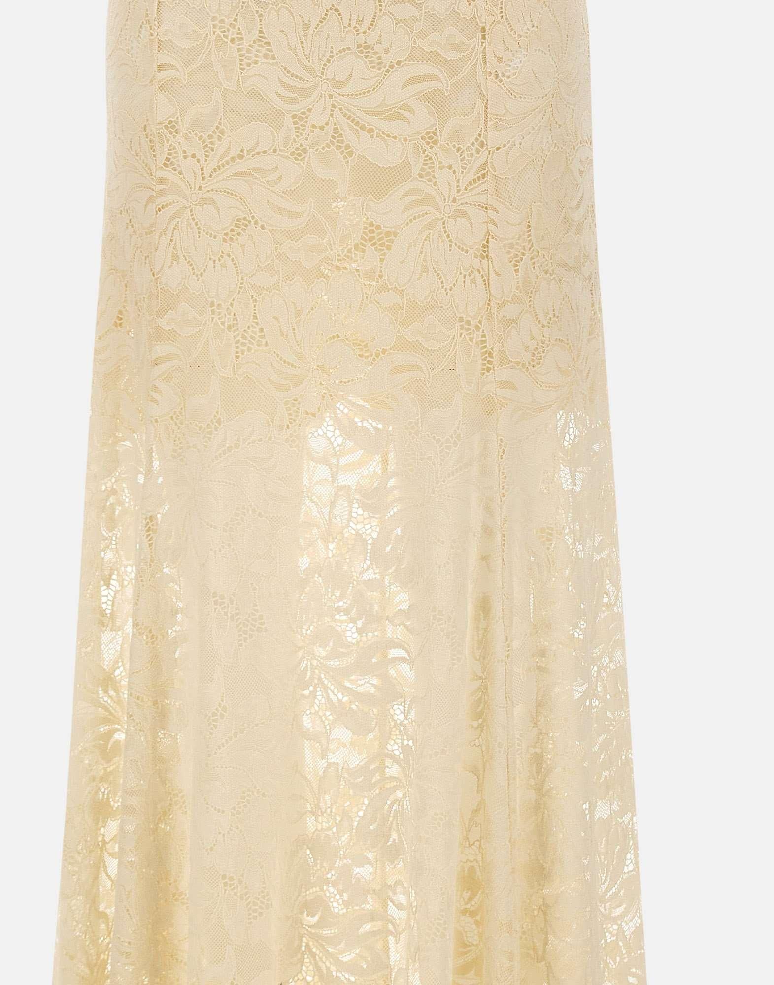 Gonna lunga Rabanne interamente in pizzo color avorio, pensata per un'eleganza luminosa e femminile. Il taglio svasato accompagna la silhouette con movimento, mentre vita e orli sono decorati da merletto per una finitura ricercata. La chiusura con zip invisibile sul retro mantiene la linea pulita e raffinata. Vestibilità regolare, ideale come gonna per occasioni speciali e look da sera.