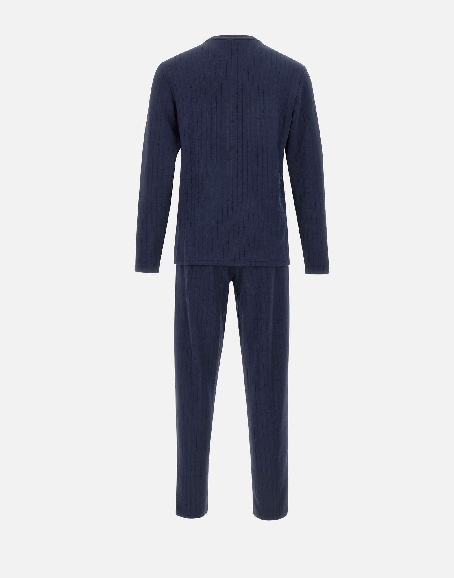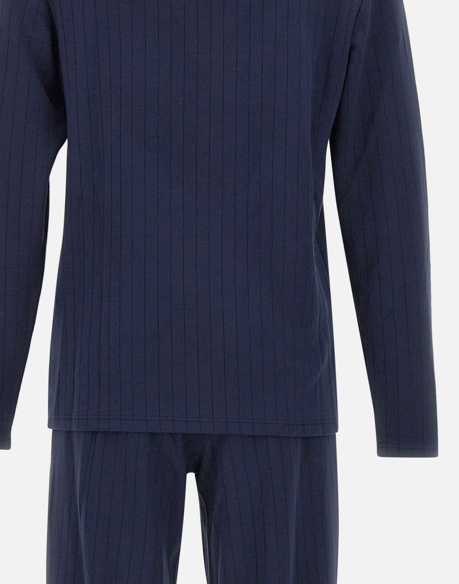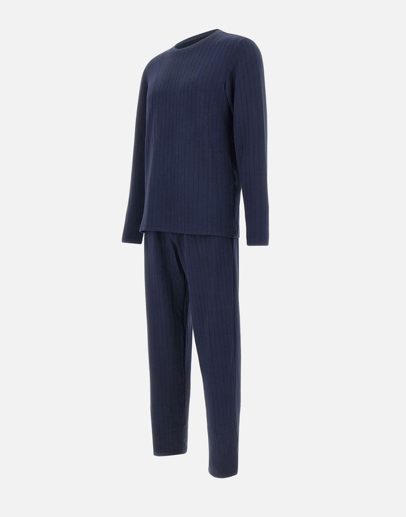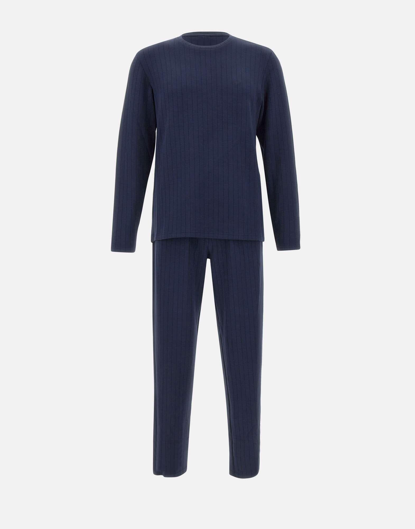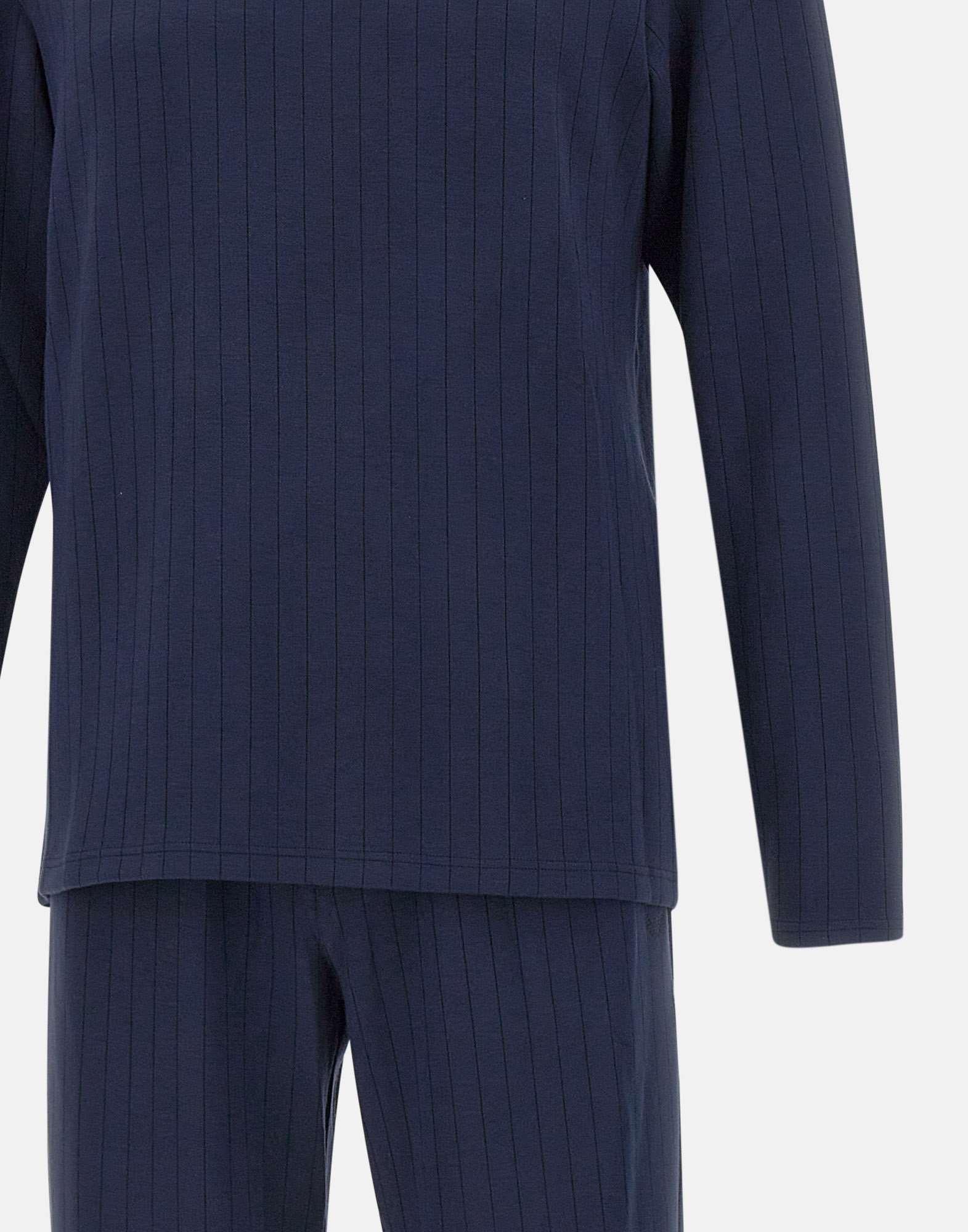 Il completo pigiama Emporio Armani colore blu è realizzato in morbido tessuto misto modal stretch, che garantisce comfort e traspirabilità. La maglia a maniche lunghe con girocollo presenta una trama rigata sottile e il logo ricamato tono su tono sul petto, mentre i pantaloni con vita elasticata e tasche laterali offrono praticità e libertà di movimento. Un completo elegante e confortevole, ideale per il relax quotidiano.