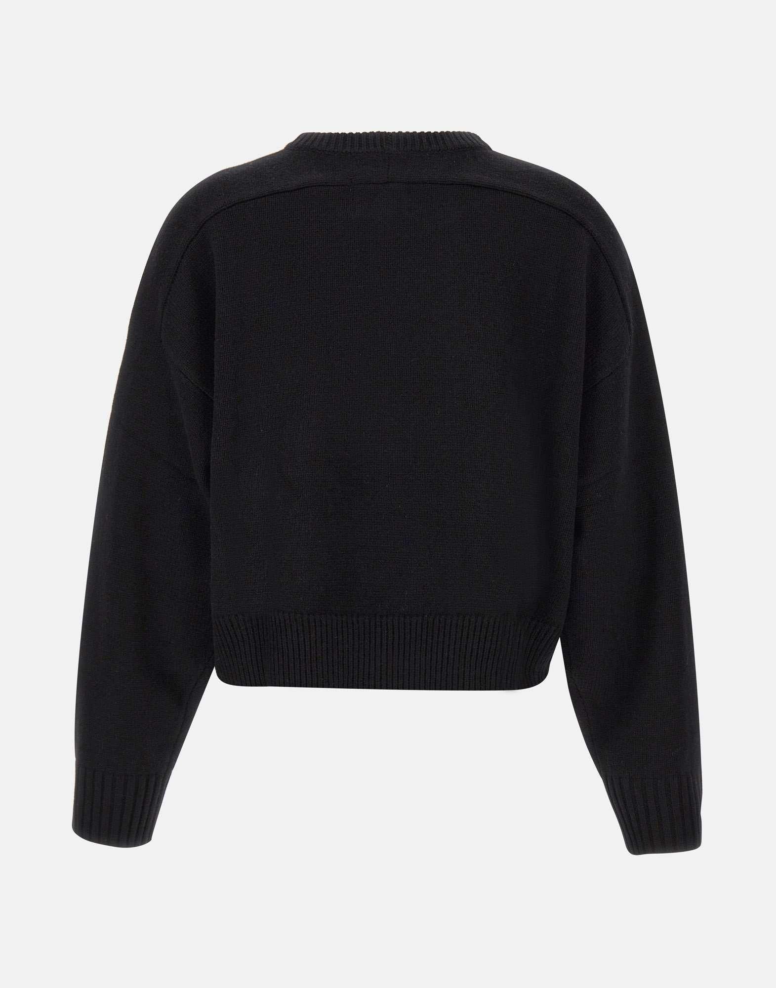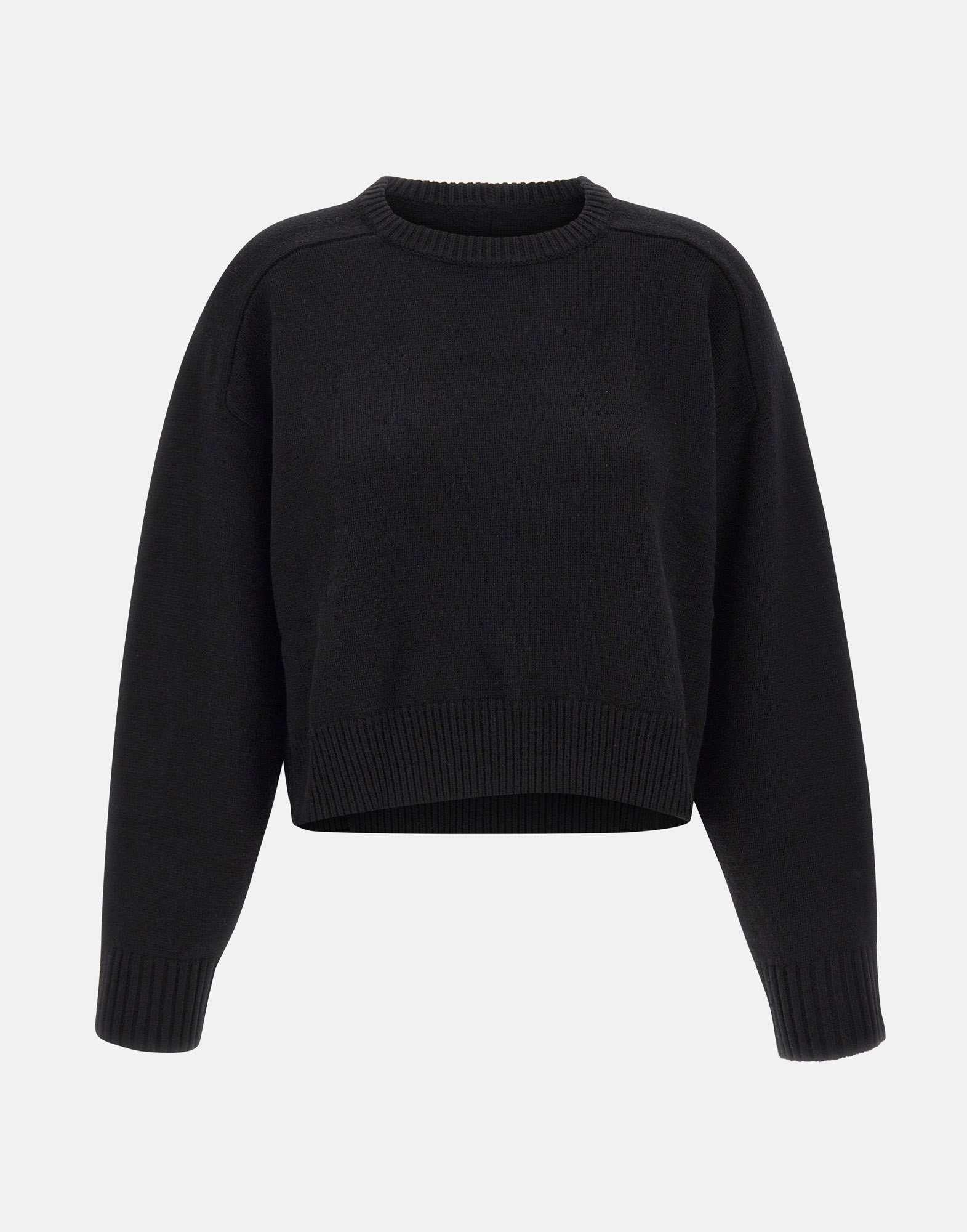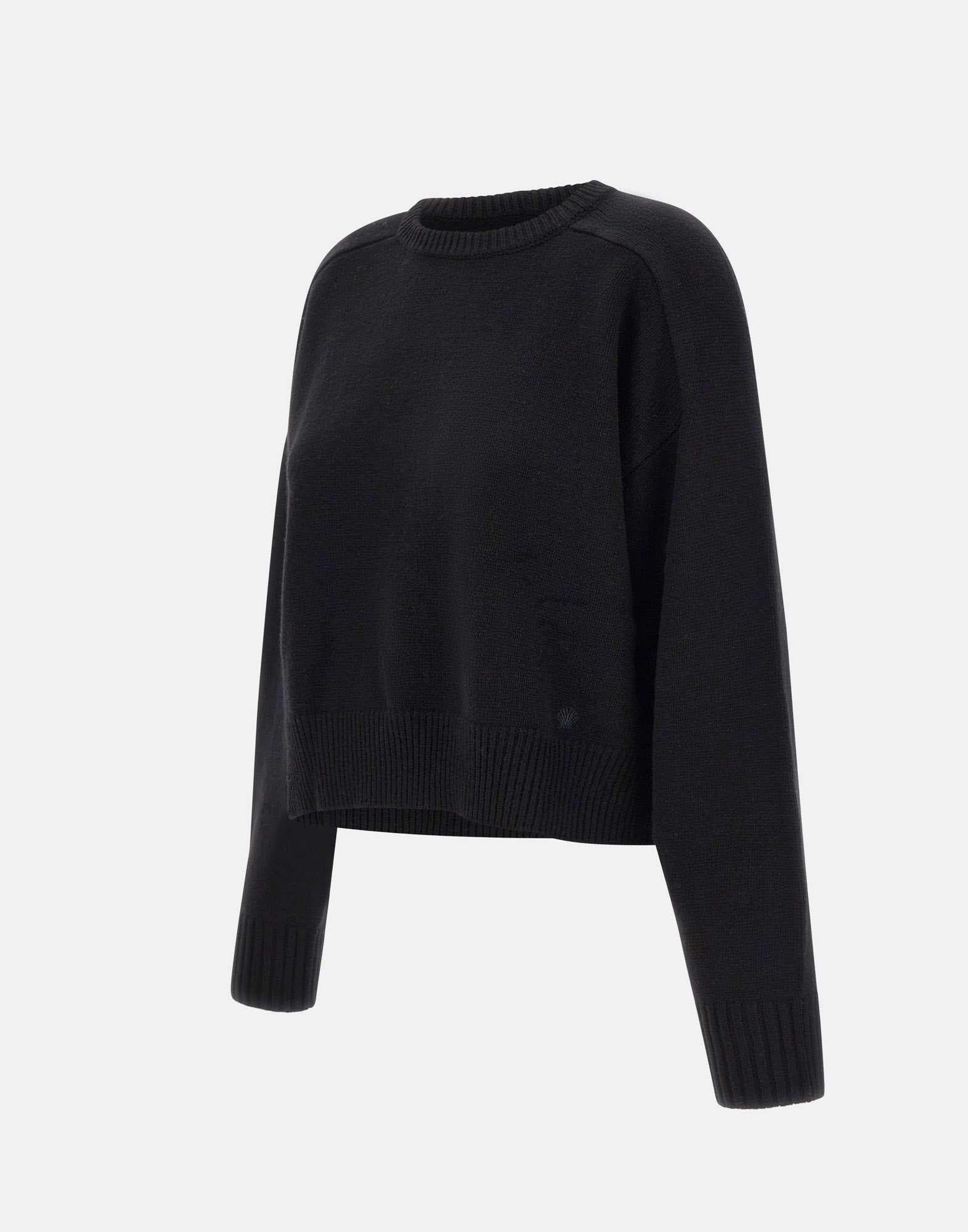 Maglia donna Loulou De Saison "Bruzzi LDS" in lana e cashmere color nero, emblema dello stile classico e raffinato del marchio. La vestibilità leggermente corta si combina a un ampio volume, mentre le maniche larghe e le spalle scese creano un look relaxed chic perfetto per ogni occasione. Il dettaglio ricamato a forma di conchiglia sul fondo sinistro aggiunge un tocco distintivo, completato da profili a coste e design cropped.