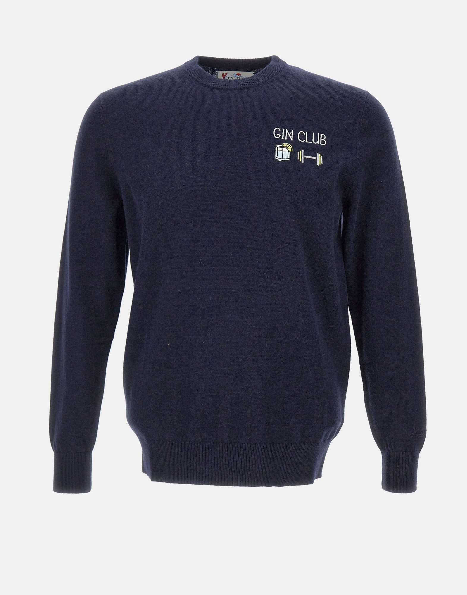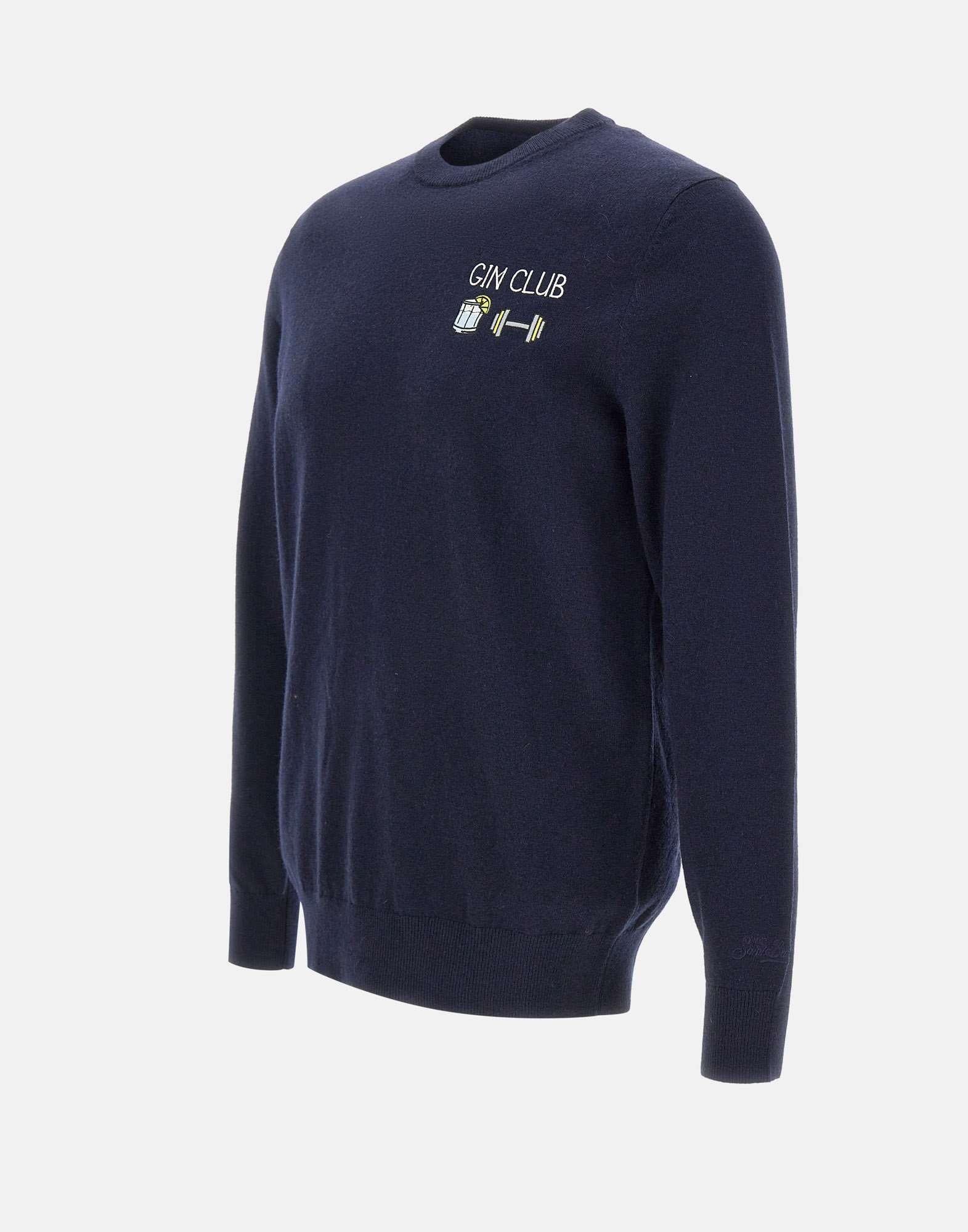 Mc2 Saint Barth "Heron Gin Club61" To Après Ski maglia colore blu navy realizzata in morbido filato caldo misto lana, ideale per le feste invernali. Presenta maniche lunghe, girocollo classico e bordi a costine per una vestibilità confortevole. Il logo a contrasto di colore e ricamo sul petto e sul polso aggiunge un tocco iconico e completa il design. Regular fit.