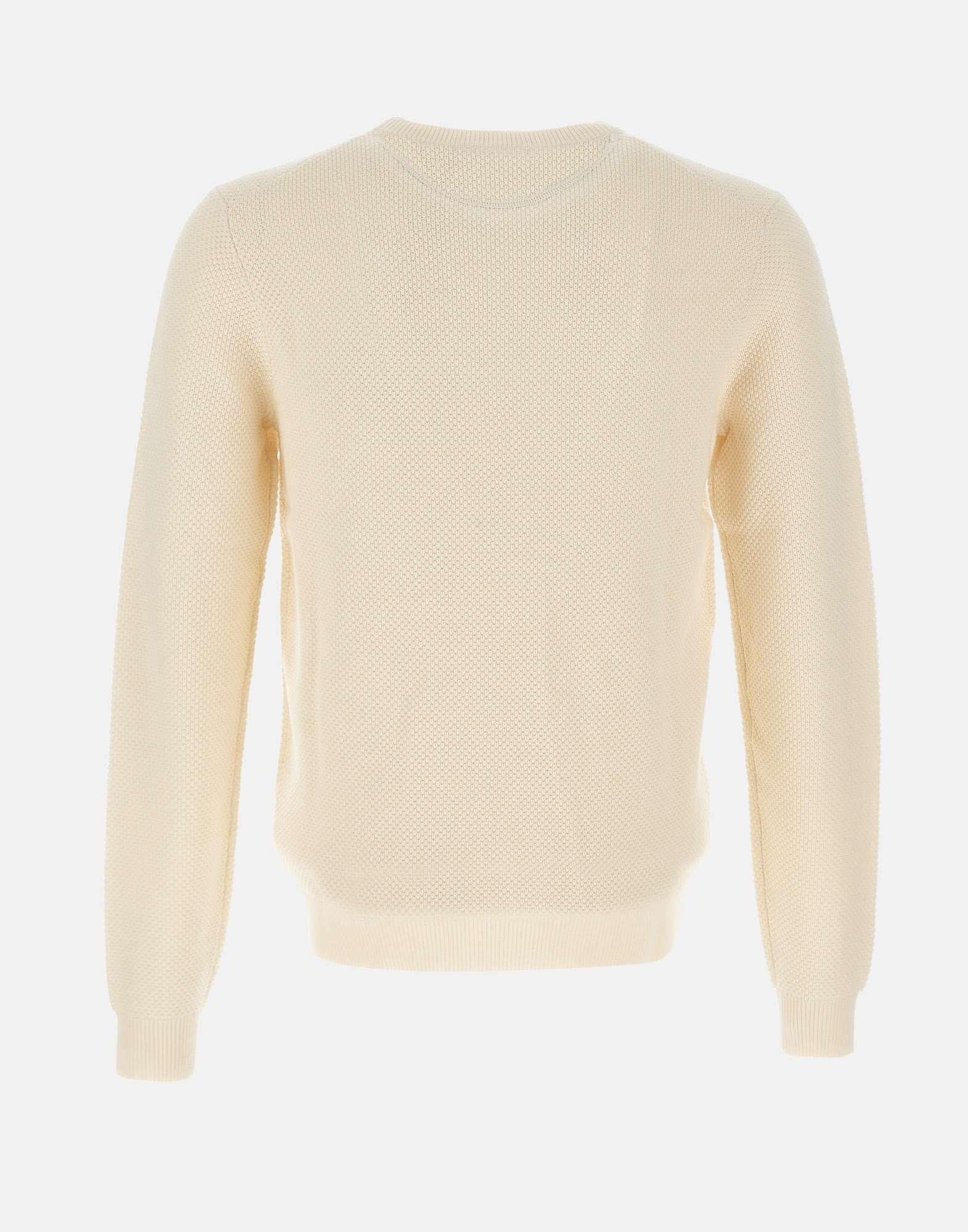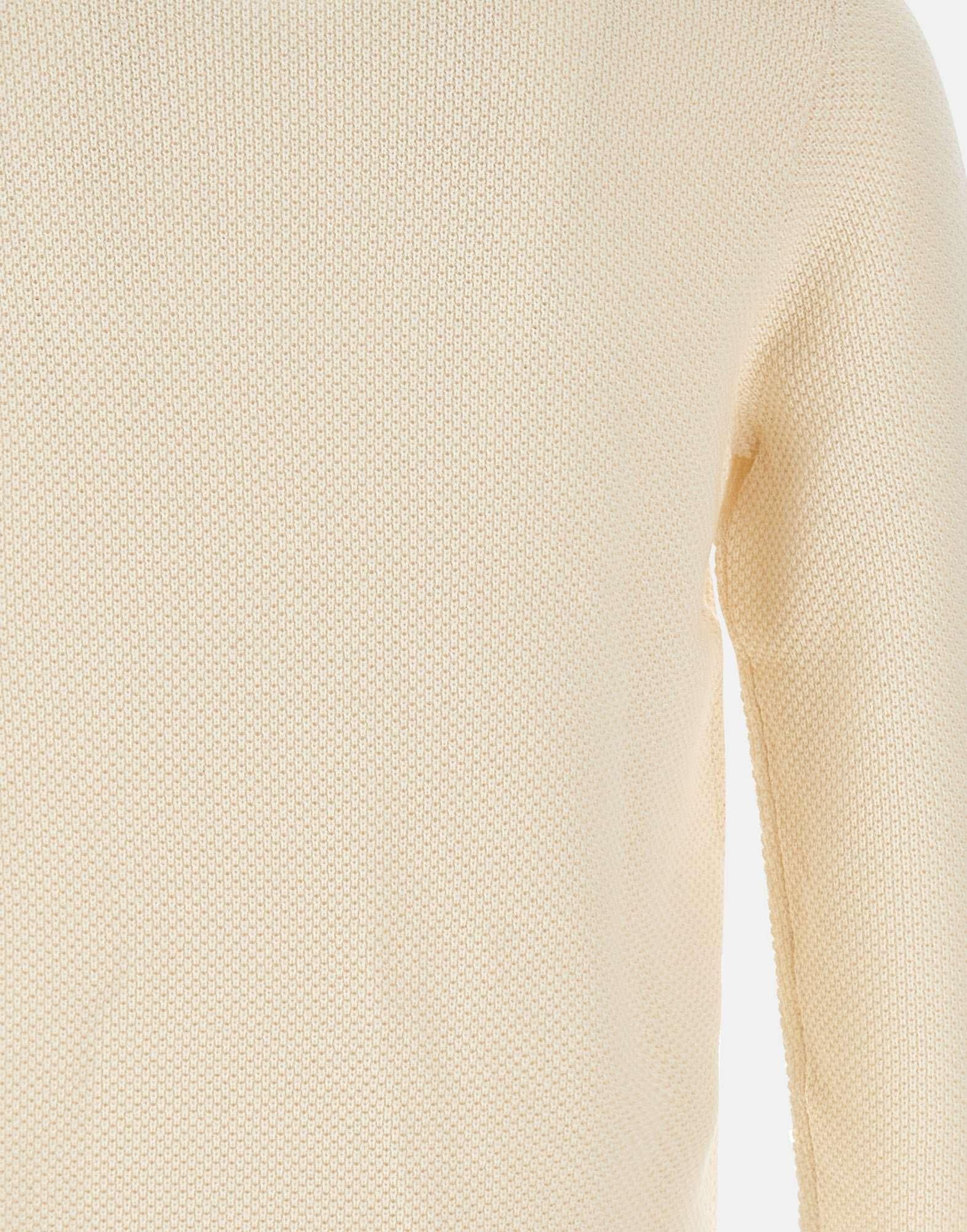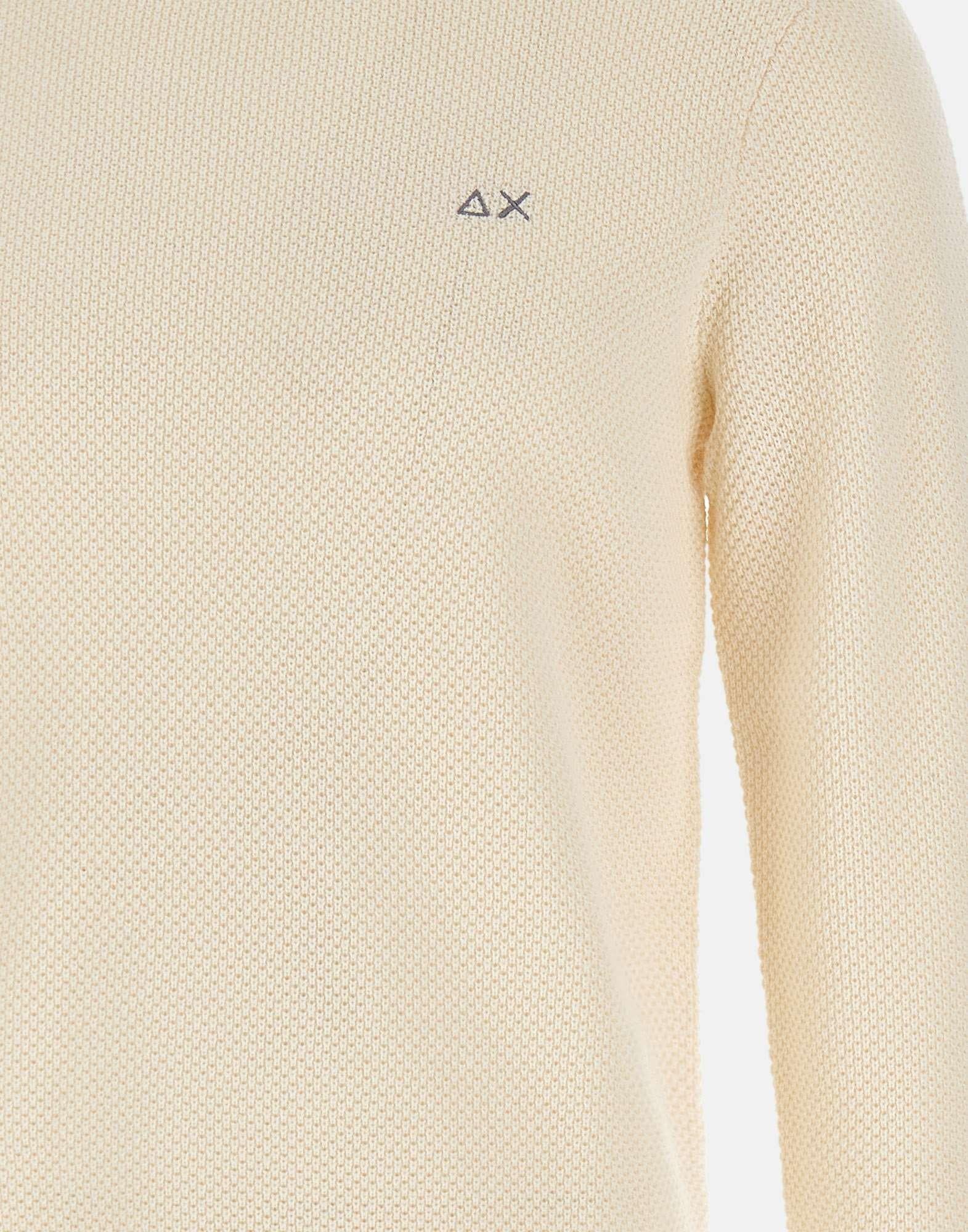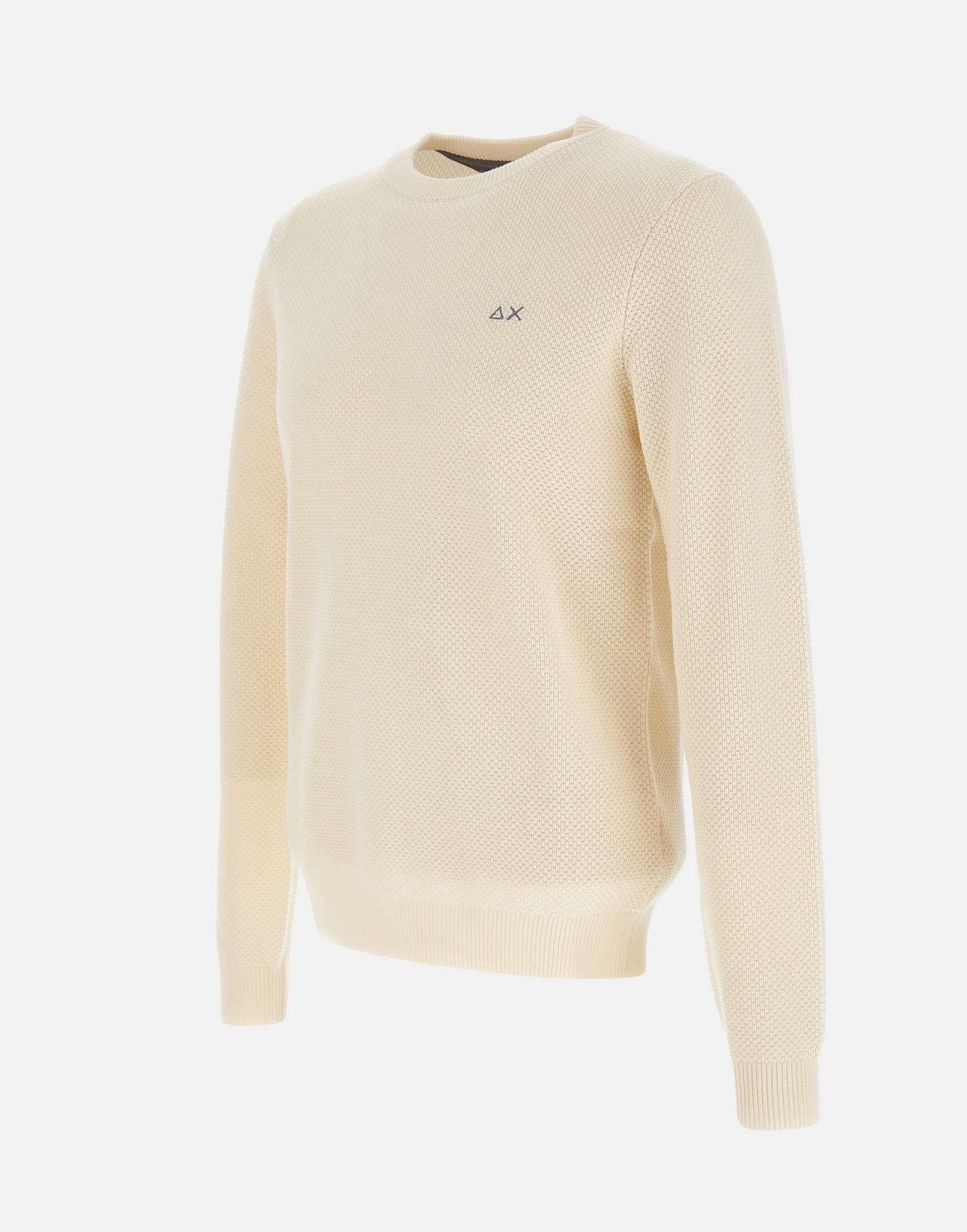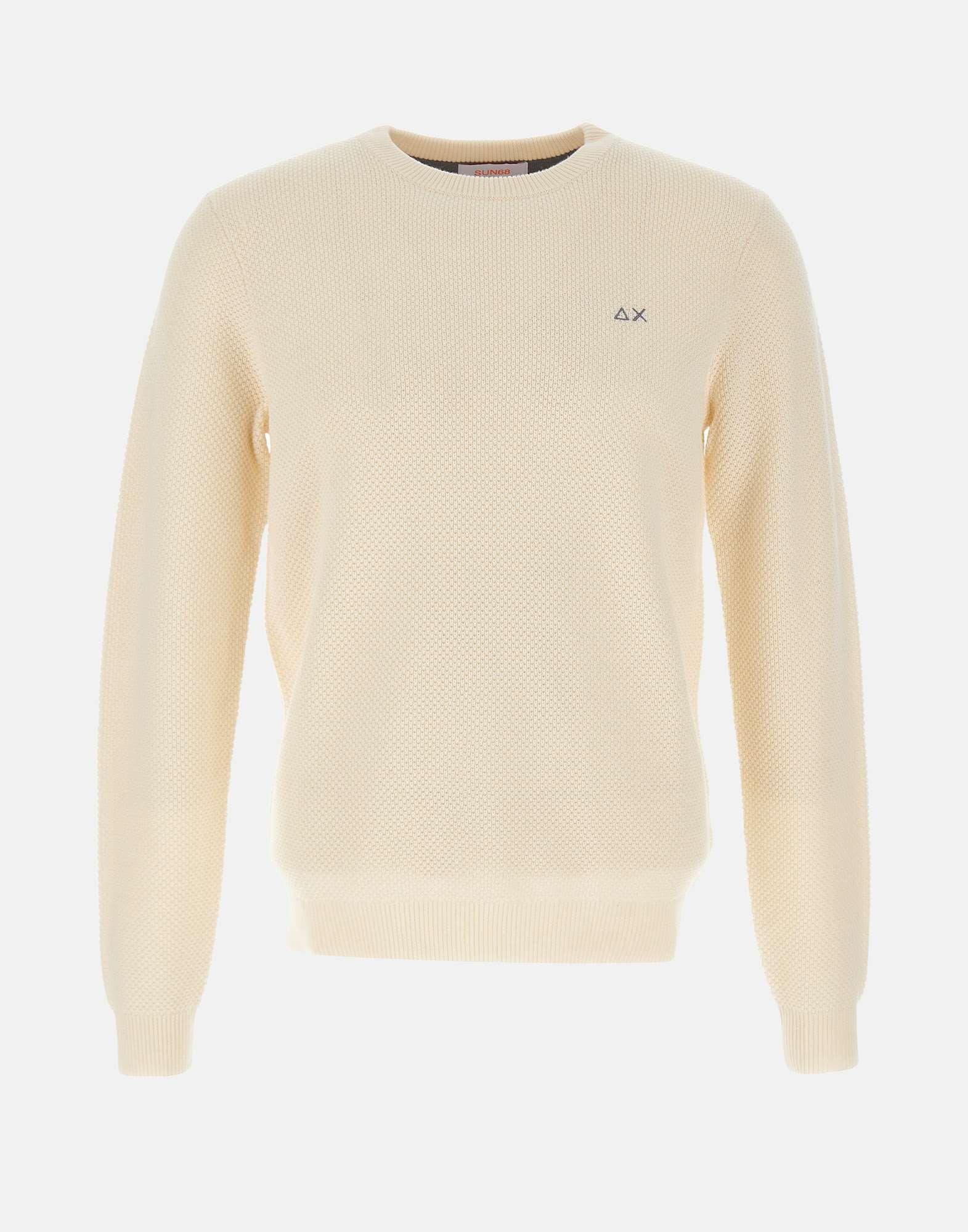 Maglia uomo Sun68 in filato di cotone e lana color panna, caratterizzata da una raffinata lavorazione a punto riso. Presenta girocollo, maniche lunghe e bordi a costine che garantiscono comfort e vestibilità ottimale. Il logo ricamato sul petto aggiunge un tocco iconico e distintivo. Regular fit, perfetta per look casual e contemporanei.