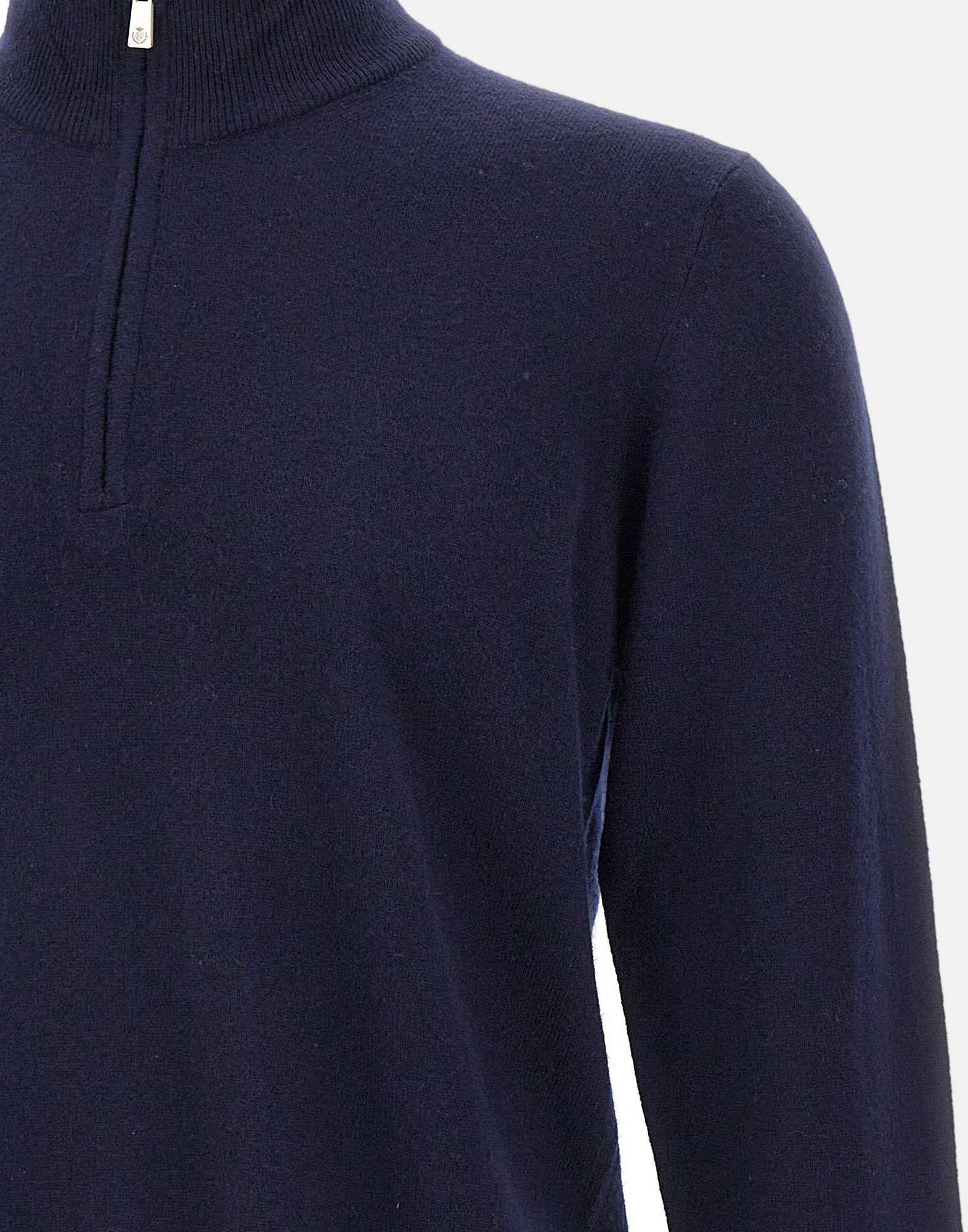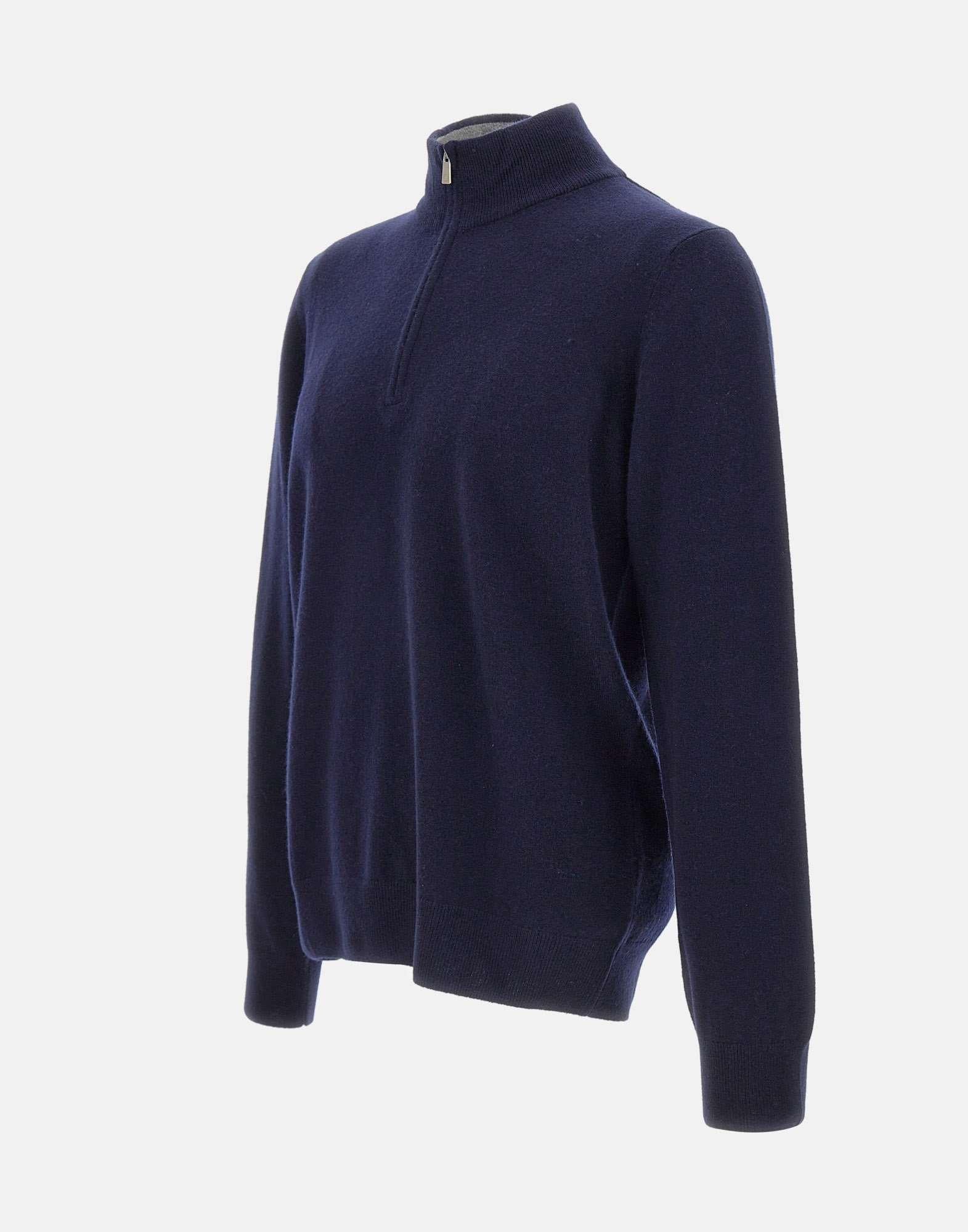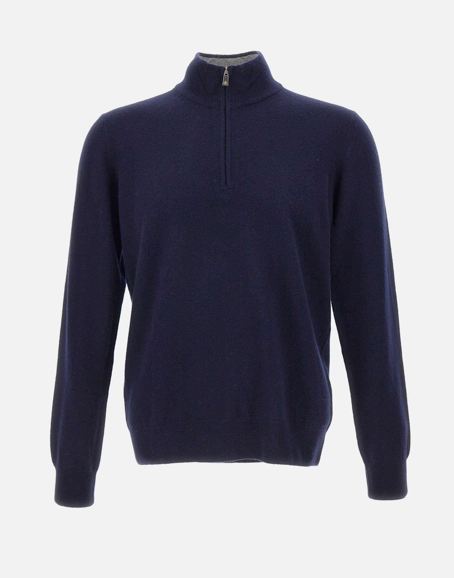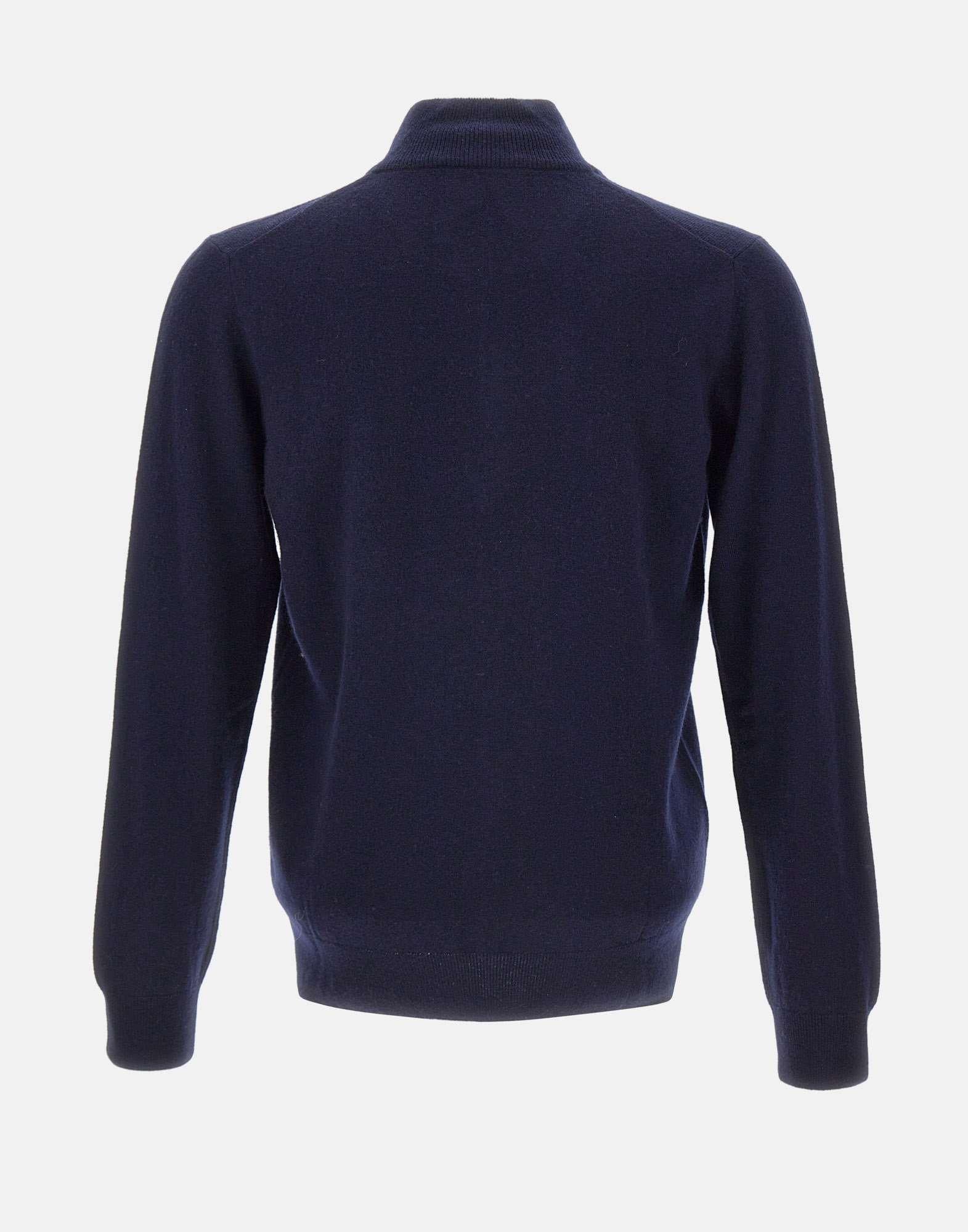 Maglia Della Ciana Cashmere colore blu navy, realizzata in pregiato misto lana e cashmere per una morbidezza e un calore unici. Design con colletto in piedi e chiusura a mezza zip, perfetta per uno stile raffinato e contemporaneo. Rifinita con bordi a costine su polsini e fondo per una vestibilità confortevole e duratura. Regular fit. Made in Italy, garanzia di qualità e artigianalità.