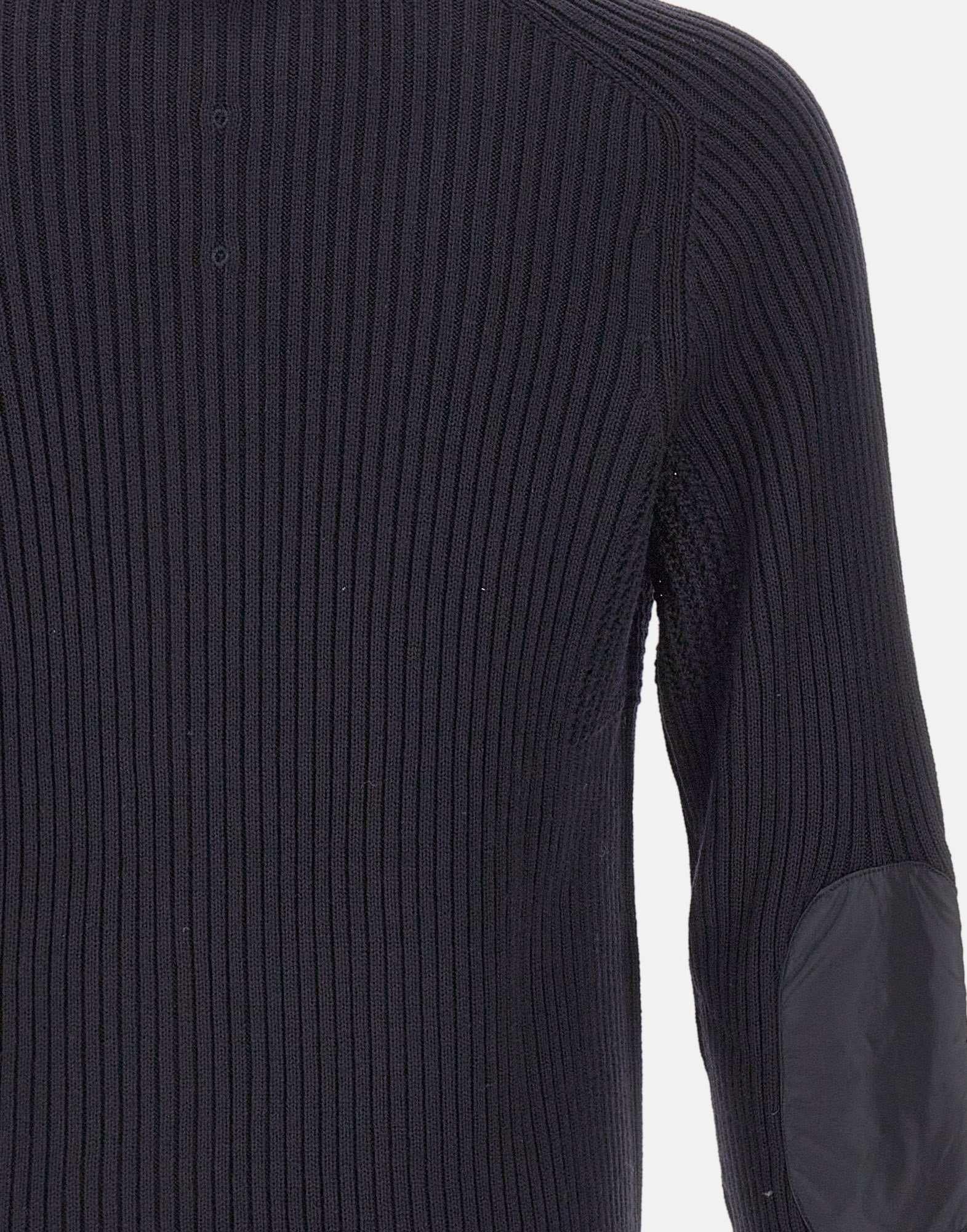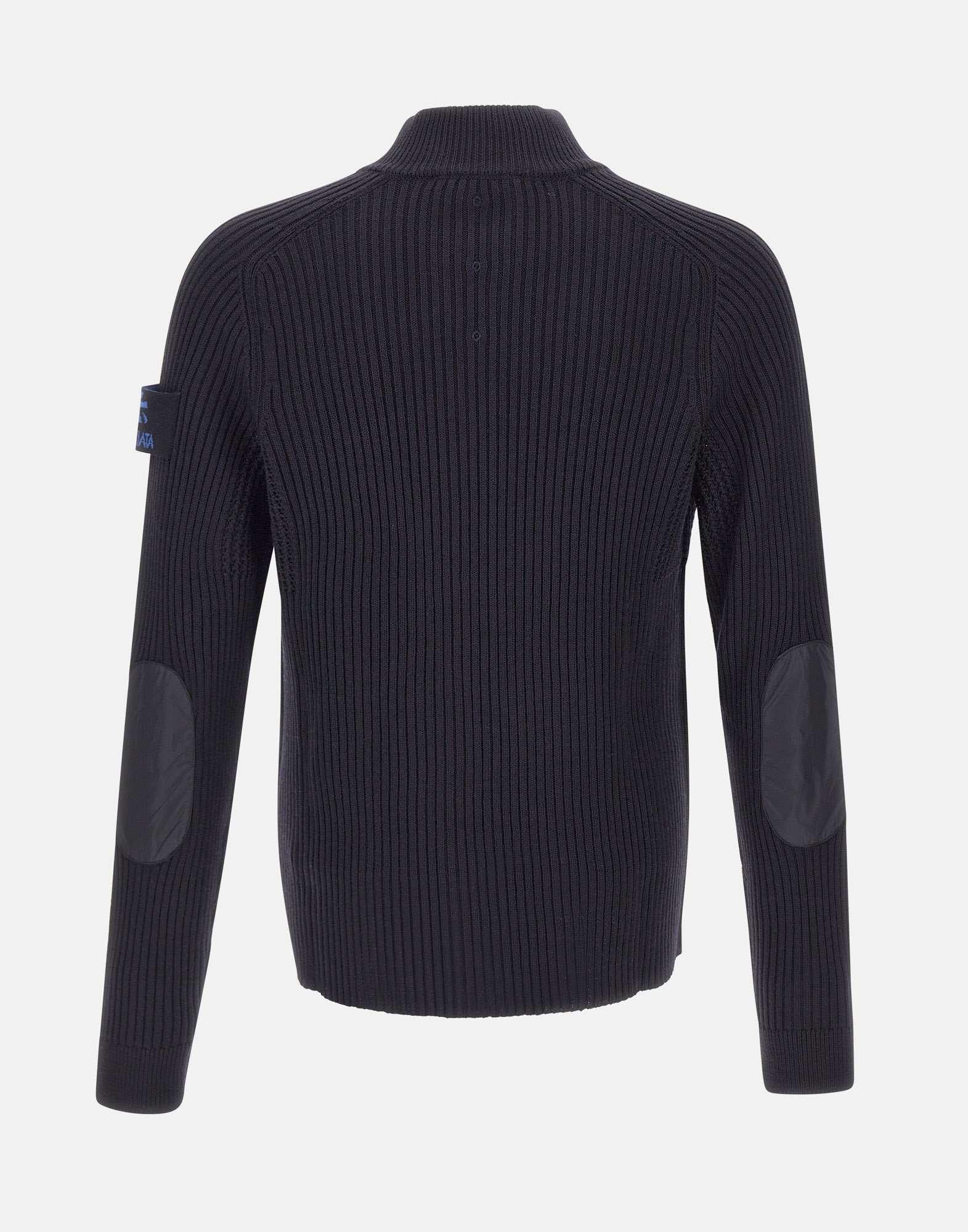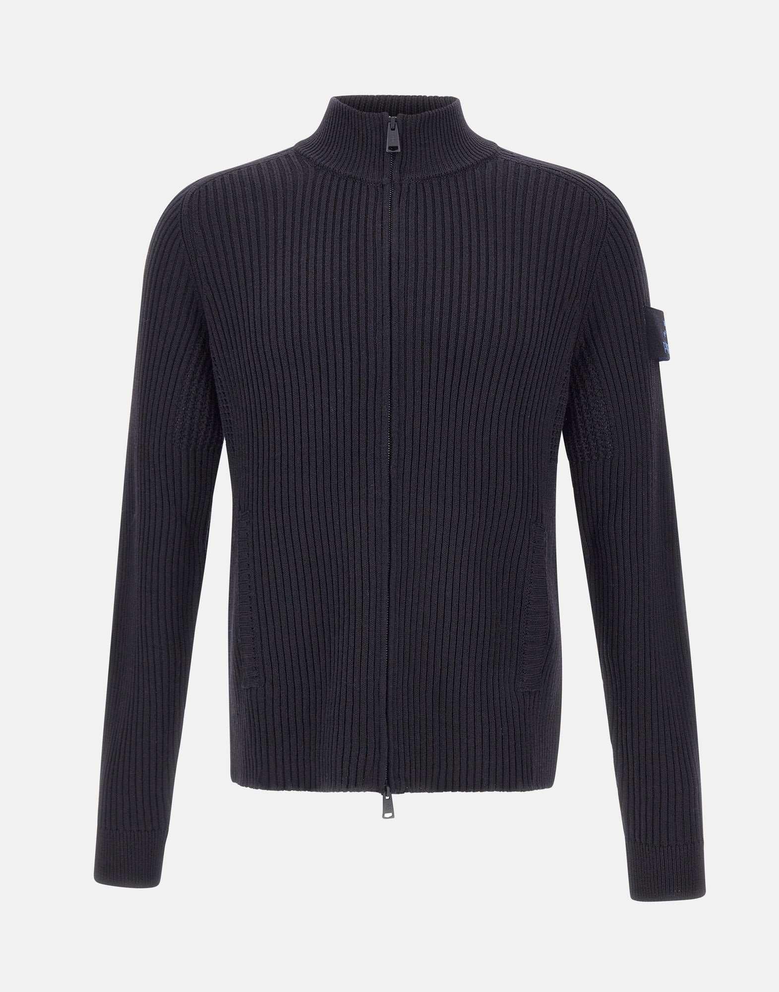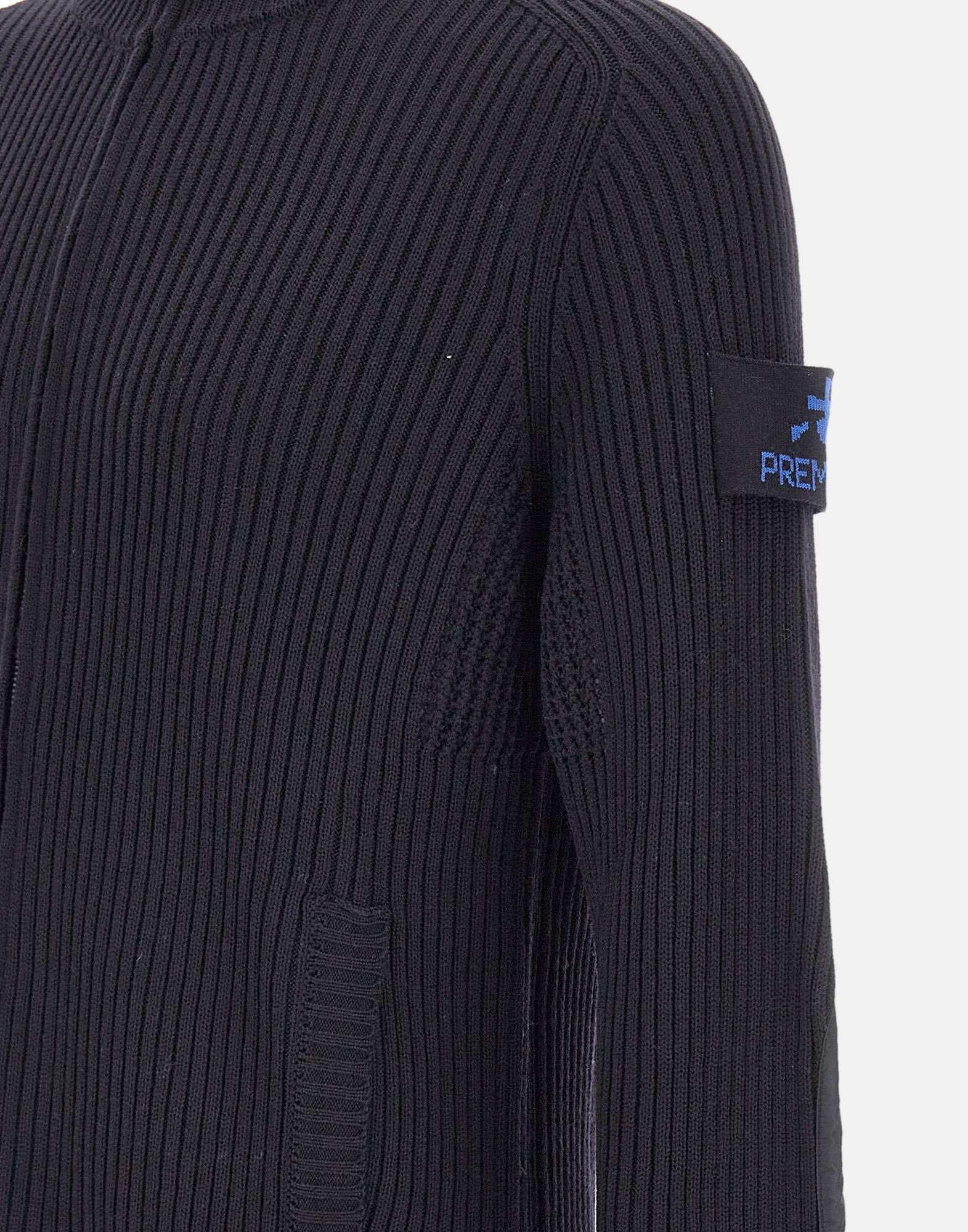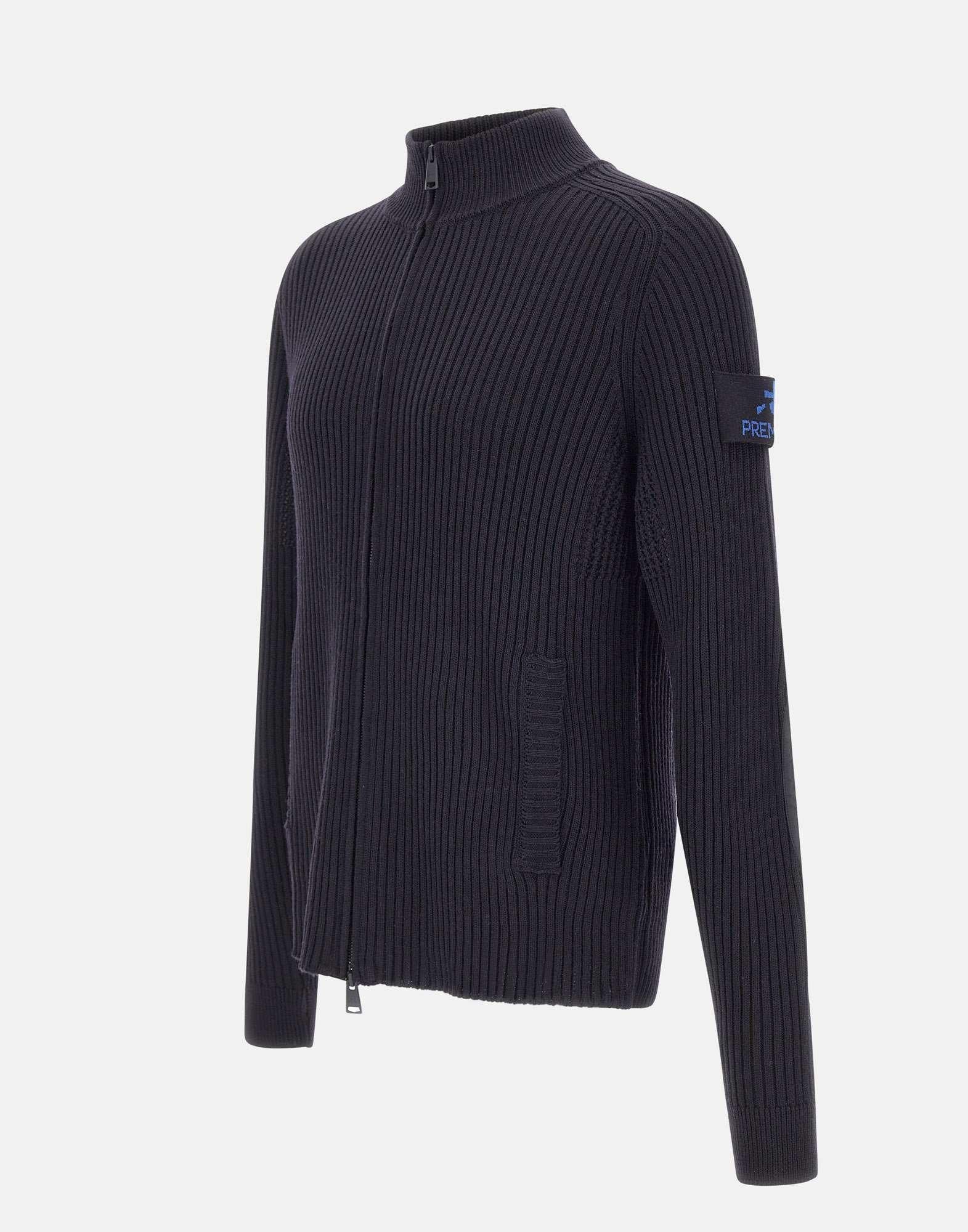 Premiata "Ribbed Zip Up Cardigan" colore blu, realizzato in pura lana 100% con trattamento Teflon water resistant che garantisce protezione e comfort. Il design presenta trama a coste verticali finezza 7, colletto alto, chiusura full zip, tasche laterali a filo e toppe in nylon sui gomiti che aggiungono un tocco tecnico. Rifinito con logo sulla manica sinistra, è un capo caldo, resistente e versatile, perfetto per un look casual sofisticato. Motivo traforato sotto il giromanica. Regular fit.