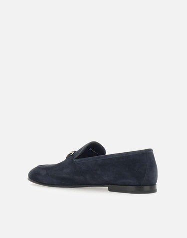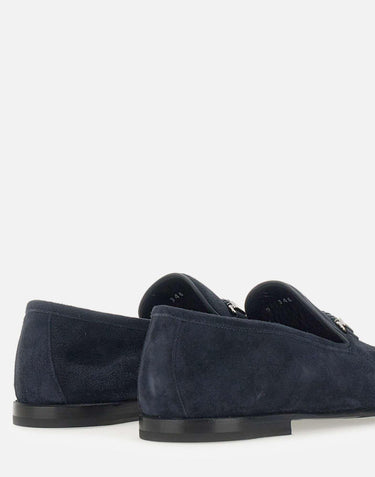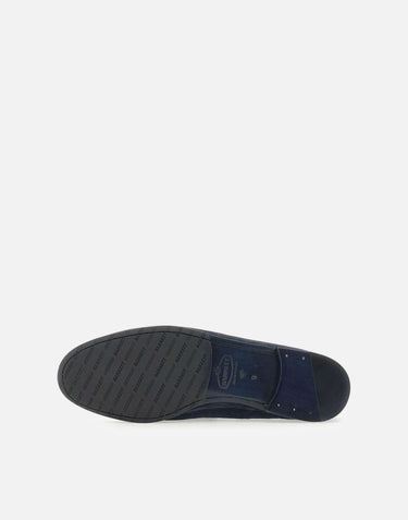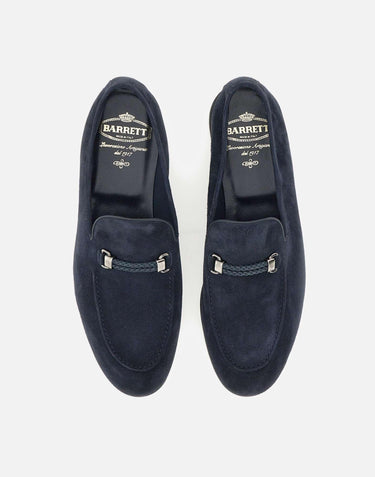 Mocassini Barrett "241U" in morbidissimo camoscio, blu, punta stondata, impunture artigianali a vista, morsetto decorativo con accessorio in metallo e doppio filo ad intreccio, interno in pelle con soletta logata, costruzione Blake suola in cuoio e gomma, tacco 1cm, calzata regolare. Made in Italy. Custodia singola in tessuto inclusa.