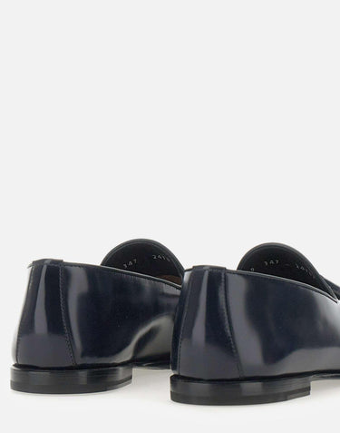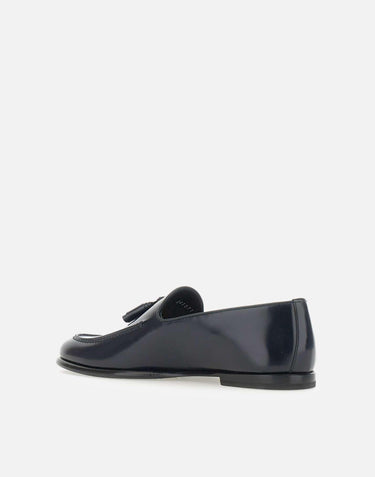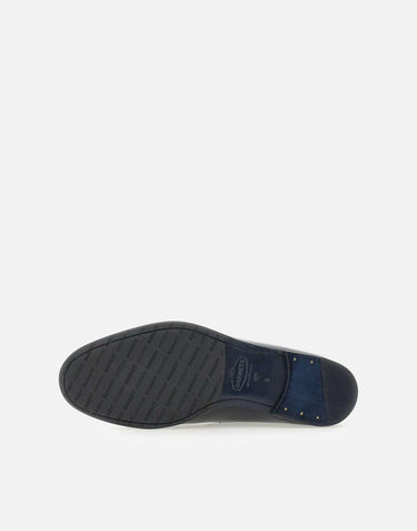 Mocassini Barrett "241UAncora" in morbidissima pelle spazzolata, blu notte, punta stondata, impunture artigianali a vista, nappina decorativa, interno in pelle con soletta logata, costruzione Blake con suola in pelle e gomma, tacco 1cm, calzata regolare. Made in Italy. Custodia singola in tessuto inclusa.