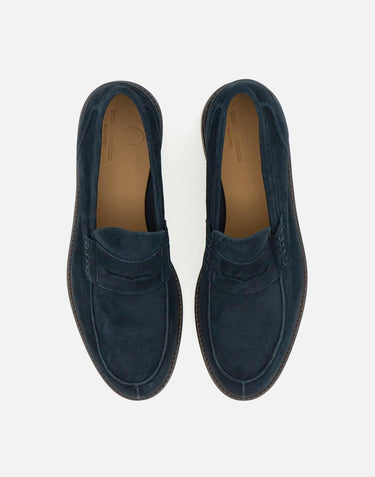 Mocassini uomo Duca Degli Abruzzi "Amalfi" in pelle scamosciata con finitura ingrassata, colore blu notte, impunture artigianali a vista, mascherina decorata, interno in morbida pelle, soletta logata, suola in cuoio a contrasto di colore, tacco 2cm. Made in Italy.Calzata regolare