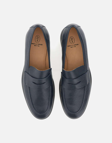 Mocassini "Piero4" Duca Degli Abruzzi in pelle grana martellata dollaro-cervo, colore blu navy, mostrina decorata, punta tonda, soletta logata, interno in morbidissima pelle, impunture artigianali a vista, suola in gomma, tacco 2cm, custodia inclusa, made in Italy.