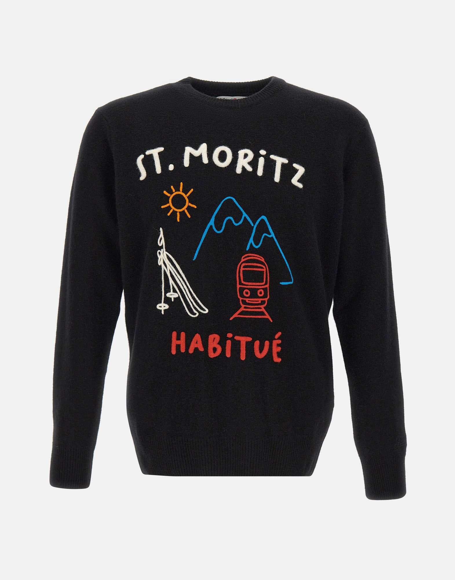 Maglia uomo MC2 Saint Barth "Heron St. Moritz draw" in misto lana color nero, impreziosita da ricamo e disegno St. Moritz in contrasto sul fronte. Il modello presenta girocollo, orlo e polsini a costine, con logo ricamato sul polsino che aggiunge un dettaglio distintivo. Realizzata con filati di alta qualità, offre una vestibilità regolare e un comfort impeccabile. Un capo dallo stile raffinato, ideale per l'inverno e perfetto per look casual chic. Made in Italy.