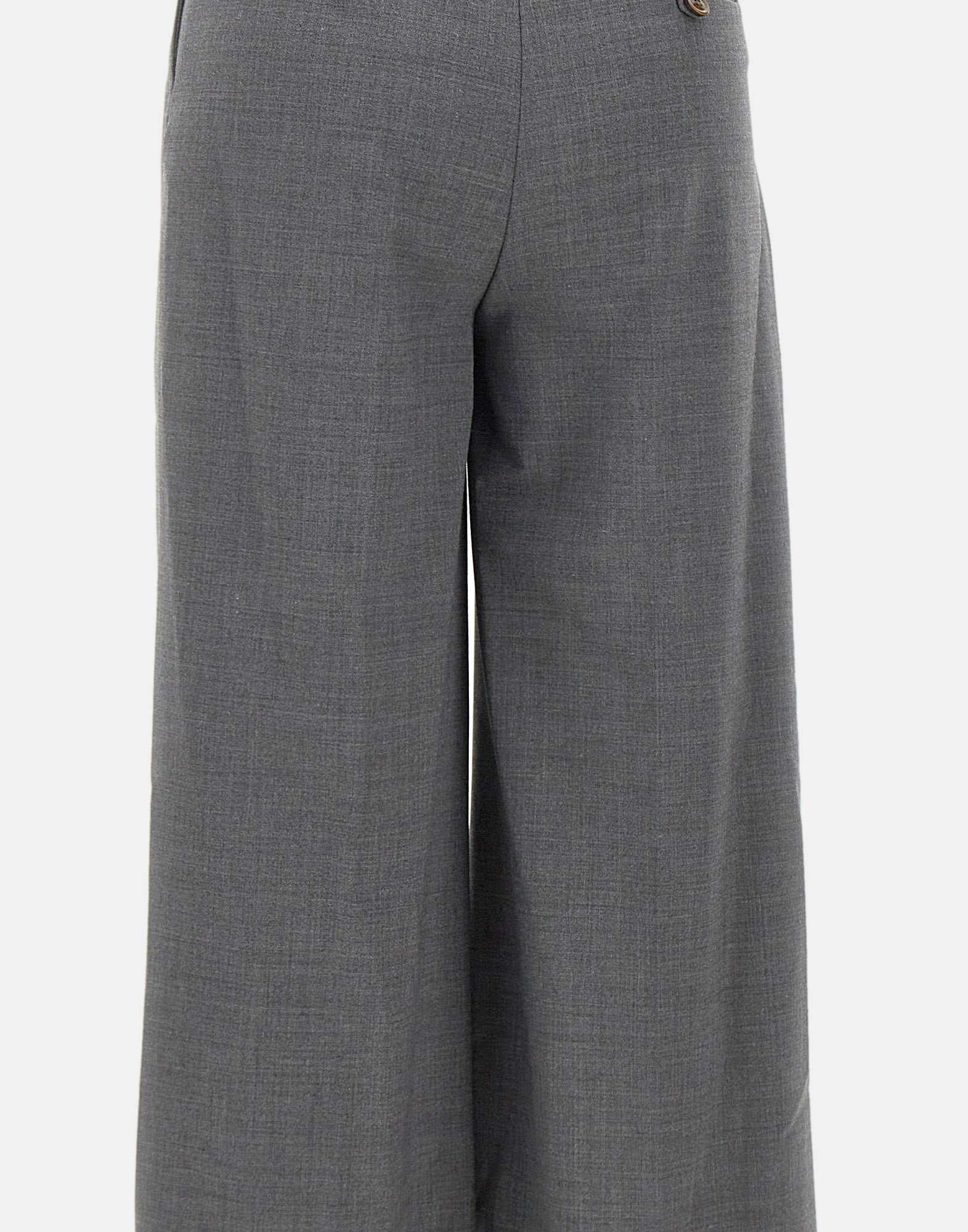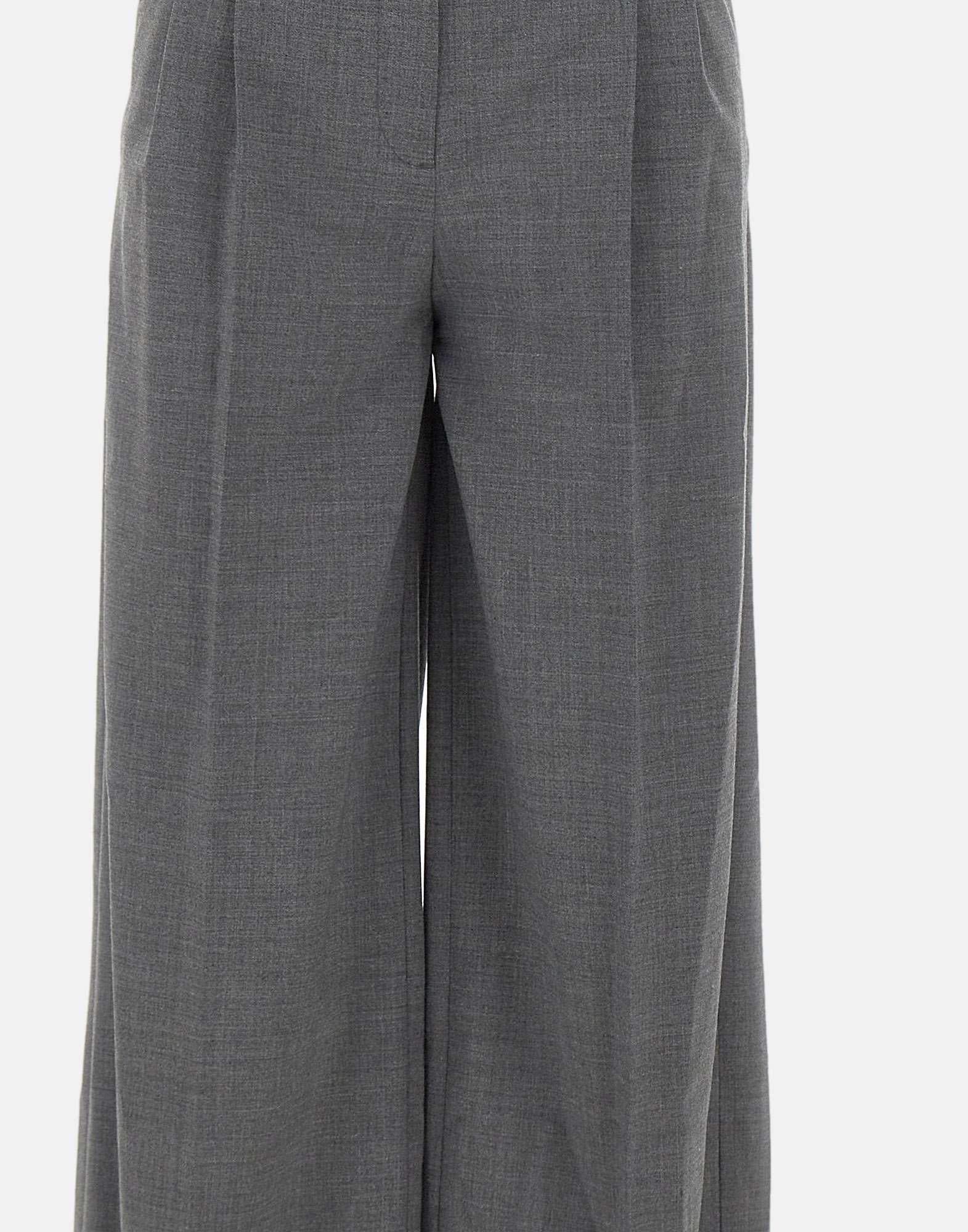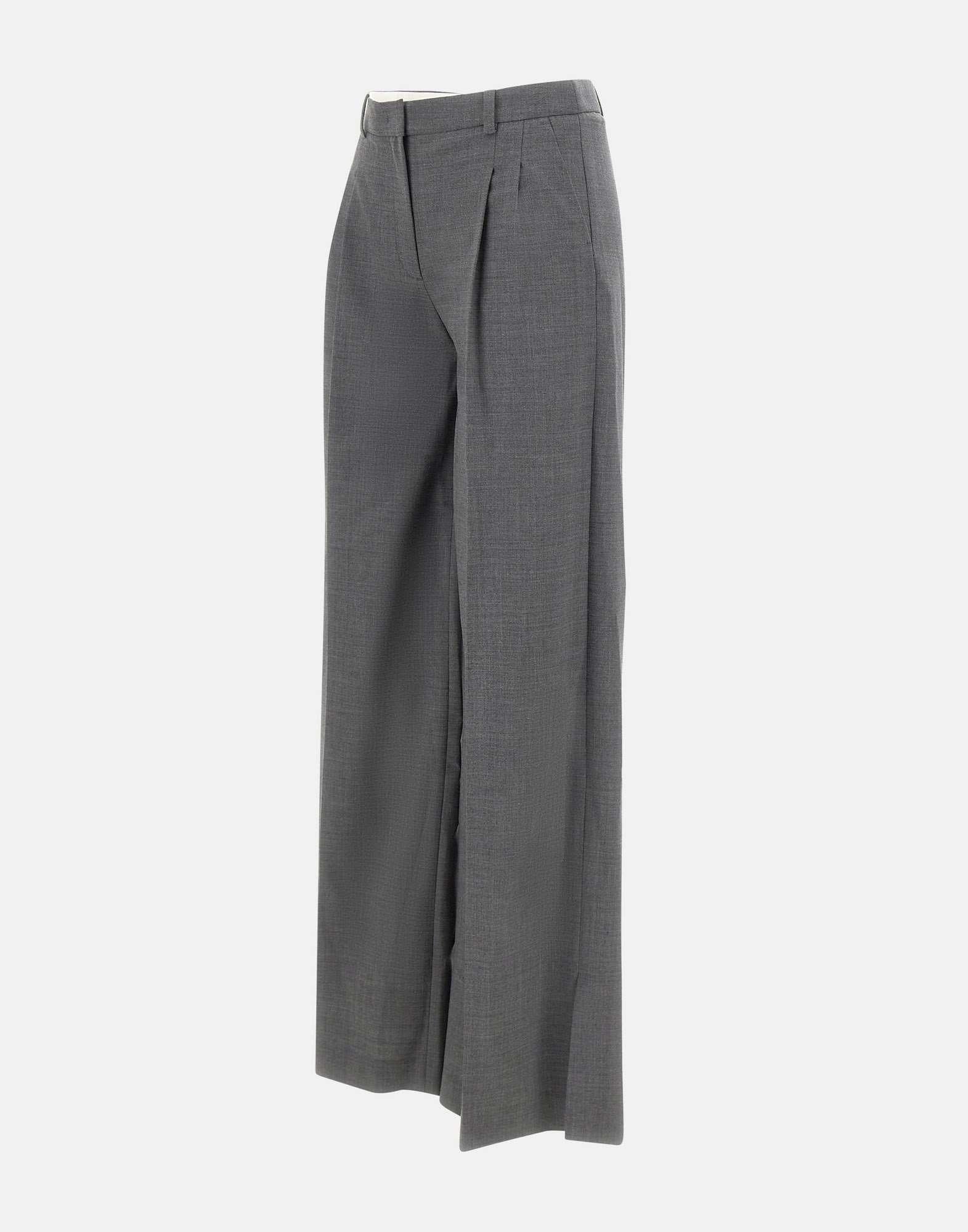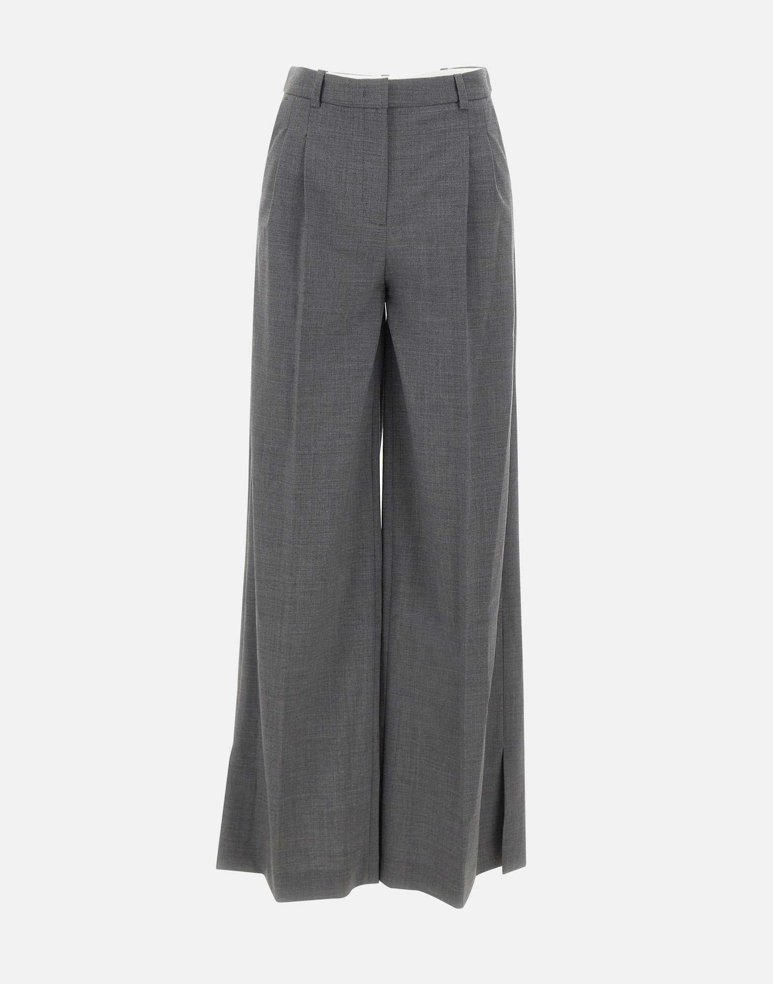 Pantaloni donna The Garment "Grand Pants" in misto lana grigio, dal taglio sartoriale e dalla linea elegante. Caratterizzati da vita alta, gamba larga e fondo ampio da 31 cm con sottili spacchi laterali sullorlo, offrono una silhouette fluida e contemporanea. Presentano chiusura con zip e gancetto metallico, due tasche frontali, una tasca posteriore con bottone e passanti in vita per cintura. Vestibilità regular, ideale per look sofisticati e versatili.