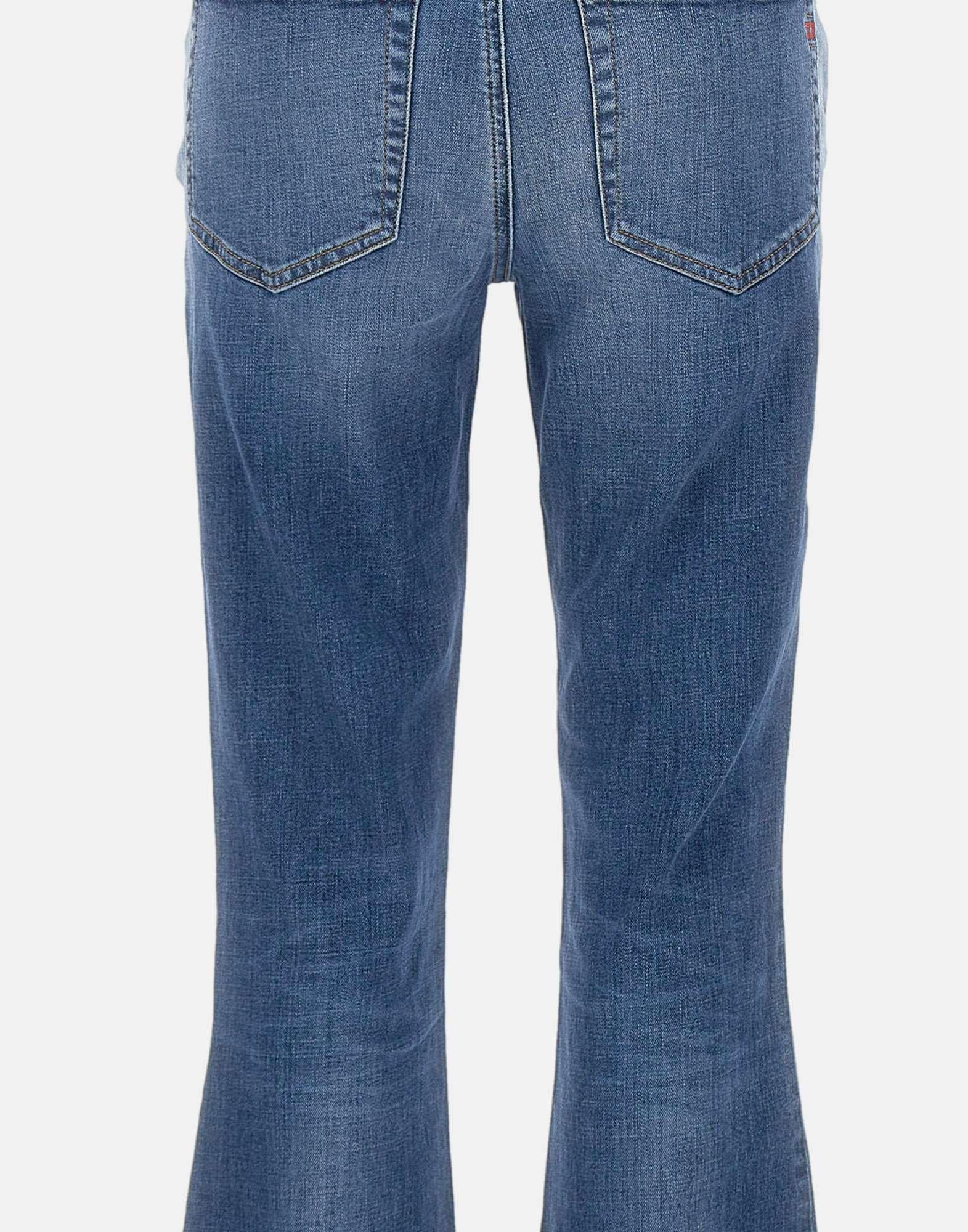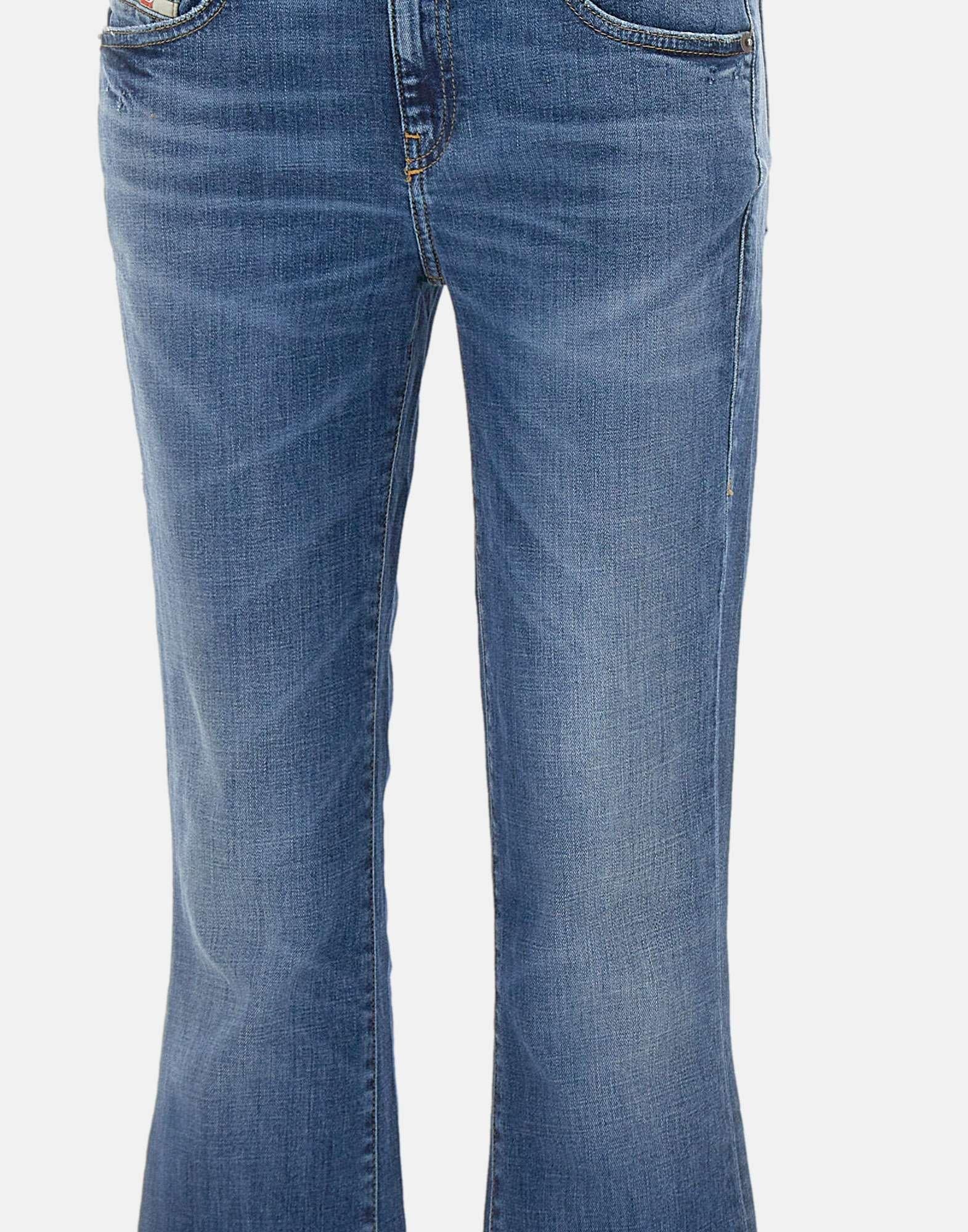 Jeans donna Diesel "1969 D-Ebbey" in denim stretch blu medio, dal fit bootcut con vita bassa sagomata e gamba slim. Il modello avvolge il corpo dai fianchi alle ginocchia, slanciando la figura grazie al fondo leggermente svasato da 21 cm. Realizzato con cotone parzialmente riciclato, è parte della linea DNA Diesel, emblema dellautenticità del brand. Il lavaggio presenta whisker frontali e sfumature effetto vissuto che ne esaltano il carattere contemporaneo e versatile.