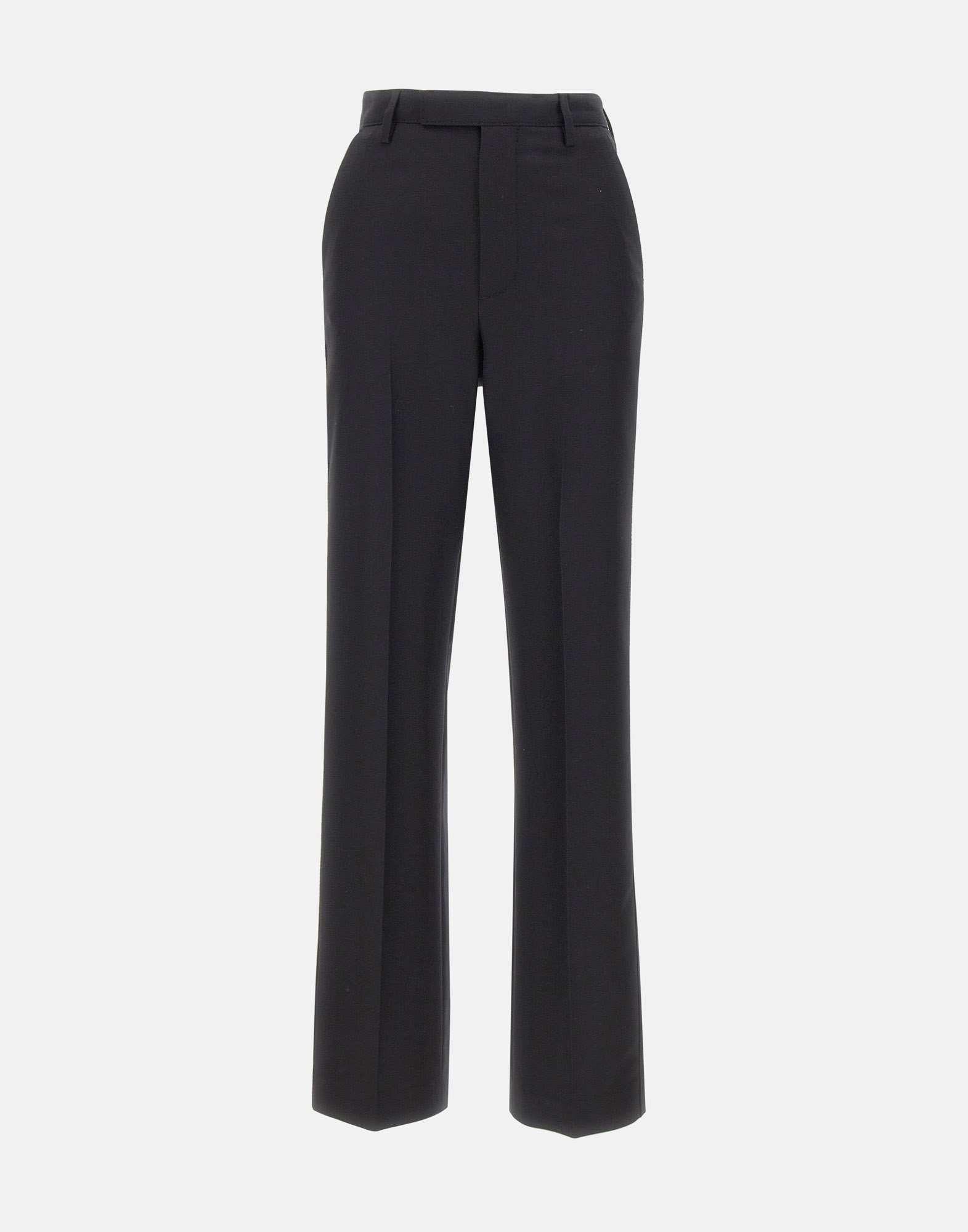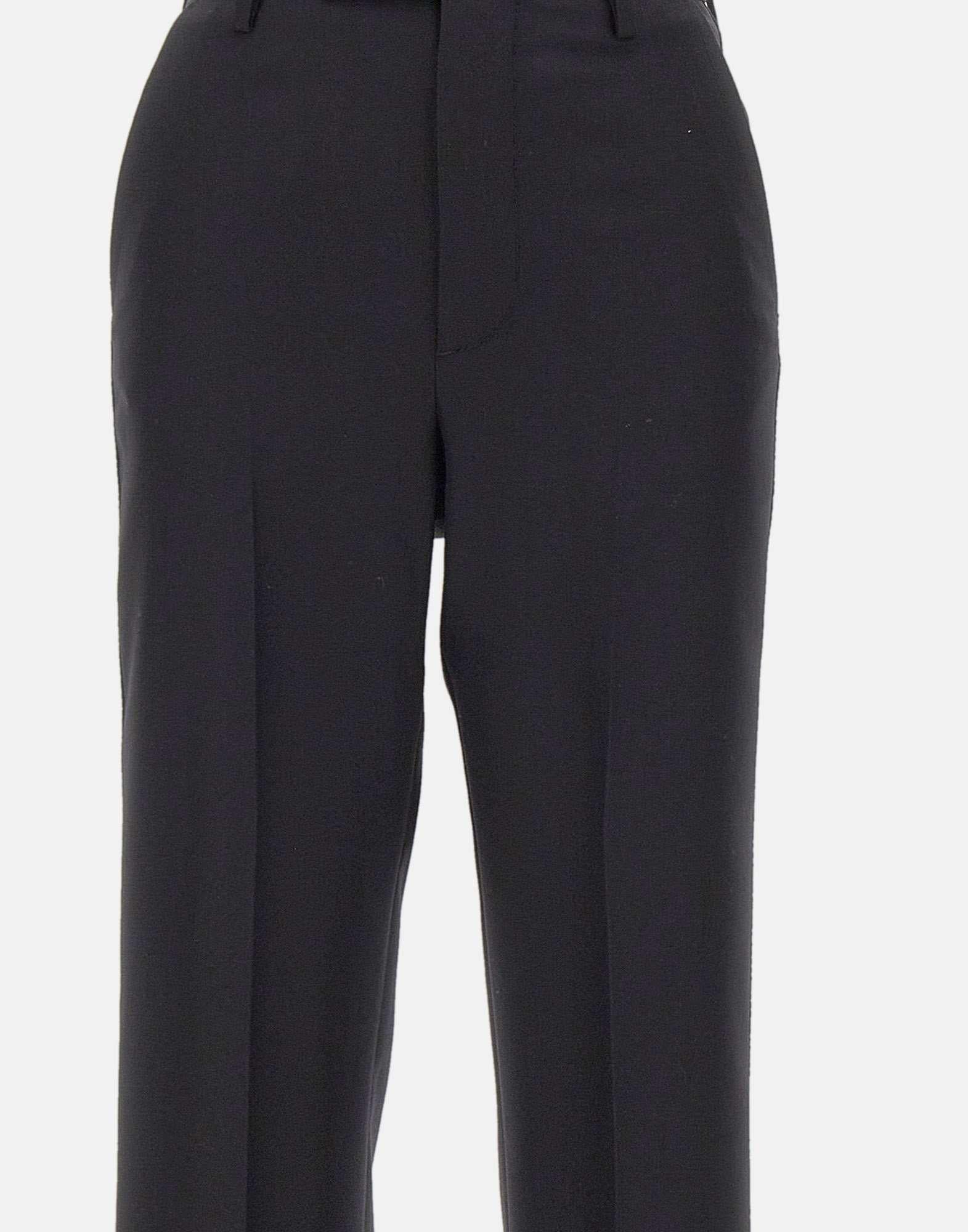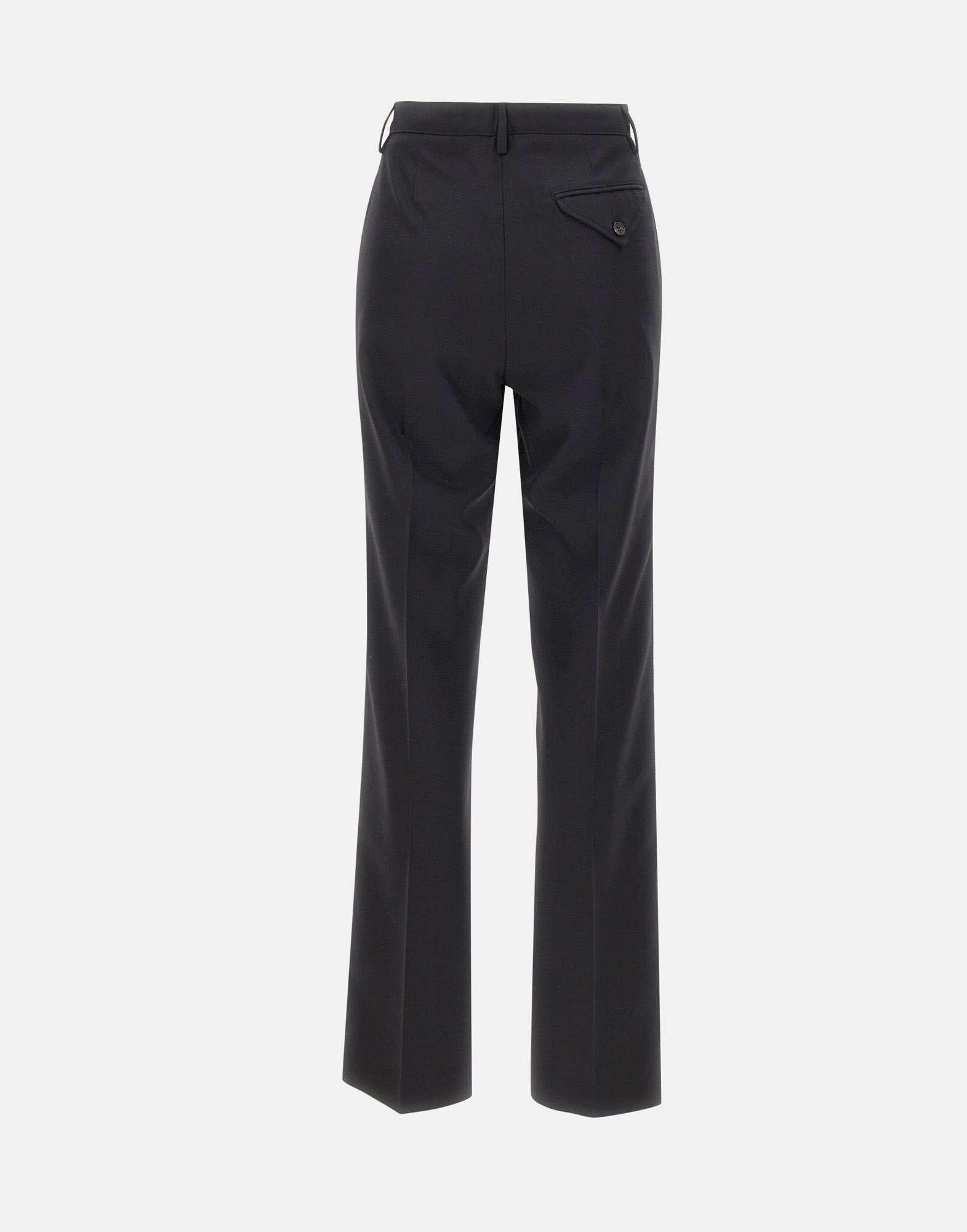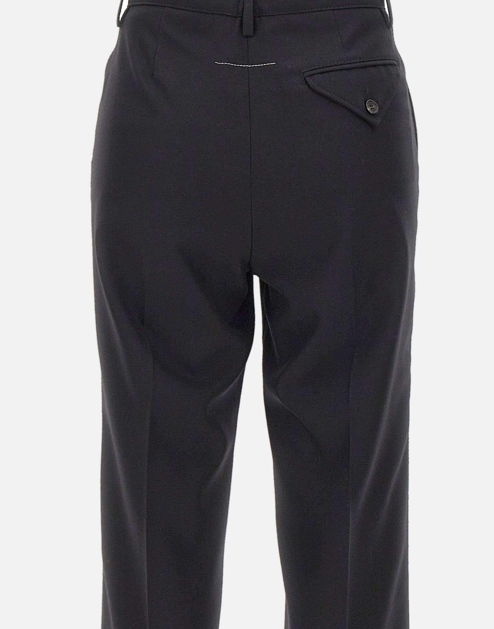 Pantaloni sartoriali donna MM6 Maison Margiela in lana nera, esempio di ibridazione tra tailoring classico e visione concettuale. La linea dritta della gamba è interrotta da pannelli laterali in raso lucido che rivelano la costruzione interna del capo, mentre le cuciture a vivo evocano la tecnica del pannello ridotto, lasciando volutamente visibile il tessuto in eccesso. Presentano tasche laterali a bustina, tasche posteriori a filetto, pieghe stirate, passanti per cintura e liconica impuntura bianca sul retro, firma discreta della Maison. Realizzati in Italia. Fondo ampio 22cm.