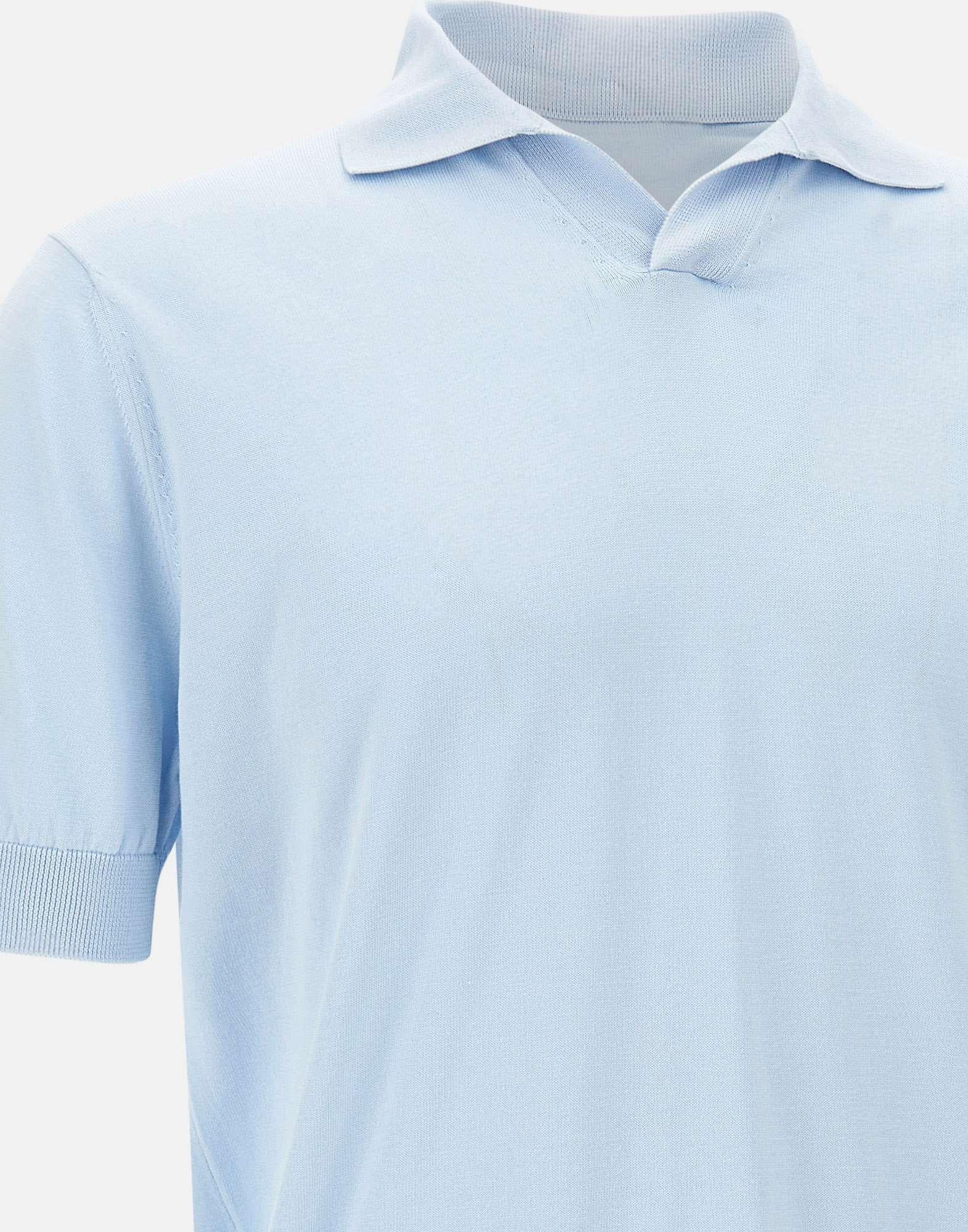 Polo uomo Filippo De Laurentiis realizzata in morbido cotone color celeste, pensata per un'eleganza essenziale e contemporanea. Il modello presenta maniche corte e colletto con apertura a V senza bottoni, per un look pulito e raffinato. Gli orli a costine definiscono la linea e assicurano una vestibilità ordinata, mentre il regular fit garantisce comfort e versatilità nell'uso quotidiano. Un capo di maglieria uomo di alta qualità, interamente Made in Italy.