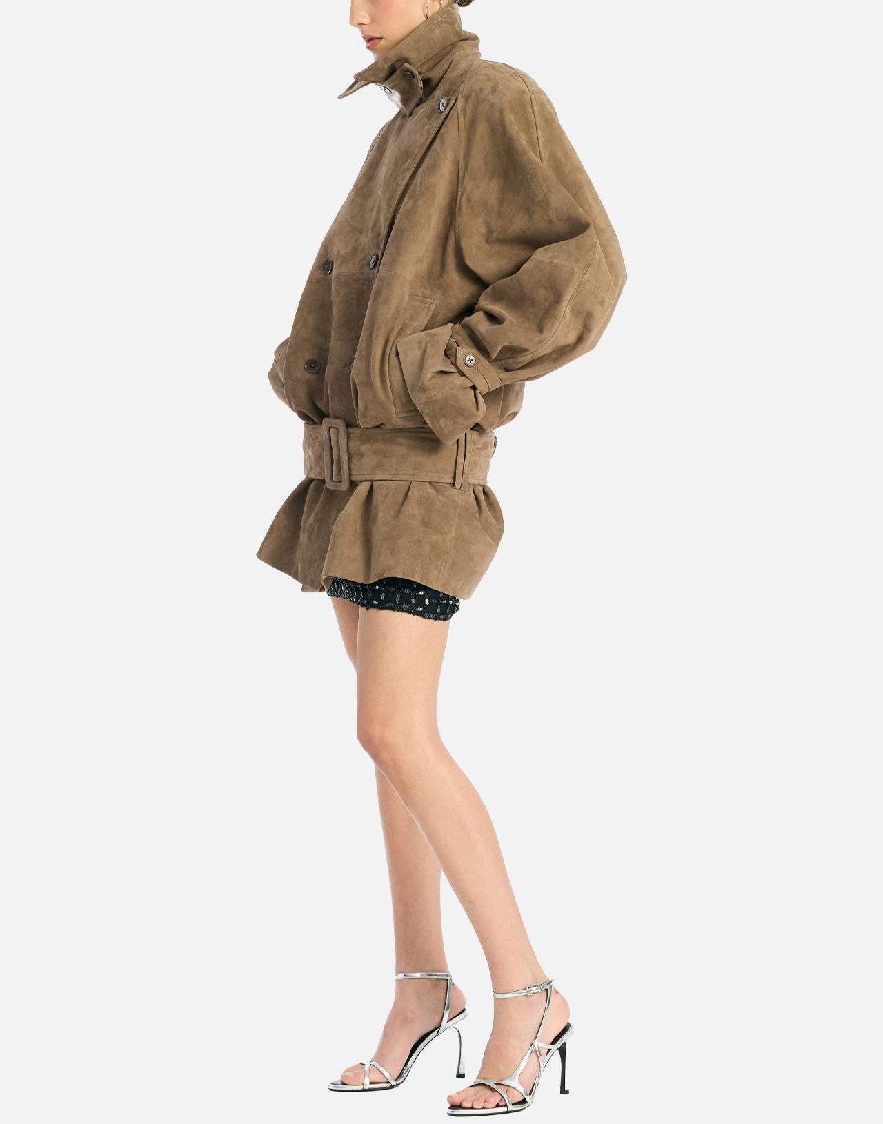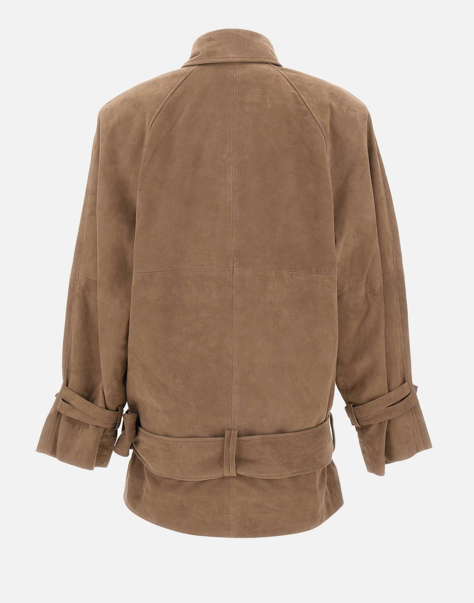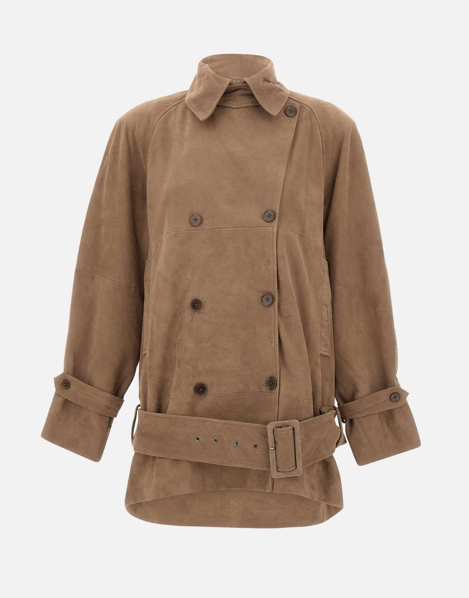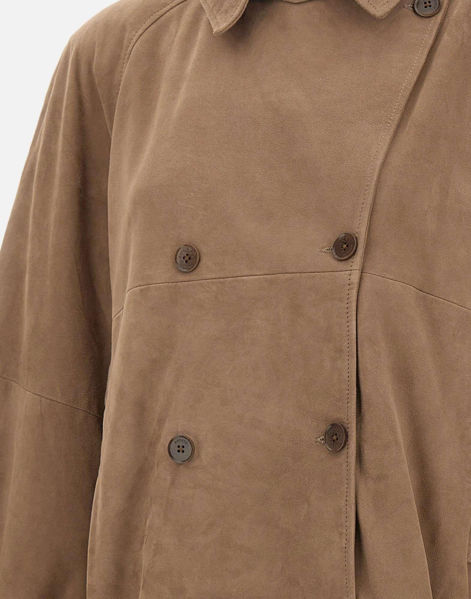 Giacca donna Rotate in morbida pelle scamosciata marrone, dalla silhouette over e dal fascino raffinato. Il design doppiopetto presenta ampio colletto che può essere indossato aperto o chiuso con patta, mentre la cintura coordinata valorizza il punto vita. Dotata di tasche laterali a filetto e completamente foderata, unisce eleganza e carattere in un capo d'ispirazione retrò ma dallo stile contemporaneo.