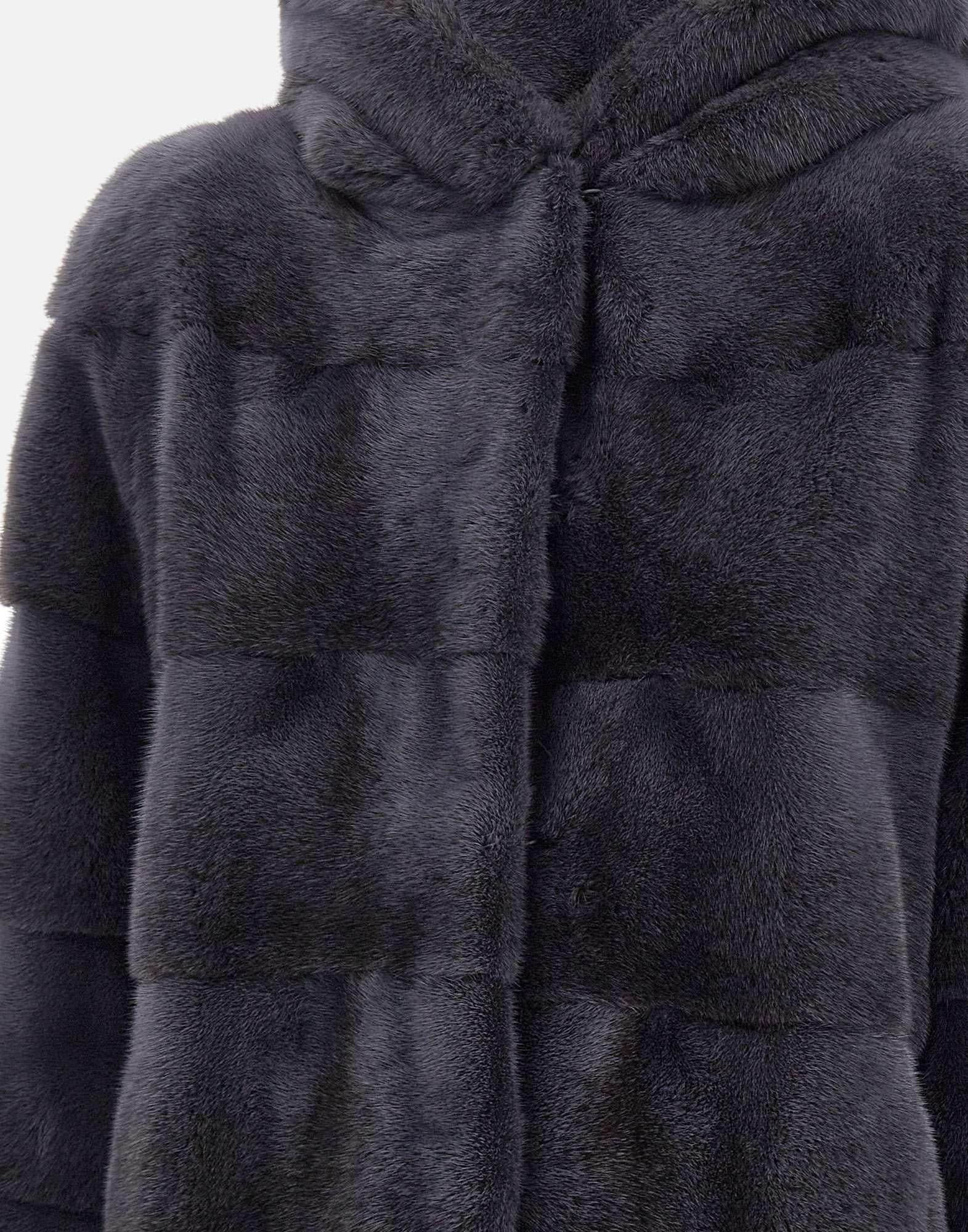 Pelliccia da donna Frame in visone grigio scuro, caratterizzata da una lavorazione a coste orizzontali che ne esalta l’eleganza e la texture morbida. Il design dalla lunghezza media avvolge con raffinatezza, mentre le due tasche laterali a fessura aggiungono praticità senza compromettere lo stile.