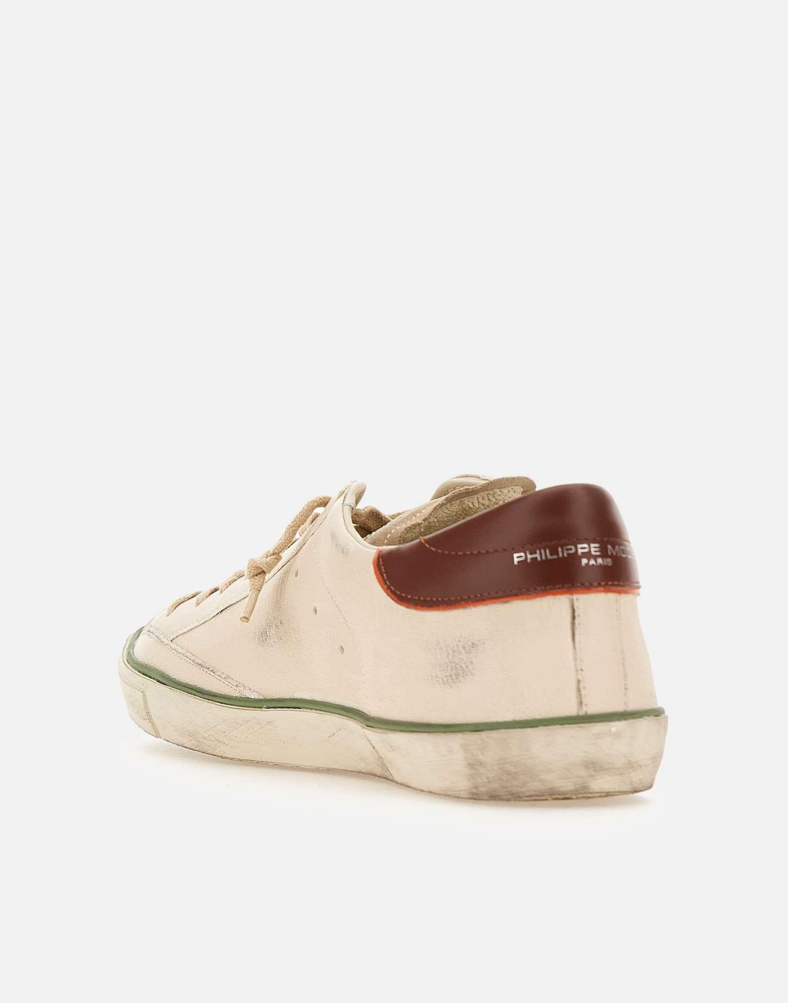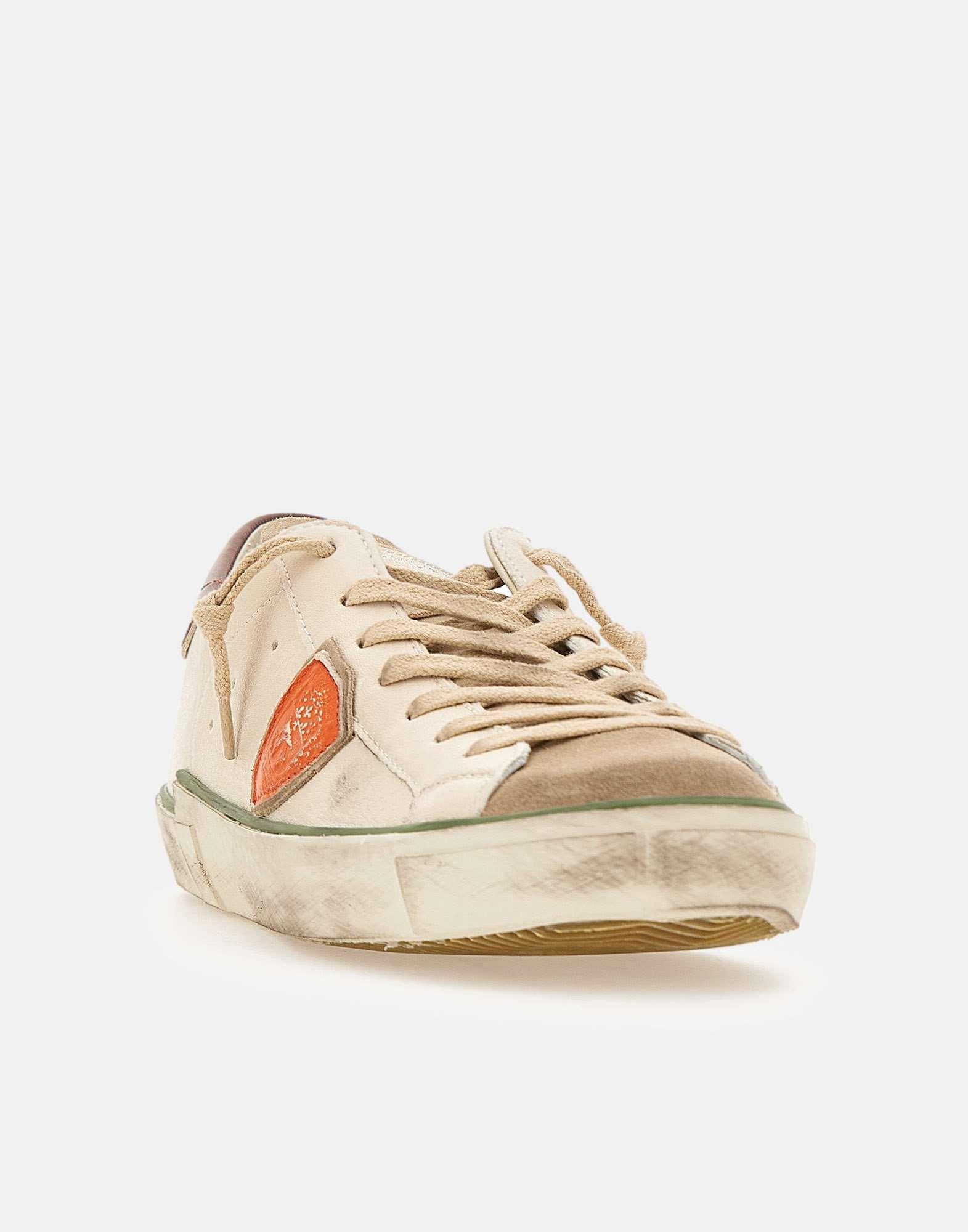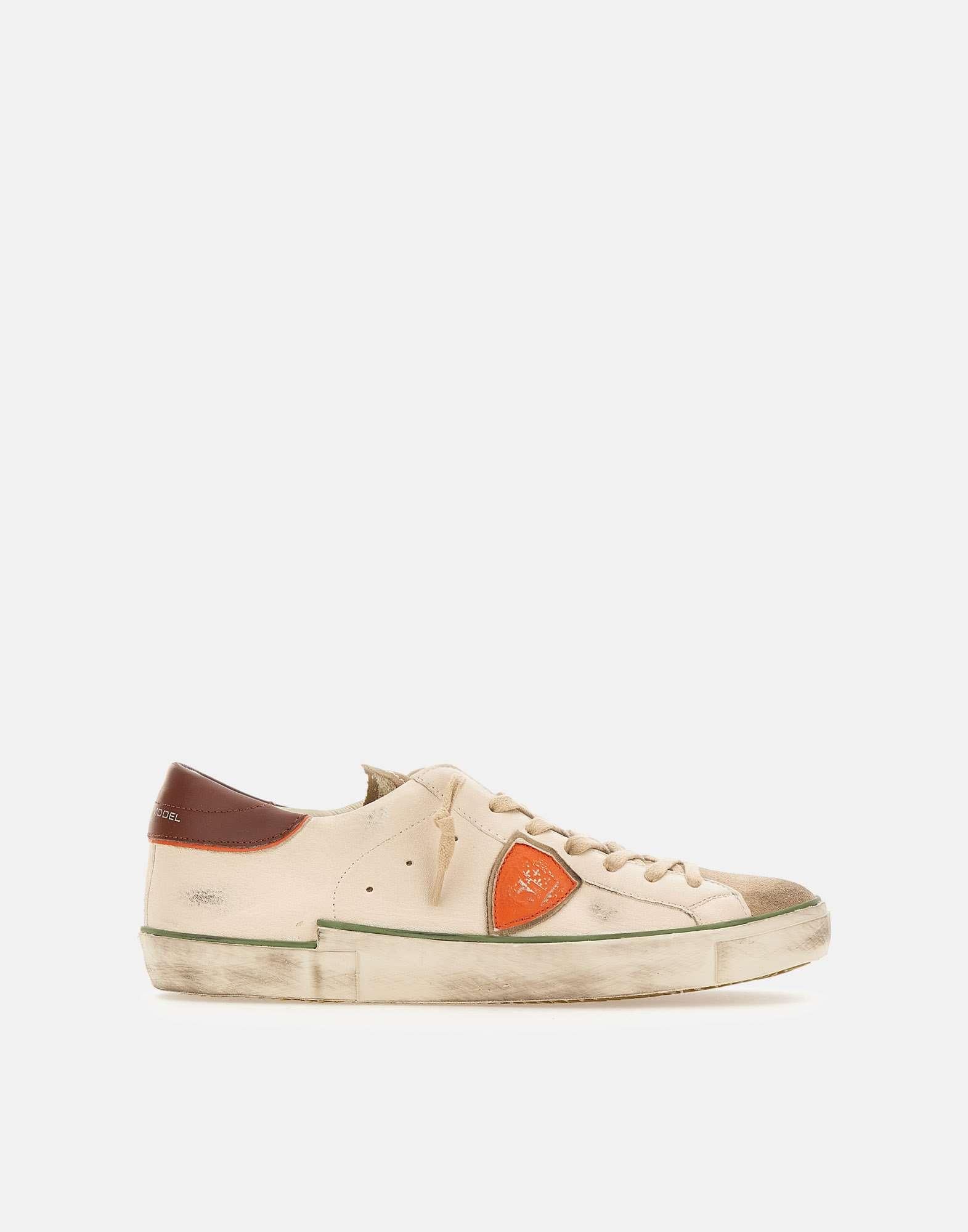 Sneakers uomo Philippe Model Paris "Prsx" multicolor nei toni del bianco, bordeaux e ghiaccio realizzate in pelle effetto used e suede. Design low-top con spoiler a contrasto, scudetto color arancio, lacci e dettagli volutamente vissuti per un look urbano e contemporaneo. Fodera interna in spugna di cotone per traspirabilità, soletta imbottita ed estraibile per un comfort personalizzato e suola in gomma con fasciatura artigianale irregolare, sporcature e bordino verde. Suola alta 2,5 cm. Custodia protettiva inclusa. Made in Italy. Calzata regolare.