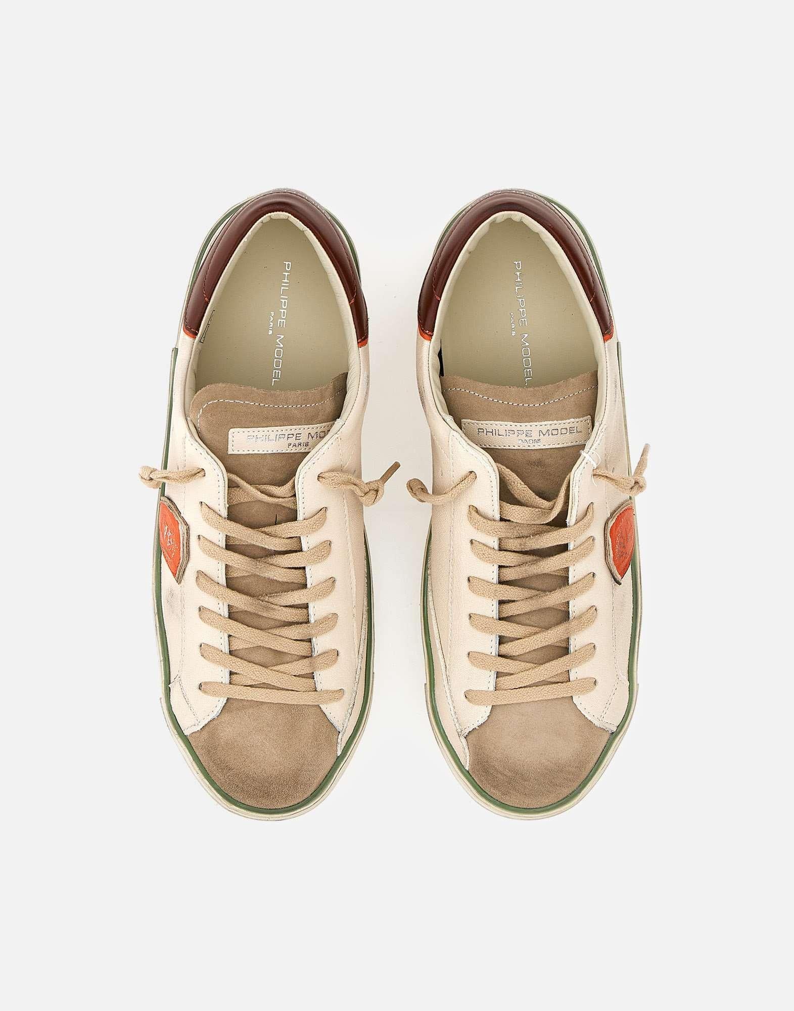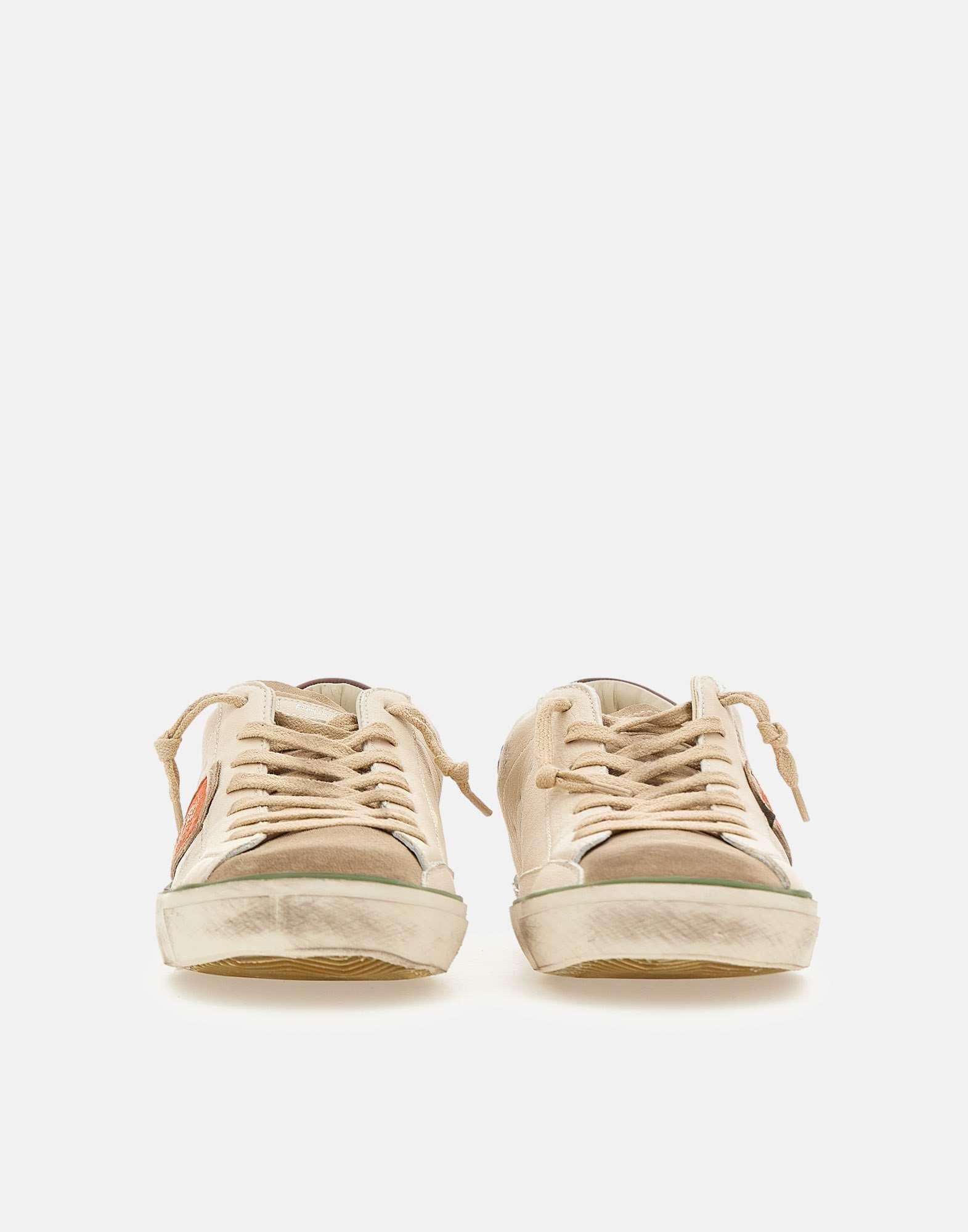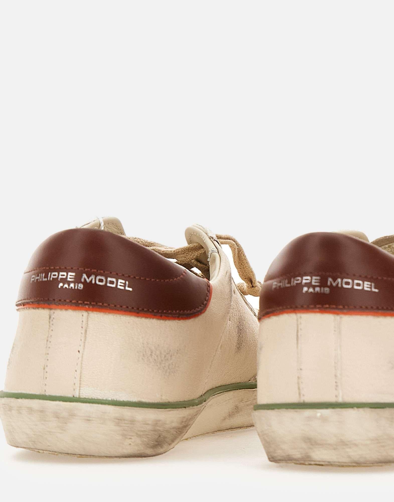 Sneakers uomo Philippe Model Paris "Prsx" multicolor nei toni del bianco, bordeaux e ghiaccio realizzate in pelle effetto used e suede. Design low-top con spoiler a contrasto, scudetto color arancio, lacci e dettagli volutamente vissuti per un look urbano e contemporaneo. Fodera interna in spugna di cotone per traspirabilità, soletta imbottita ed estraibile per un comfort personalizzato e suola in gomma con fasciatura artigianale irregolare, sporcature e bordino verde. Suola alta 2,5 cm. Custodia protettiva inclusa. Made in Italy. Calzata regolare.