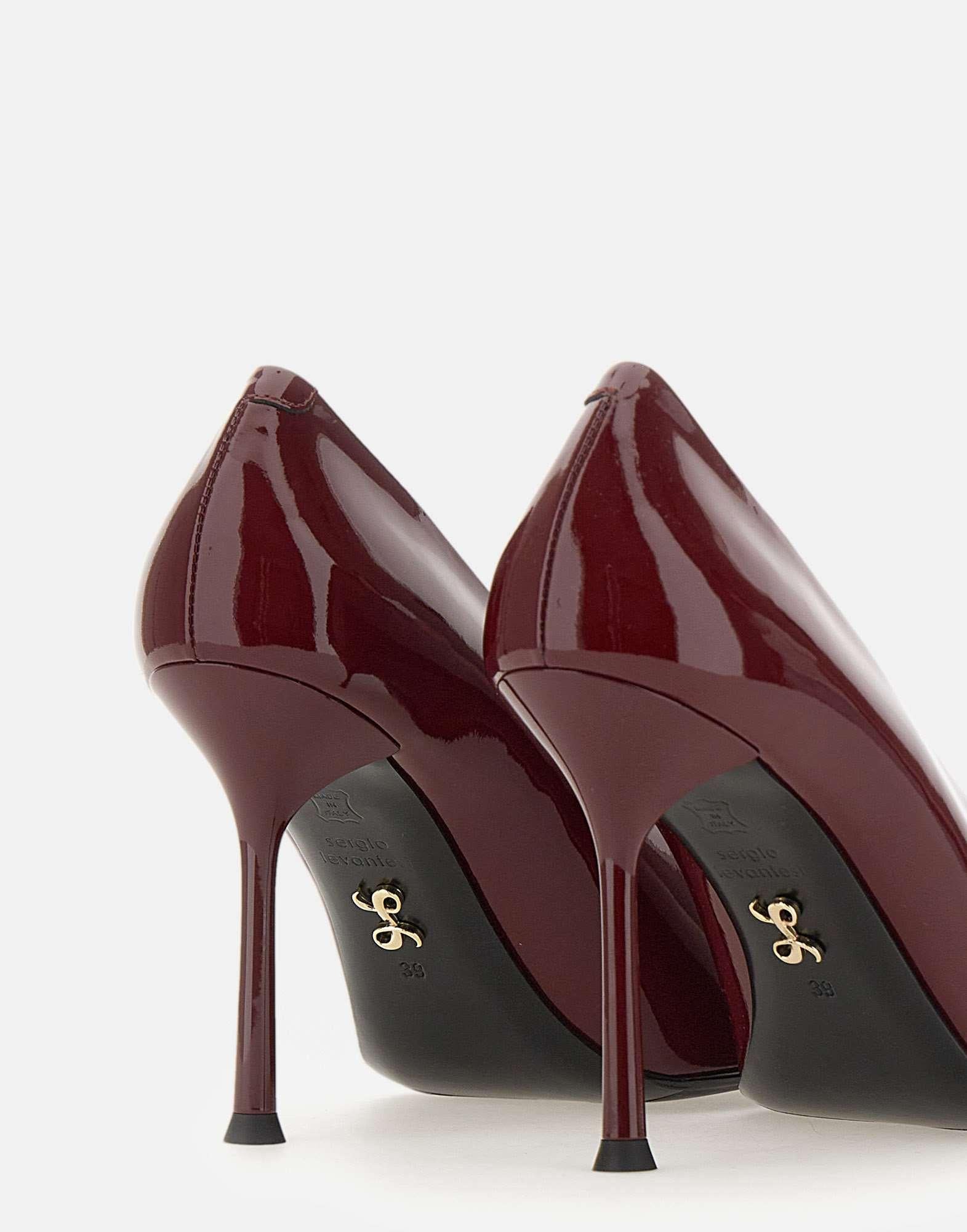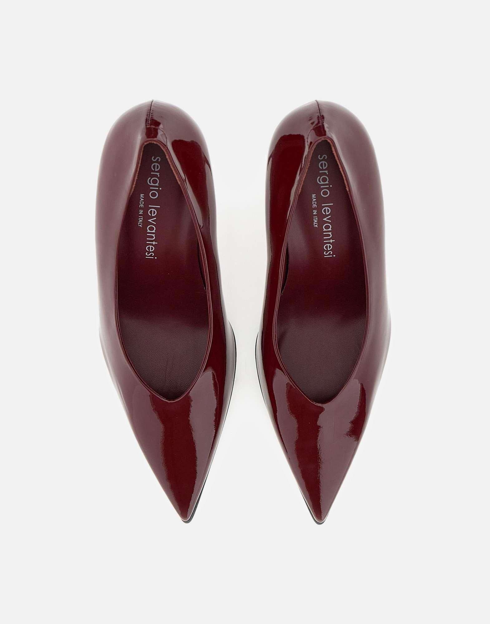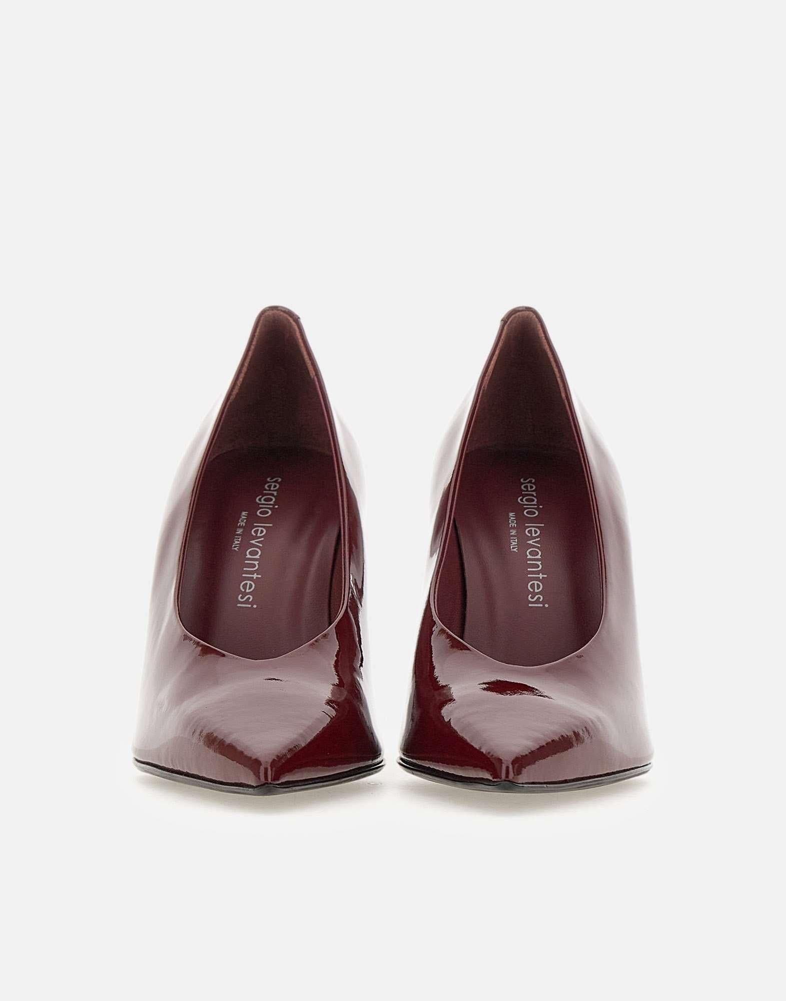 Décolleté Sergio Levantesi "Modern56" in vernice colore rosso, silhouette a punta affusolata e tacco di 10cm. Suola in cuoio e gomma per un perfetto equilibrio tra eleganza e stabilità con mini logo in metallo oro. Realizzate artigianalmente in Italia. Calzata regolare. Ideali per aggiungere un tocco sofisticato ai look da giorno e da sera.
