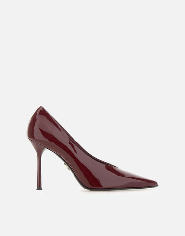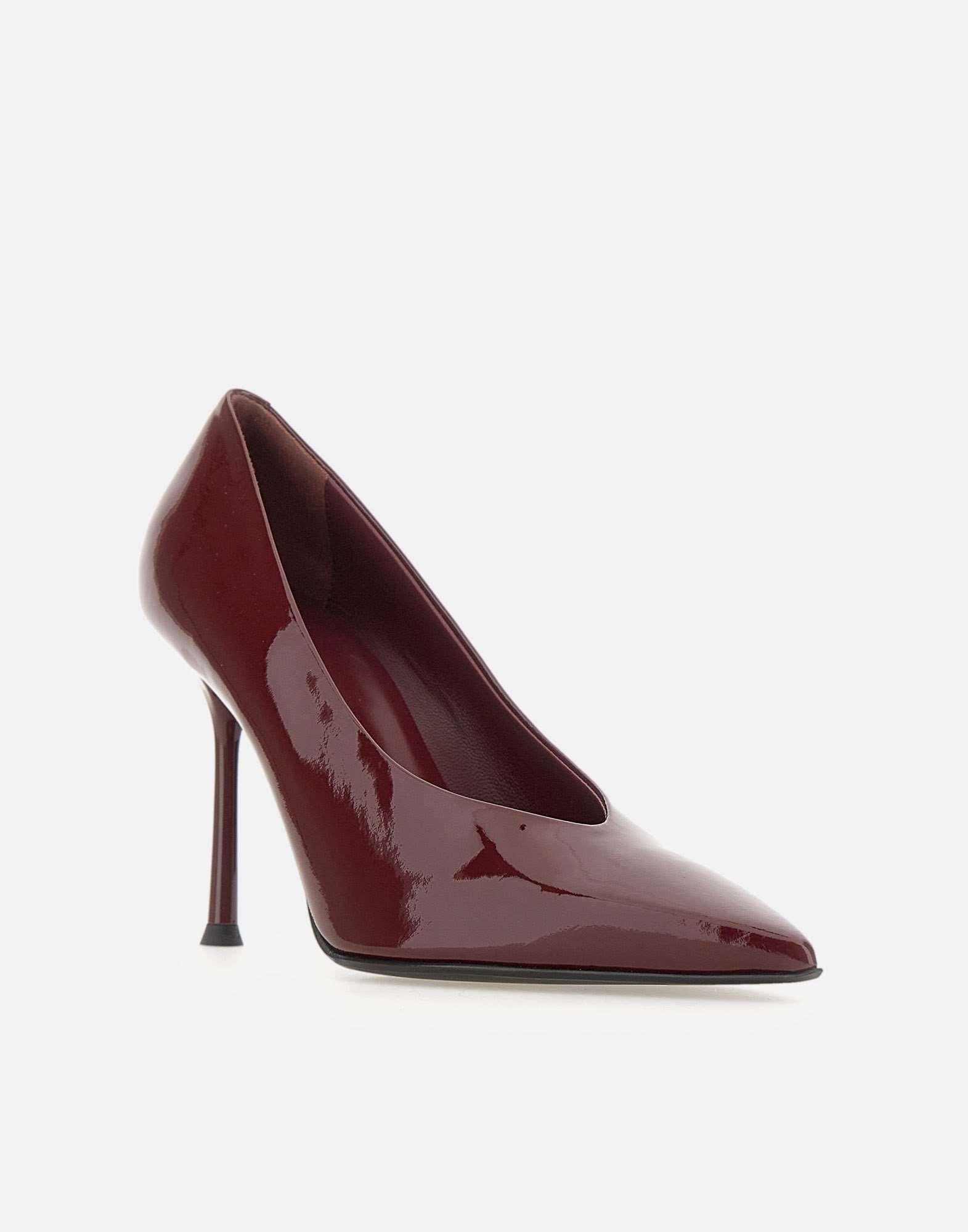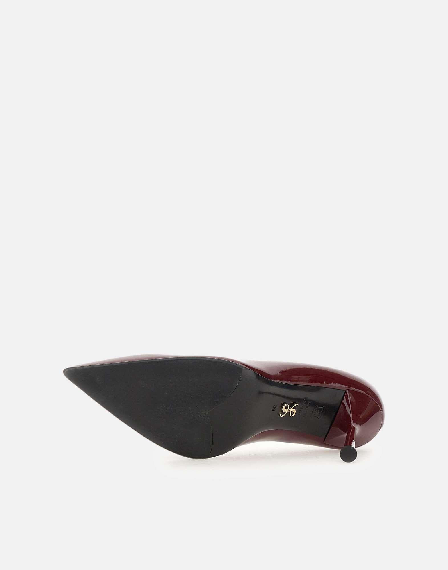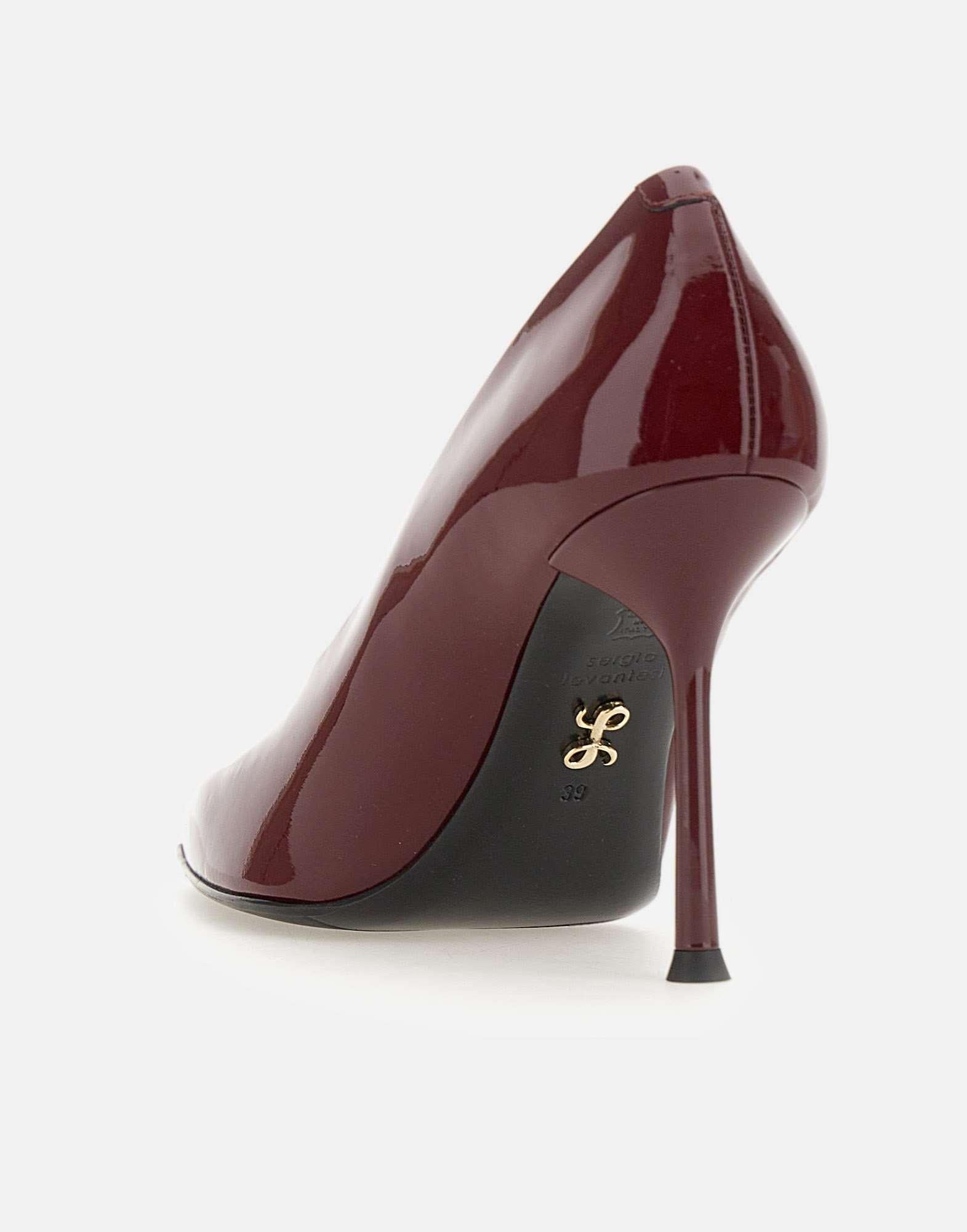 Décolleté Sergio Levantesi "Modern56" in vernice colore rosso, silhouette a punta affusolata e tacco di 10cm. Suola in cuoio e gomma per un perfetto equilibrio tra eleganza e stabilità con mini logo in metallo oro. Realizzate artigianalmente in Italia. Calzata regolare. Ideali per aggiungere un tocco sofisticato ai look da giorno e da sera.