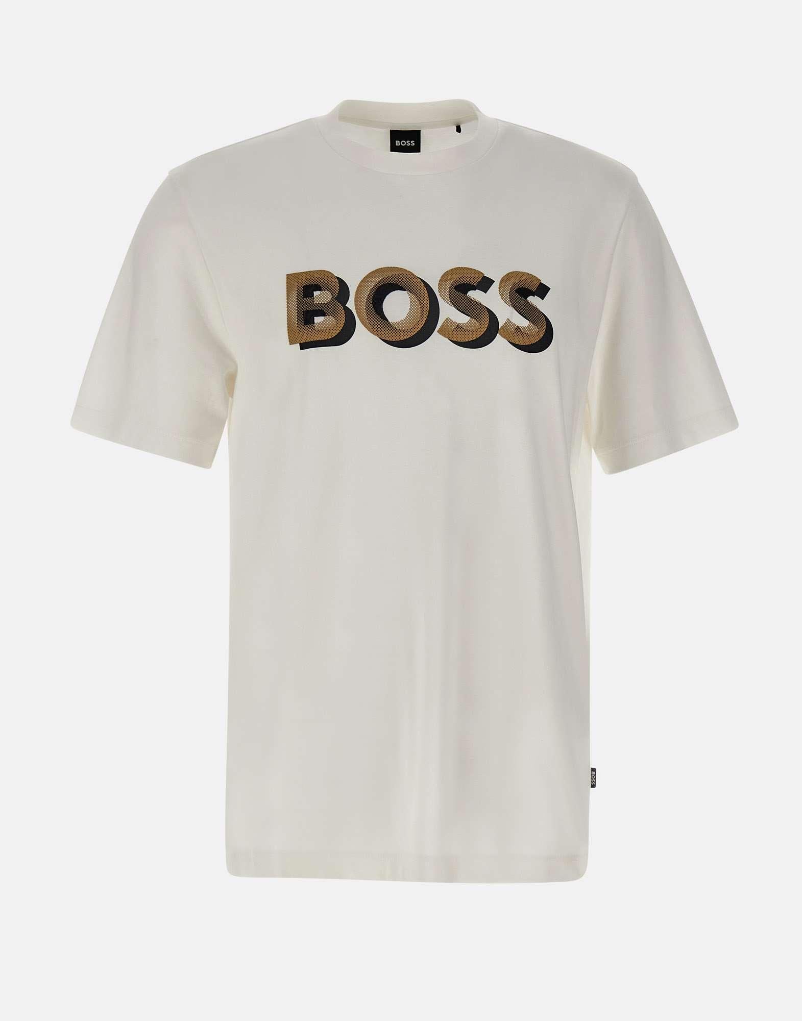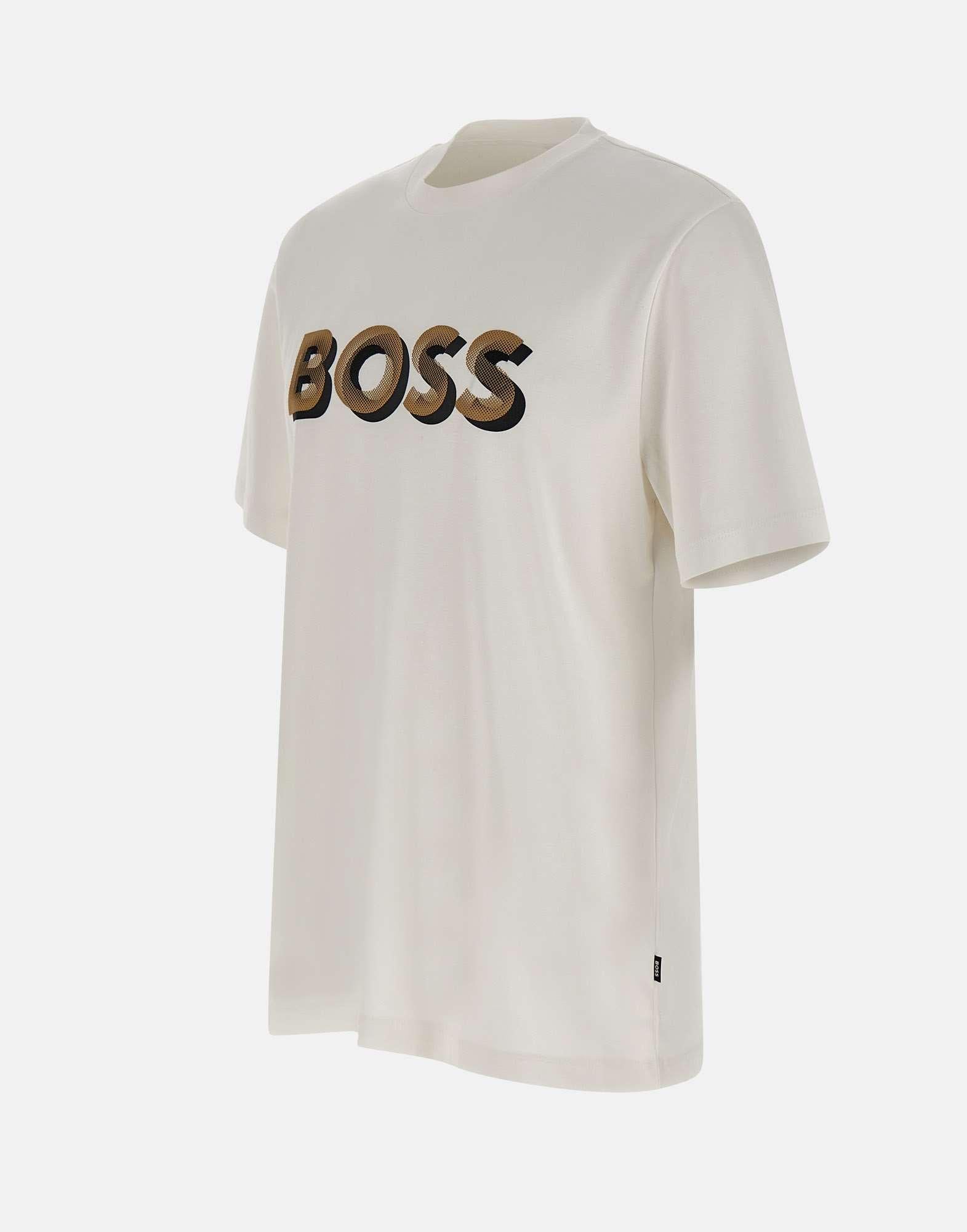 T-shirt uomo Boss "H-Thompson" realizzata in cotone mercerizzato bianco, dal tocco morbido e luminoso. Modello a maniche corte con girocollo classico e grafica con logo a contrasto sul davanti. Un capo essenziale dal design raffinato e contemporaneo. Regular fit.