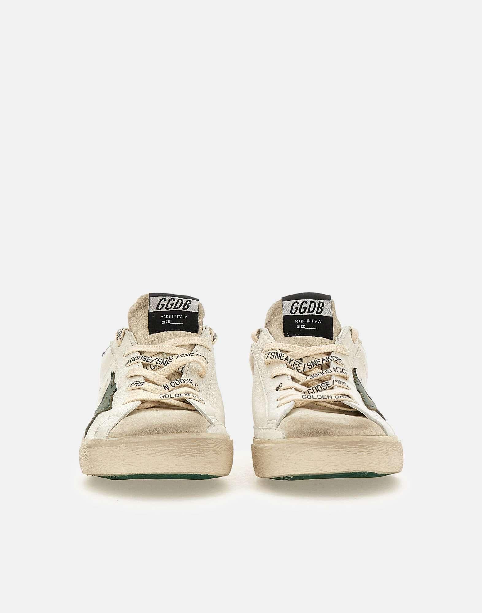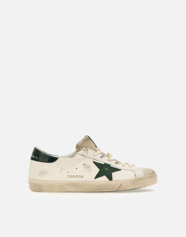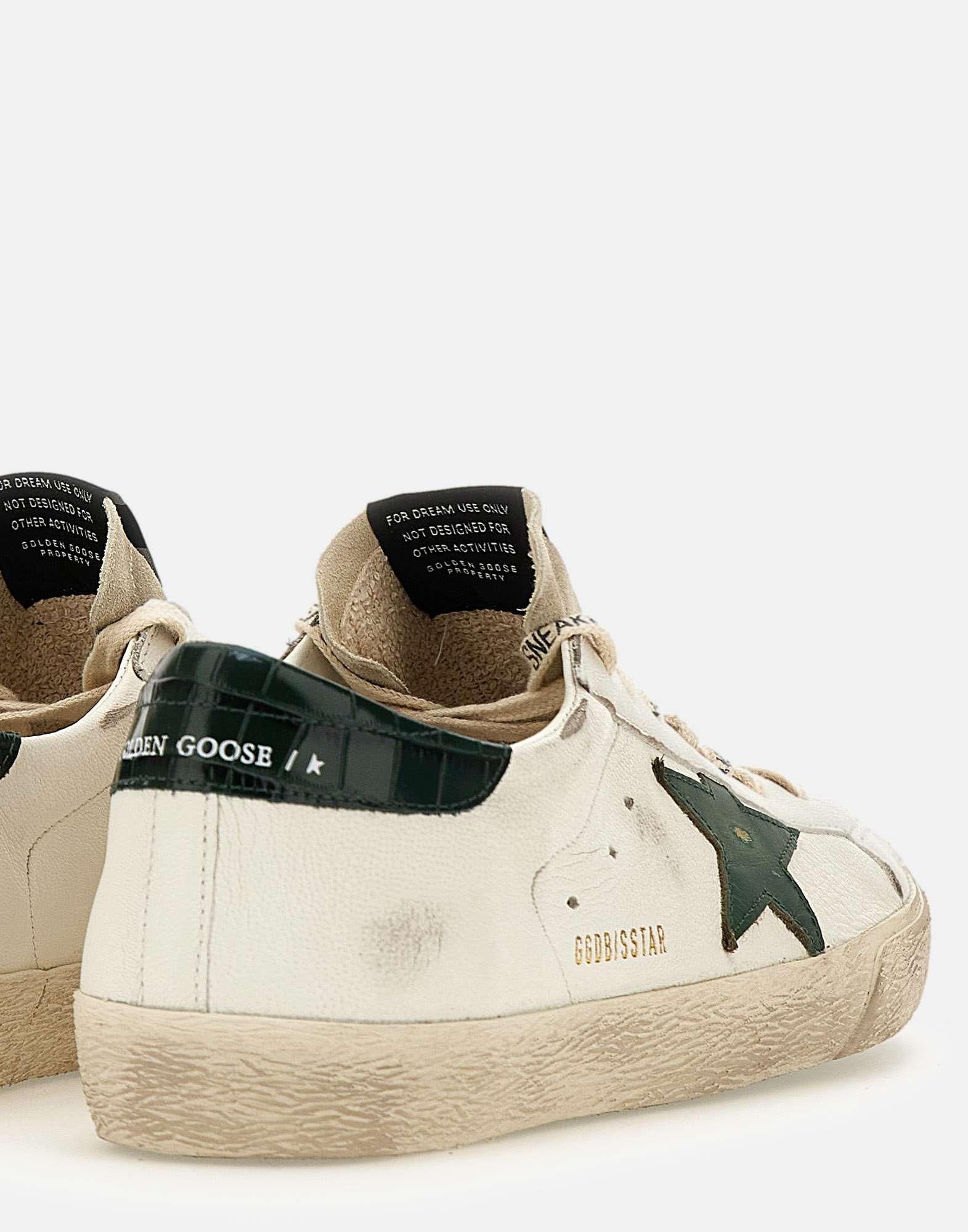 Sneakers uomo Golden Goose "Superstar Classic with list" in pelle liscia effetto used, color panna, logo sulla linguetta scamosciata, talloncino sul retro color verde con trama coccodrillo, iconica stella laterale in pelle color verde, lacci piatti in cotone logati, fori laterali per la traspirazione, suola in gomma altezza 2,5 cm. Made in Italy. Calzata regolare. Per chi solitamente opta per il mezzo numero è consigliabile salire di una taglia poiché il brand non utilizza mezze misure.
