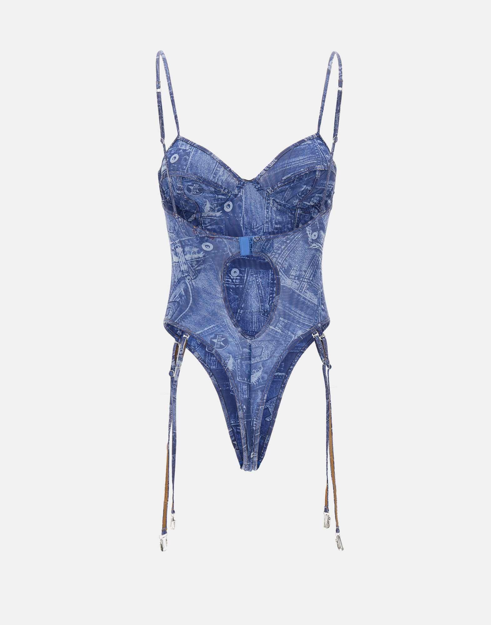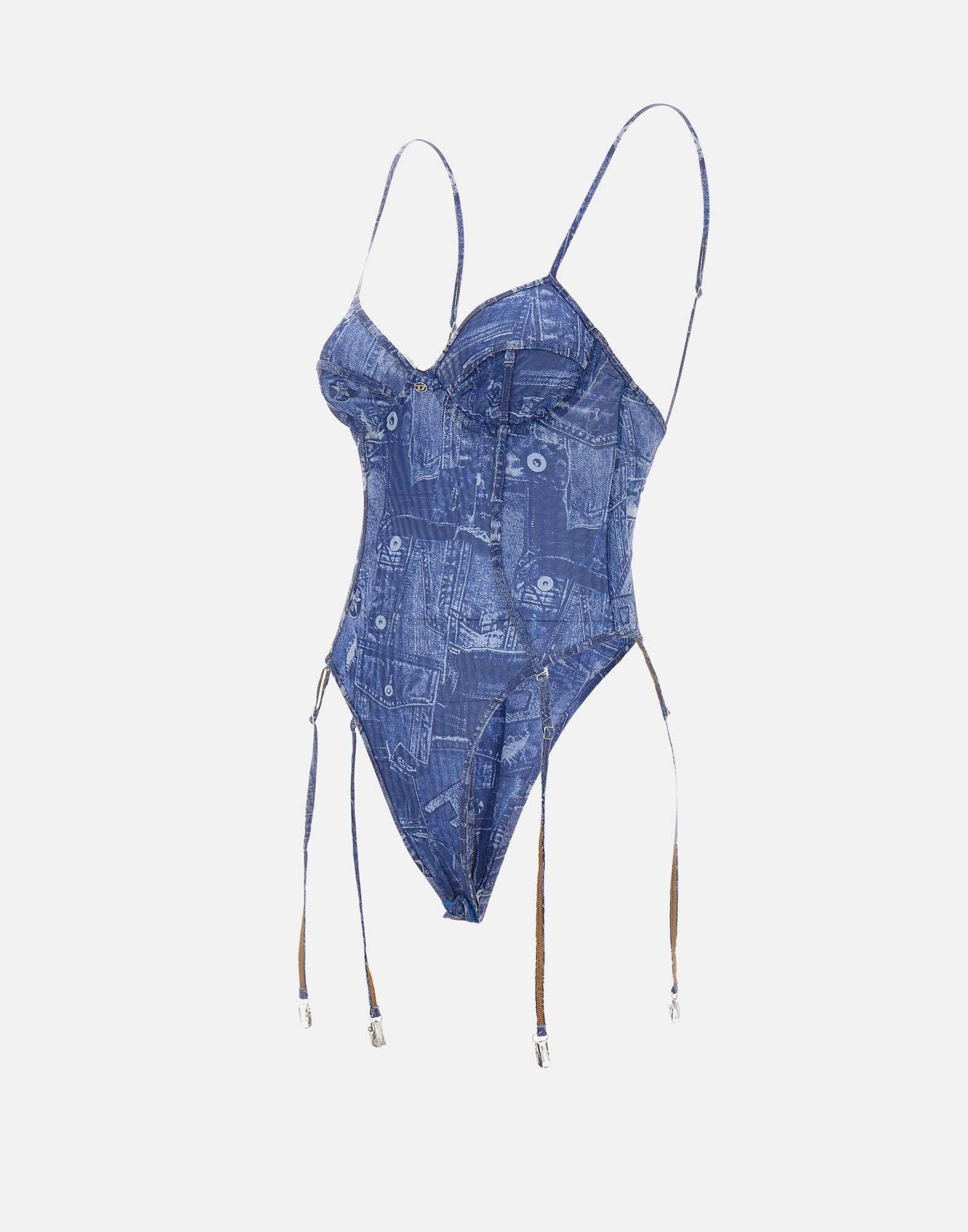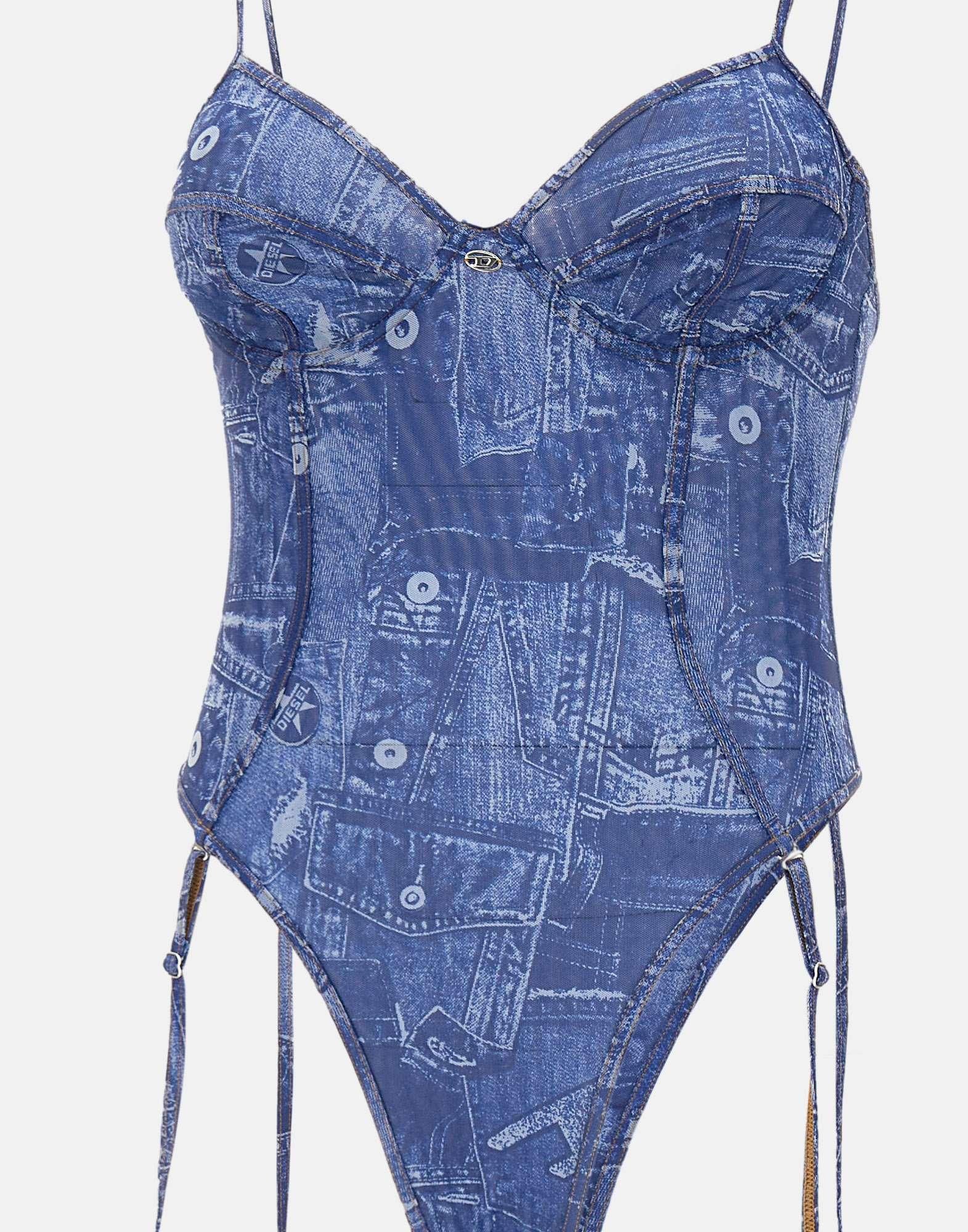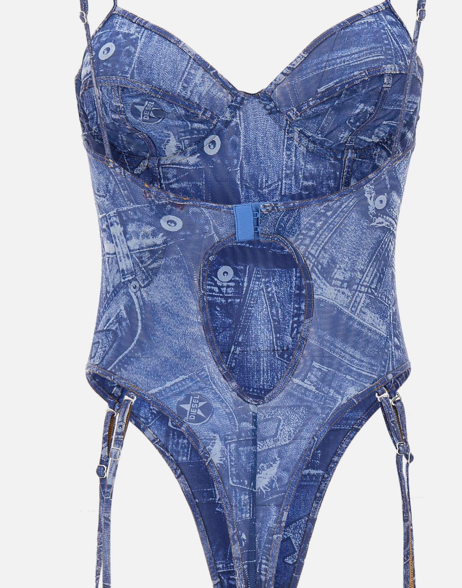 Body donna Diesel "Bridget-Dnm" in tessuto blu trasparente con stampa effetto denim, dal carattere audace e seducente. Dotato di spalline regolabili e ferretto interno per un perfetto sostegno del seno, presenta impunture frontali e logo metallico Oval D al centro dello scollo. Sul retro, un’apertura circolare sulla schiena e la chiusura con fermagli completano il design con un tocco grafico e moderno.